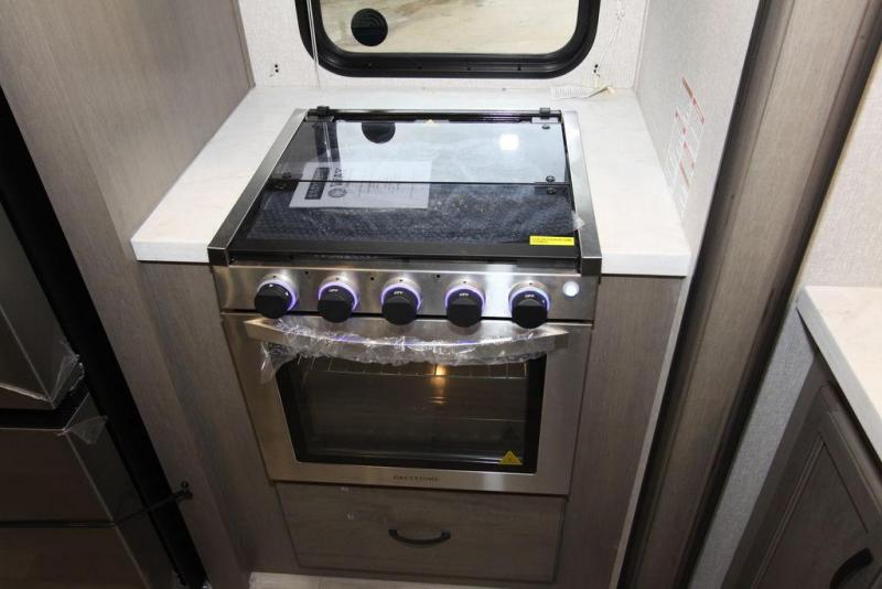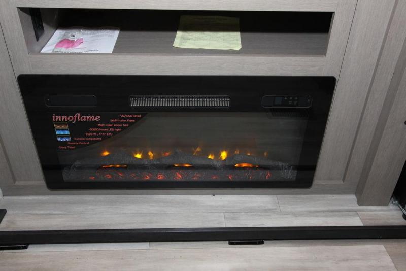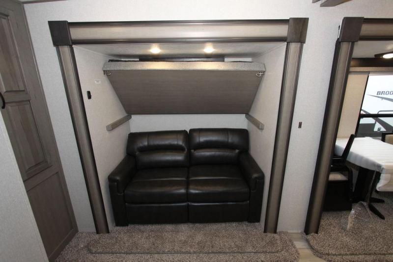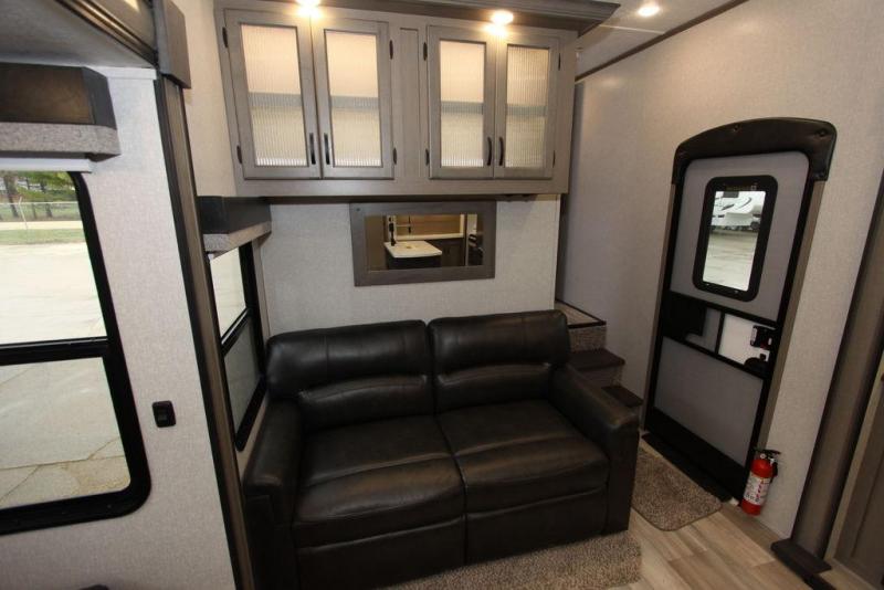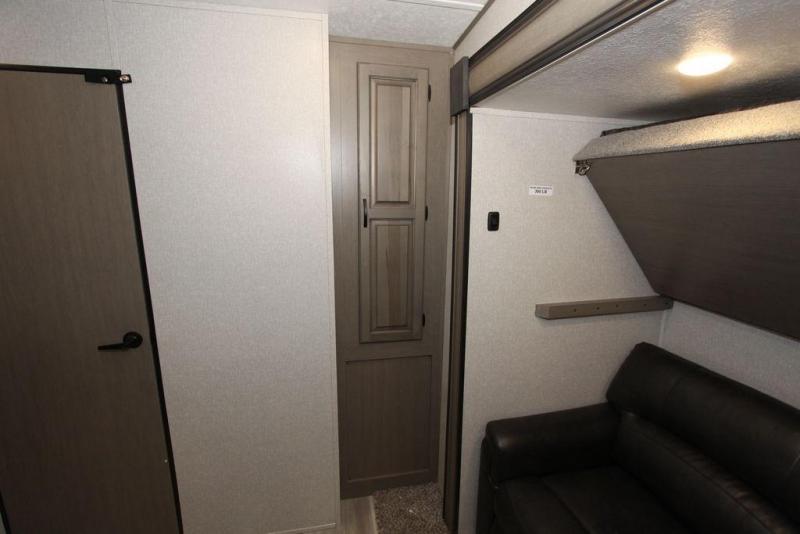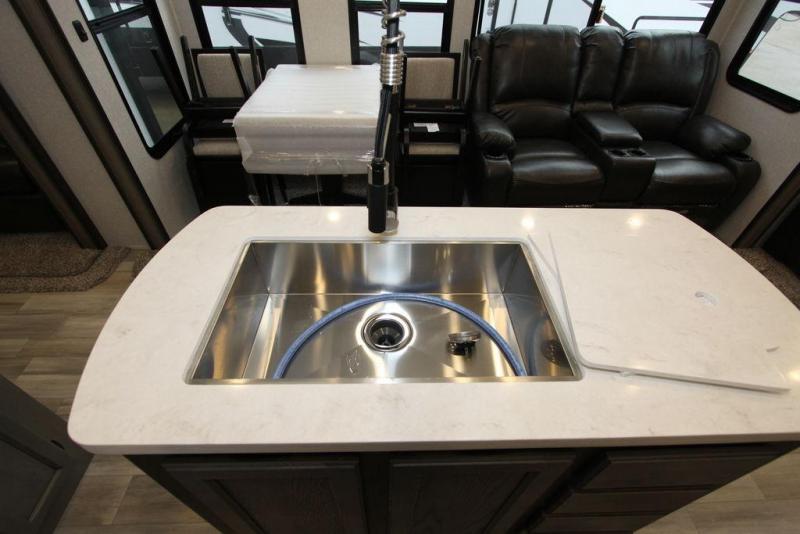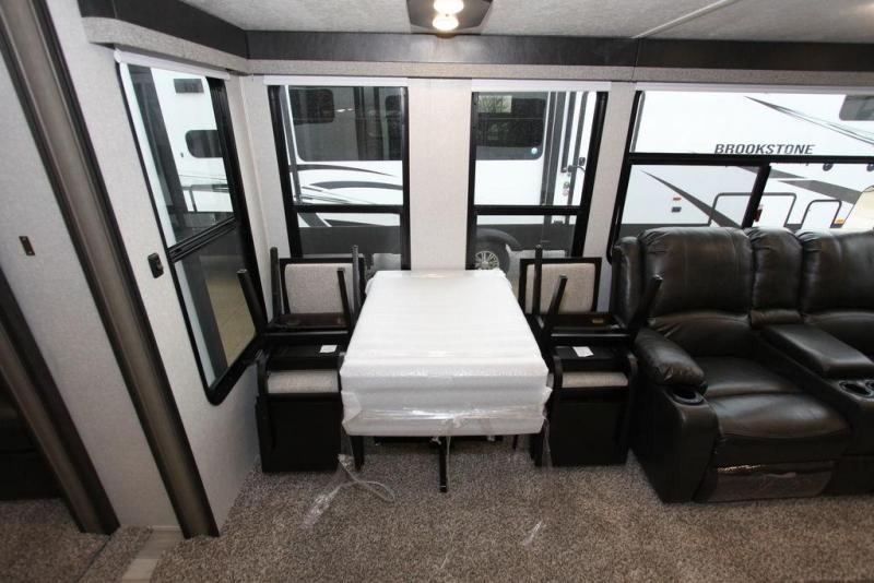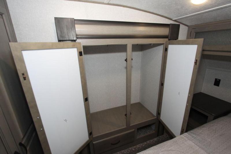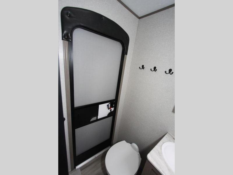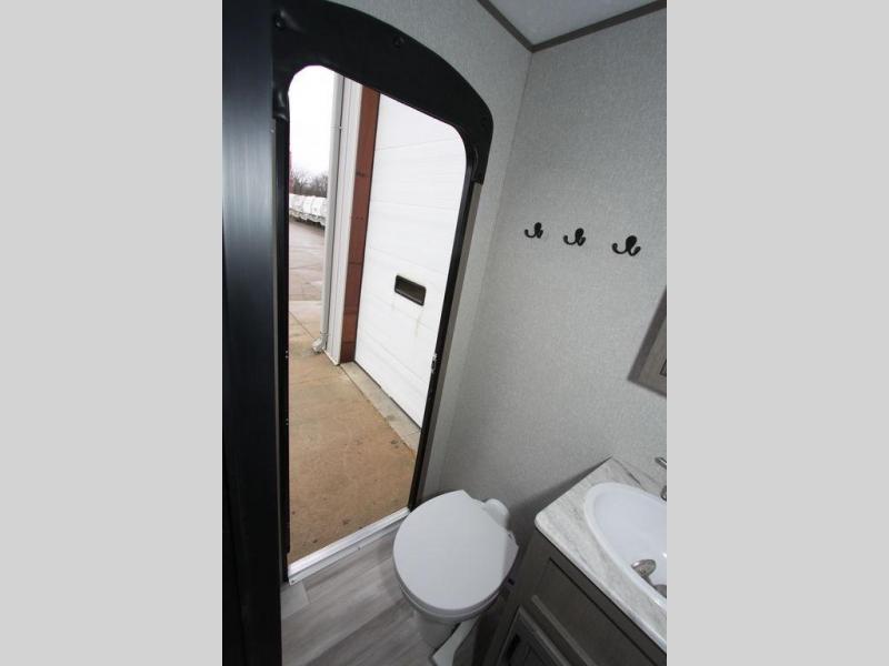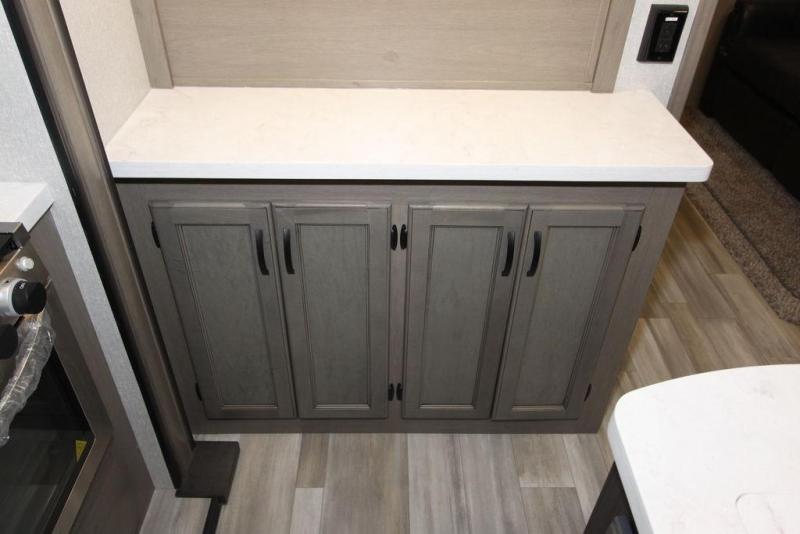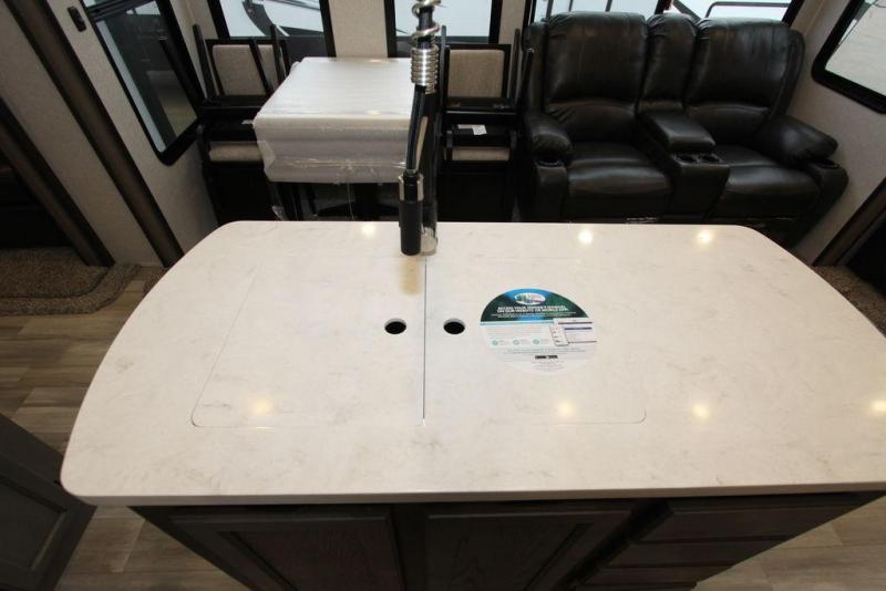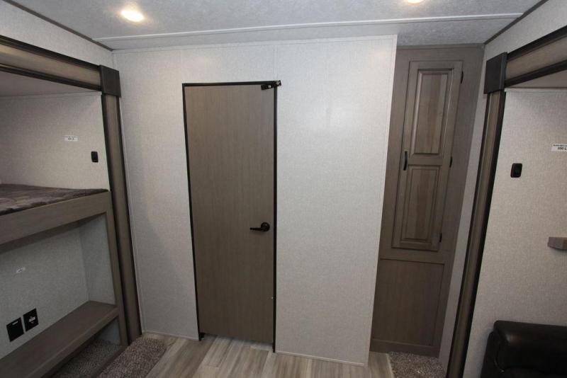Camping with a large group of friends or family is easier than ever in this roomy fifth wheel for seven to eight. There are two full baths, with your guests having their own bath with its own exterior entry door in in the bunkhouse. How convenient! The chef of your group will find all they need in the interior kitchen, or they can cook outdoor on the outside kitchen. Inside, there is comfortable seating spaces on the sofa, the theatre seating, and the free-standing table, plus you can add the optional 50" LED TV to the entertainment center for even more fun. Having your own bedroom to retreat to each night will be much appreciated. There is a queen bed, a wardrobe slide out, dual nightstands, and even washer and dryer prep!