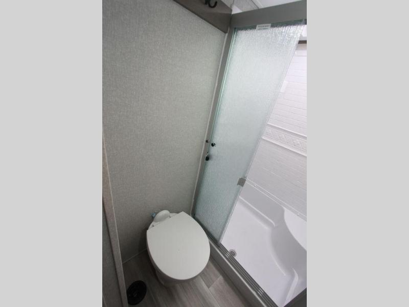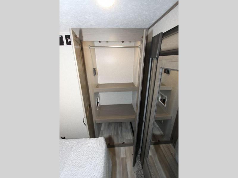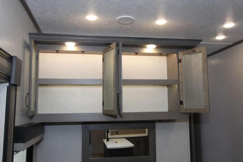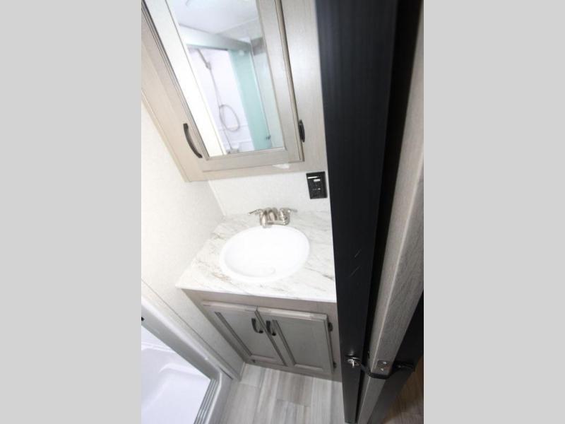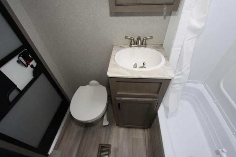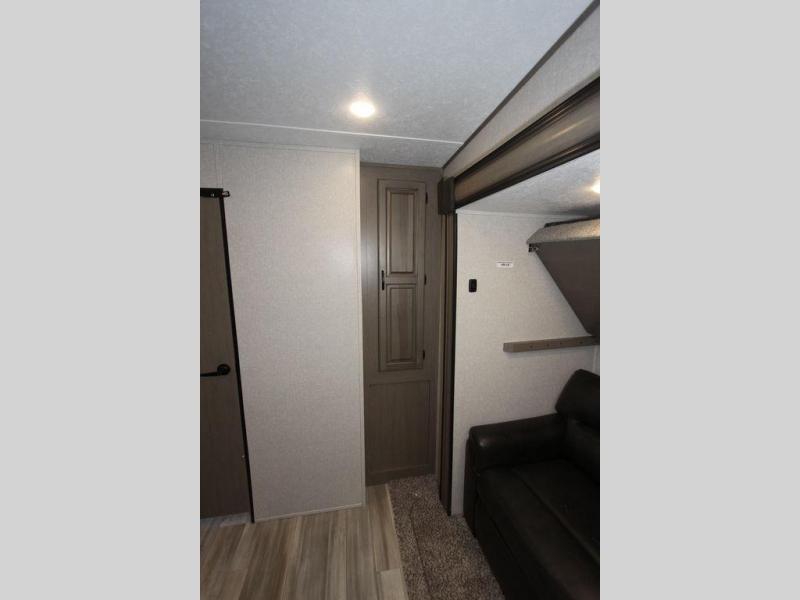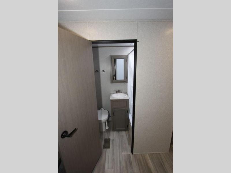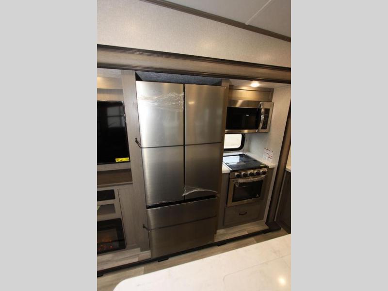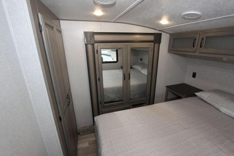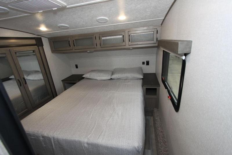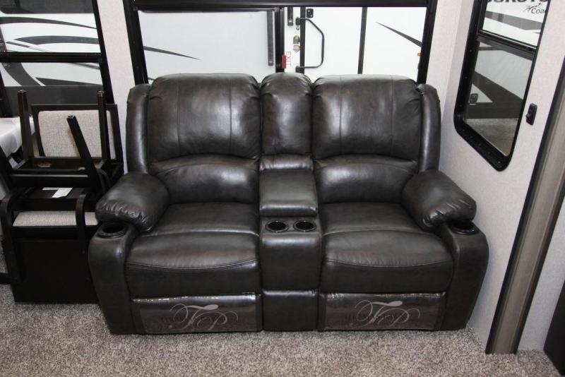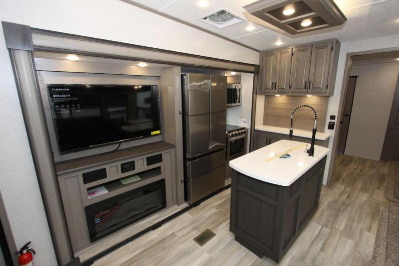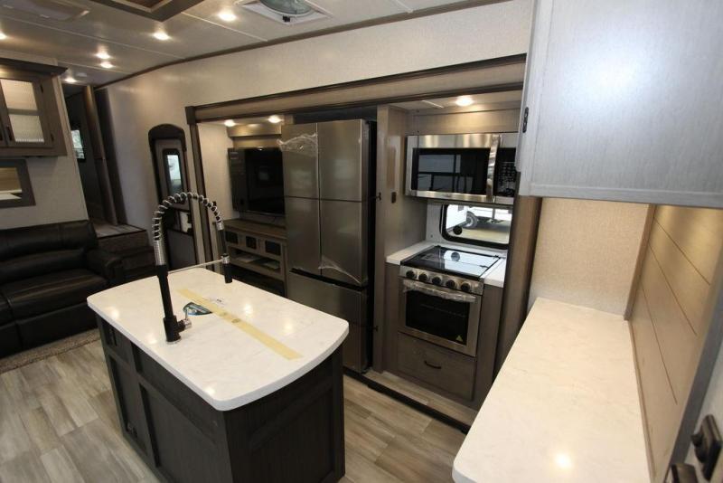 Camping with a large group of friends or family is easier than ever in this roomy fifth wheel for seven to eight. There are two full baths, with your guests having their own bath with its own exterior entry door in in the bunkhouse. How convenient! The chef of your group will find all they need in the interior kitchen, or they can cook outdoor on the outside kitchen. Inside, there is comfortable seating spaces on the sofa, the theatre seating, and the free-standing table, plus you can add the optional 50" LED TV to the entertainment center for even more fun. Having your own bedroom to retreat to each night will be much appreciated. There is a queen bed, a wardrobe slide out, dual nightstands, and even washer and dryer prep!