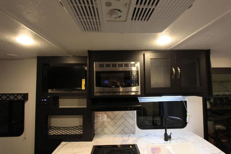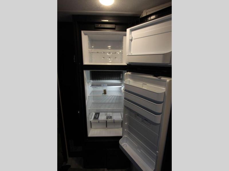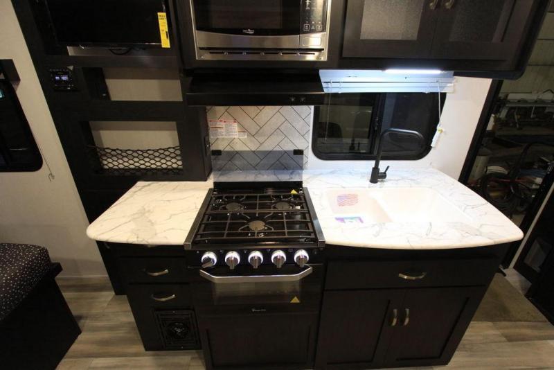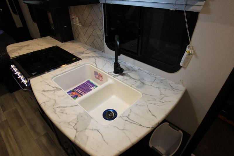 This is the perfect couple's trailer to take to the lake every other weekend. You will enjoy your own queen bed up front that includes vaulted under-bed storage for your luggage. The sofa slide out with a free-standing table provides a place to relax and dine together, and if you have an overnight guest, they can sleep here. The chef can prepare meals on the three burner cooktop or in the microwave oven, and there is a dual basin American stonecast sink for easy clean up. This model also includes a full bath with a linen closet for clean towels, and a 32" radius shower with a skylight for more standing space.
