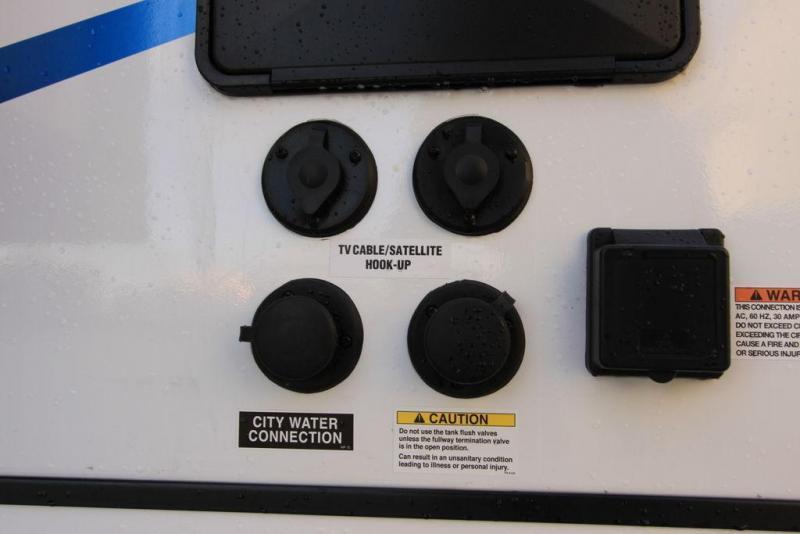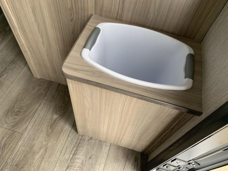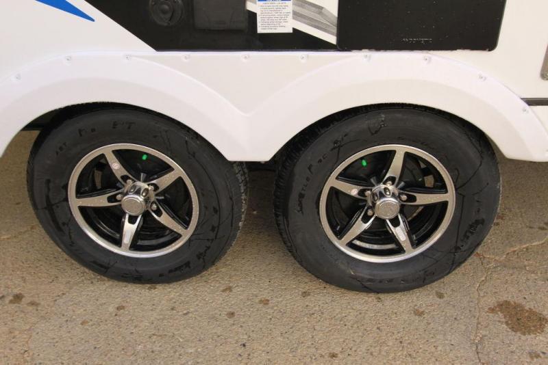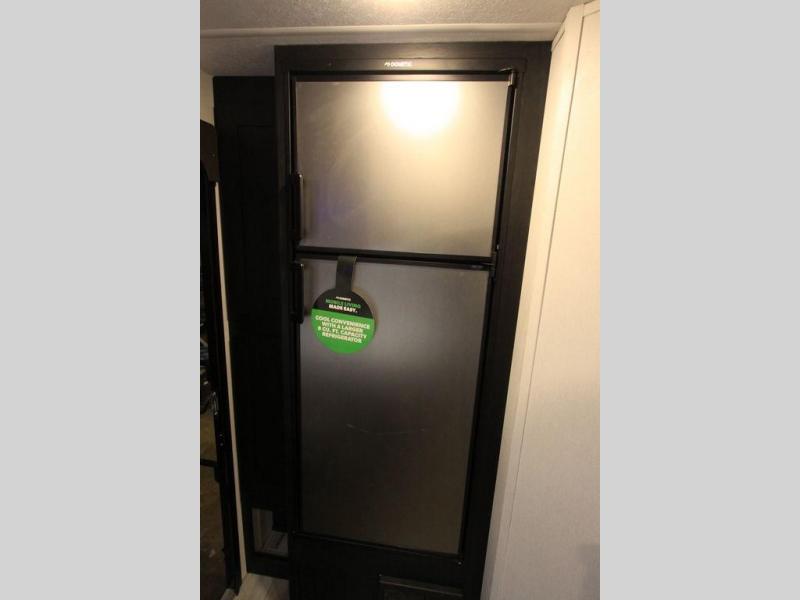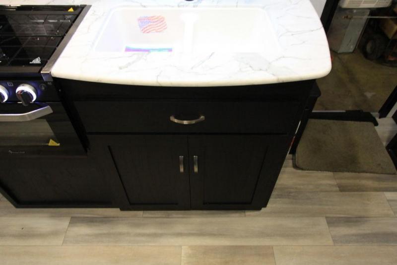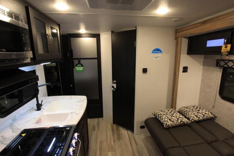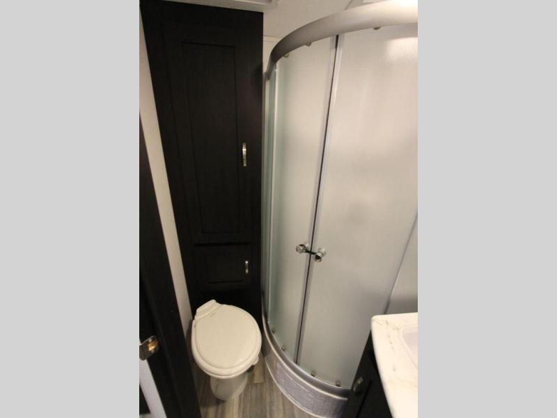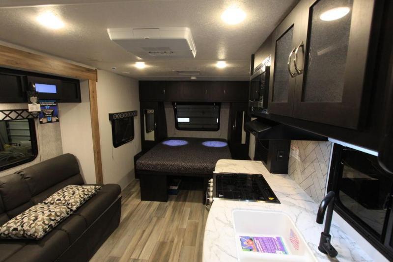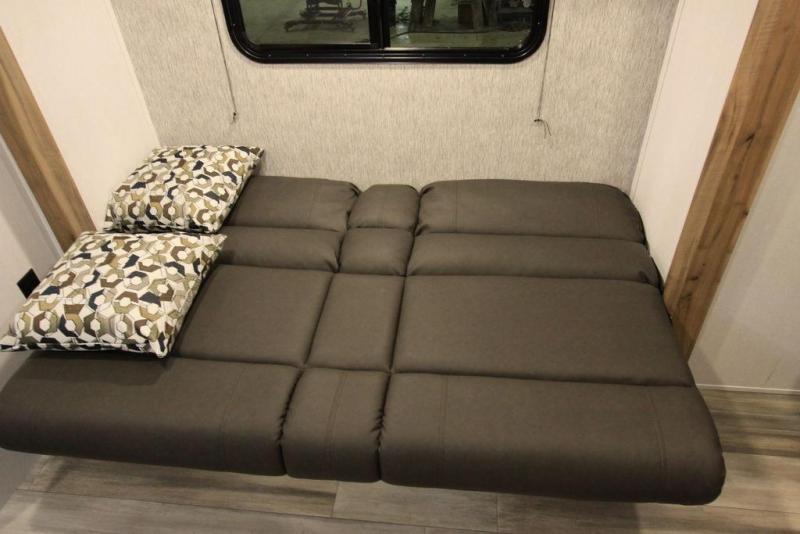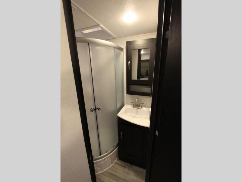 This is the perfect couple's trailer to take to the lake every other weekend. You will enjoy your own queen bed up front that includes vaulted under-bed storage for your luggage. The sofa slide out with a free-standing table provides a place to relax and dine together, and if you have an overnight guest, they can sleep here. The chef can prepare meals on the three burner cooktop or in the microwave oven, and there is a dual basin American stonecast sink for easy clean up. This model also includes a full bath with a linen closet for clean towels, and a 32" radius shower with a skylight for more standing space.