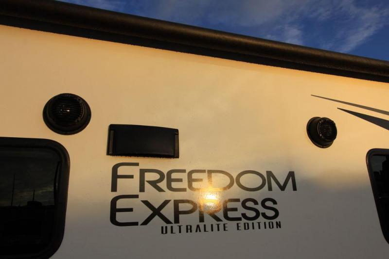 With any Freedom Express Ultra Lite travel trailer by Coachmen you will appreciate quality construction materials, such as vacuum bonded walls with Azdel composite, a 3/4 gel coated fiberglass cap with an automotive glass windshield, and a heated enclosed underbelly. Each model also features Tufflex PVC roofing, front diamond plate, and E-Z Lube axles for smooth towing. You'll find Carefree flooring indoors, as well as night shades, a dual basin American stonecast sink, and hidden hinge cabinetry. The power tongue jack included with the Ultra Lite Express Pack will make set-up a breeze, and each model includes back-up camera prep and they are Freedom solar ready if you plan to go off-grid. Enjoy lightweight camping with a Freedom Express Ultra Lite travel trailer today!