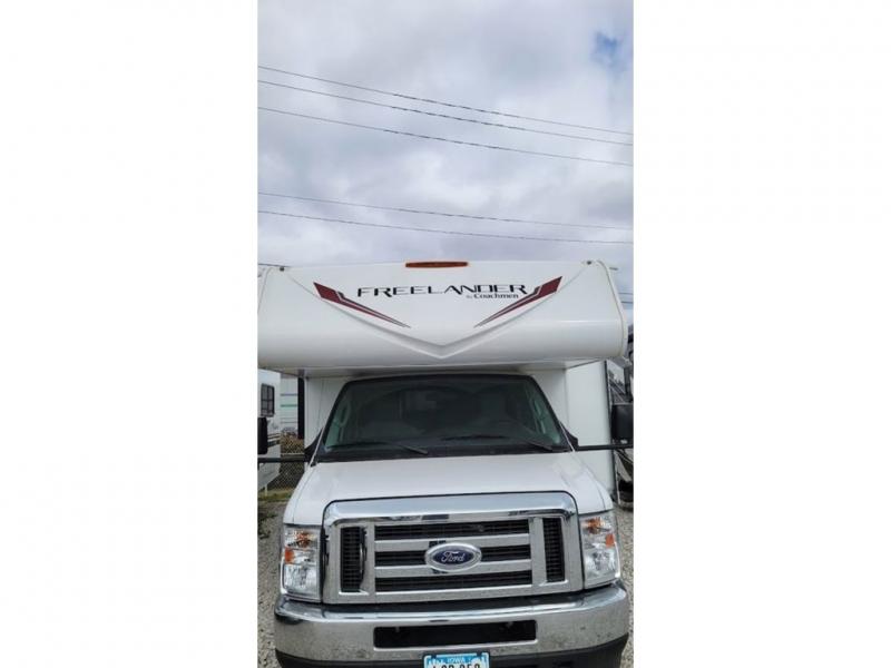 With the Coachmen Freelander motorhome you will get a reliable and quality Class C gasoline coach that contains more factory-installed features than anyone else. The Freelander features Azdel composite sidewall substrate and a fiberglass exterior to keep the entire structure lightweight. You will love the interior with its hardwood cabinet doors and drawer fronts, pleated night shades, a skylight over the shower, plus a systems command center to control your units functions in one convenient location. You can bring along all of your belongings with the roto-cast rear warehouse storage compartment, and the power awning includes vinyl weather guard to help protect from the elements, plus there are LED lights for an inviting outdoor living space.