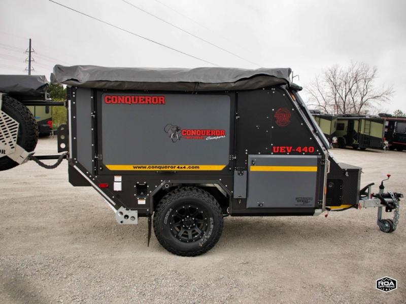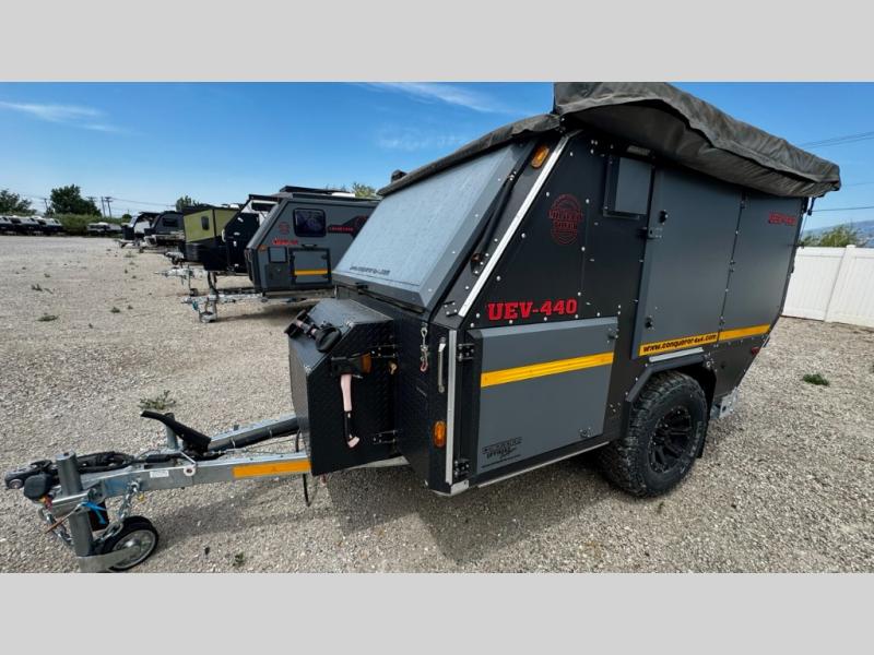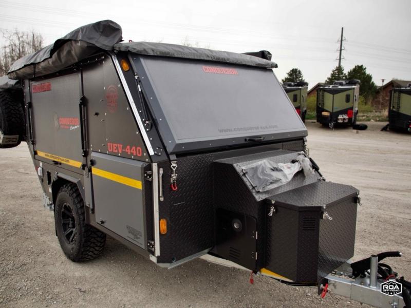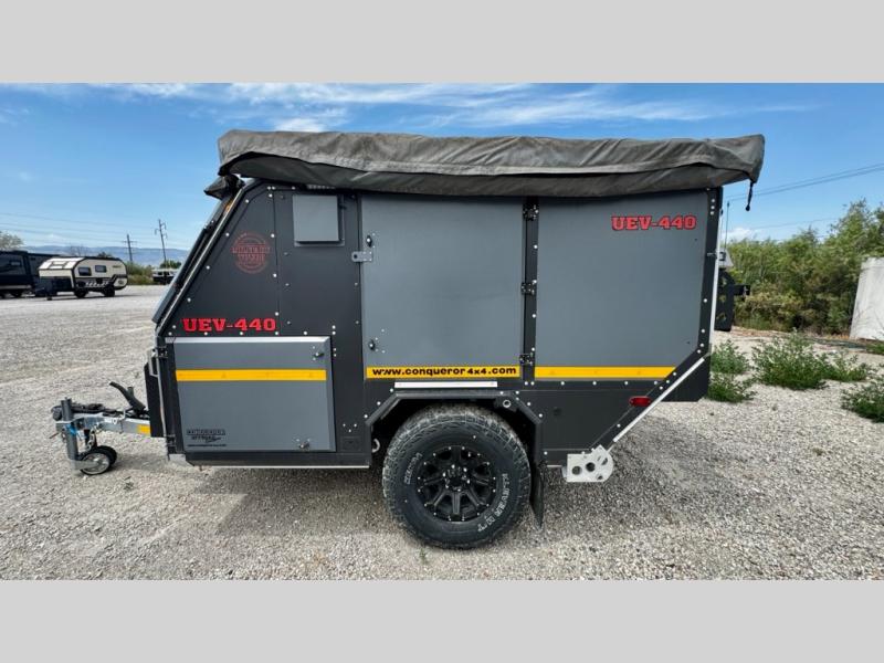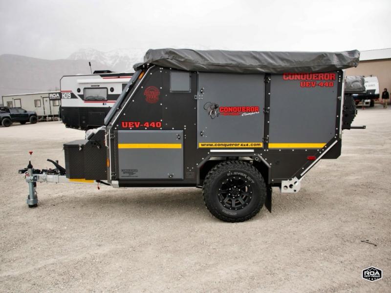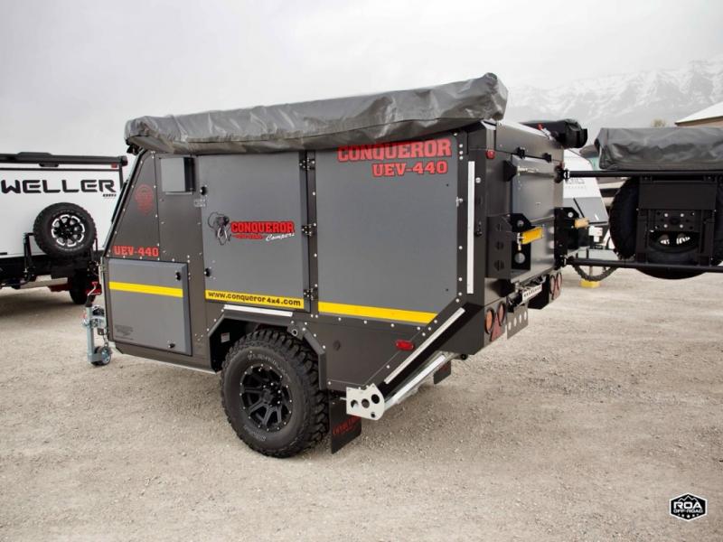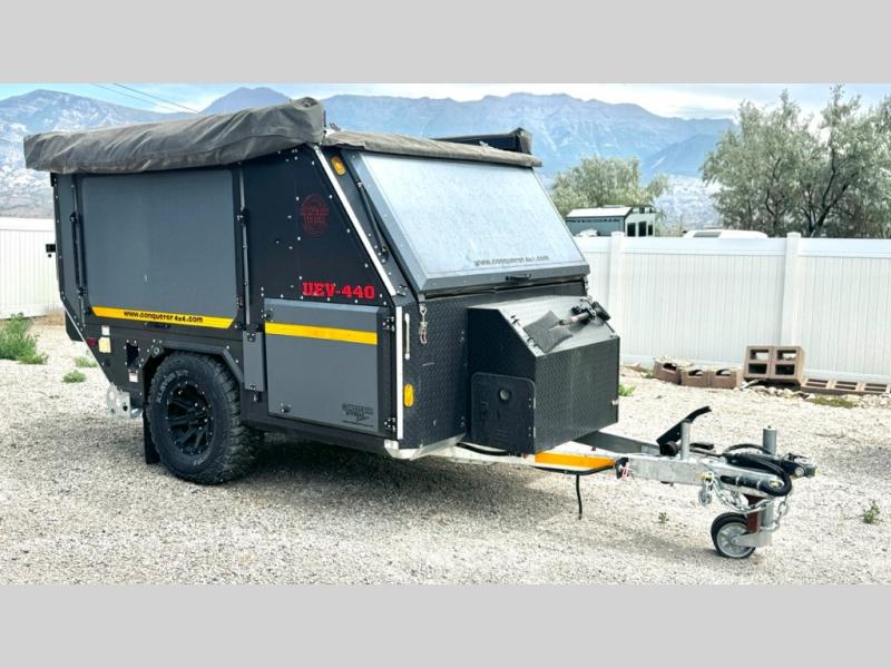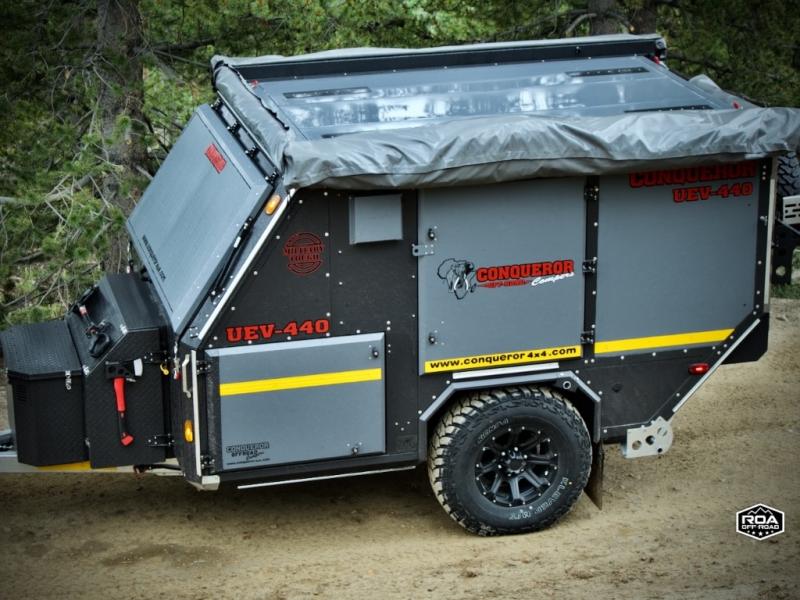 We love the 2022 Conqueror UEV-440. This off-road trailer was born in South Africa to handle all the craziest terrain on earth. Lightweight and nimble yet has tons of space to sleep 4, full outdoor kitchen, 38 gallons of water, 200 watts solar etc.What's my favorite part of the Conqueror UEV-440 off-road trailer?hmm, maybe the Airbag Suspension! This gives you 3 main benefits 1) Extremely smooth towing on & off-road 2) Level out the camper with the touch of a button 3) Utilize the on-board air compressor to air up tires and toys!Or Maybe it's the two 180 degree awnings with wall kits to transform this off-road trailer into the ultimate yurt basecamp! In around 20 minutes you can open up both awnings and zip on the walls for a secure and shaded campsite. Whether it's sunny, rainy, windy, dusty, cold, or you'd just like some privacy!Actually, I think it's the insanely comfortable beds! The 5 inch eggshell-topped foam mattresses are easily one of the most comfortable beds in any off-road trailer that I've camped in (and I've camped in a lot!).