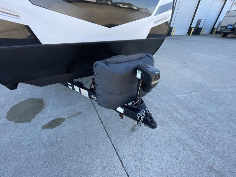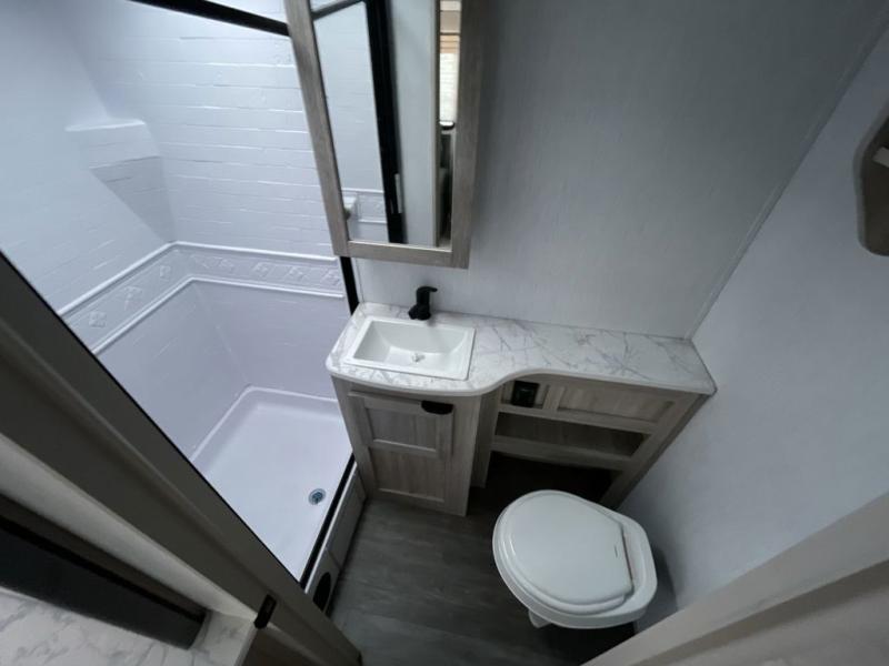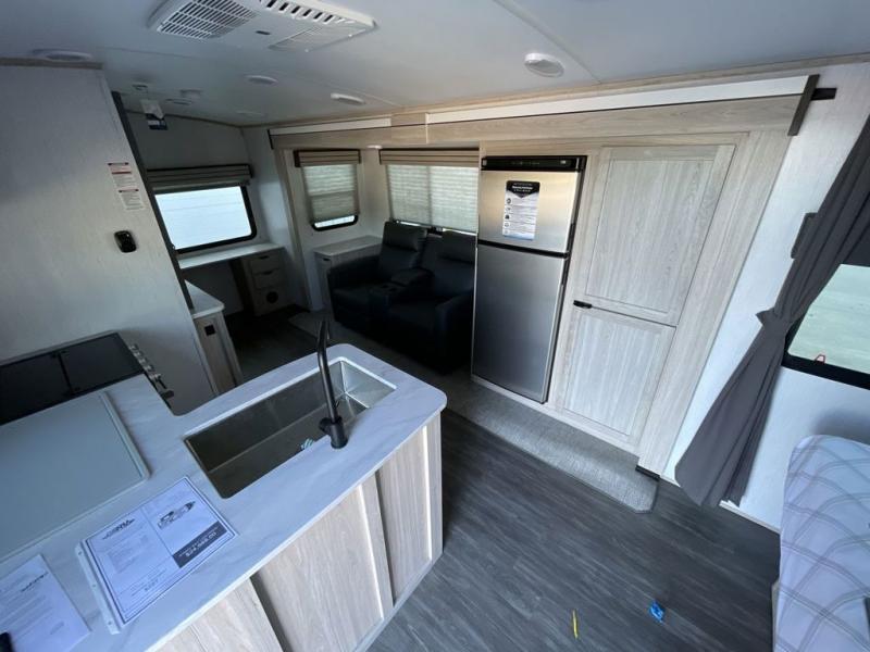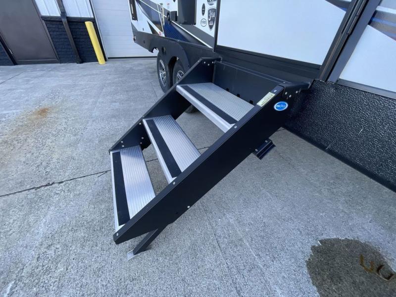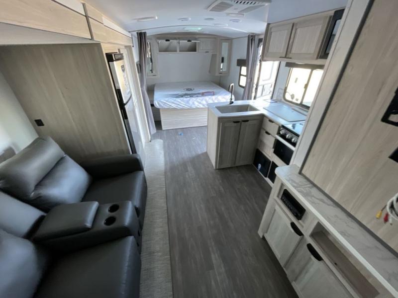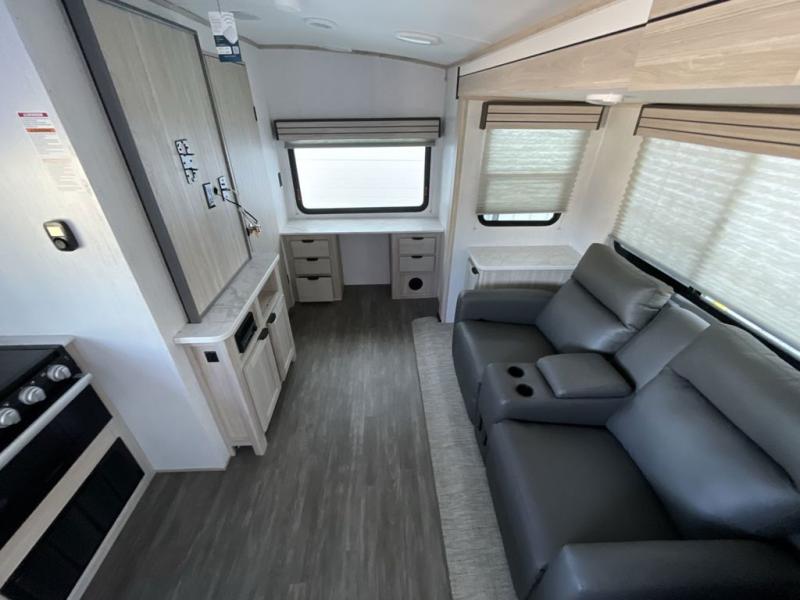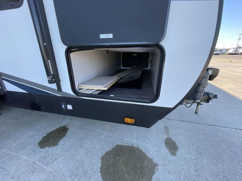 If you need to get a little work done while you are away then this travel trailer is perfect for you with the rear desk! The single slide provides more walking around space and houses the U-shaped dinette, 10.7 cu. ft. refrigerator, and pantry that is big enough to hold all of your favorite snacks. The front patent pending king bed sliding system has a pet palace underneath with a cruise-thru storage design and there are wardrobes on either side to keep your clothes looking their best, plus a privacy curtain to draw while you change or sleep. The exterior full belly storage system is big enough for all of your outdoor gear and the 15' electric awning has LED lights to highlight the good times at night!