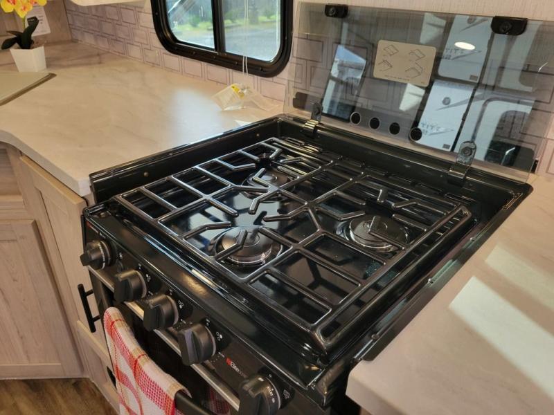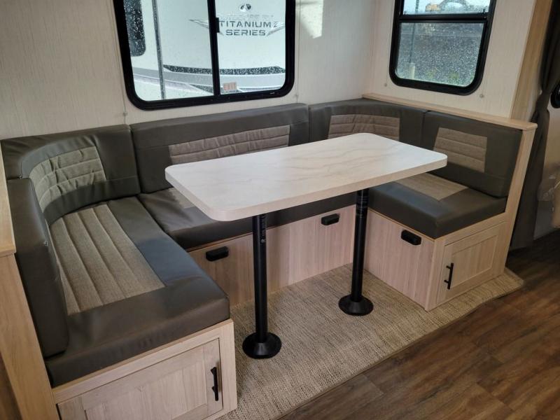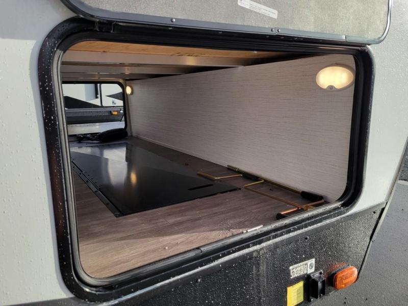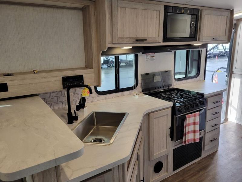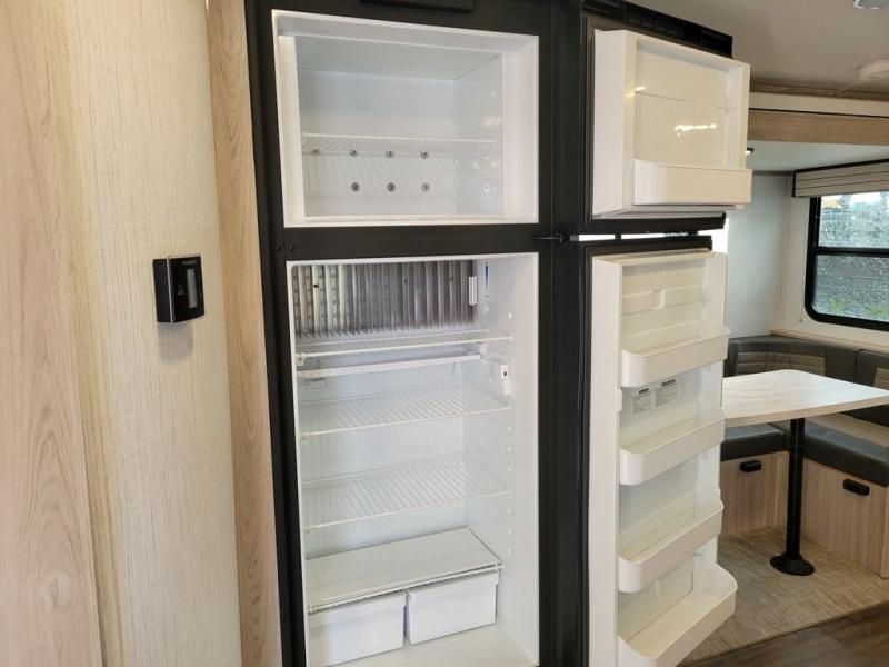 You won't want to camp any other way once you step inside this travel trailer! It features a patent pending king bed sliding system with a pet palace underneath that has a cruise-thru storage design so you and your furry friend will enjoy a good night's rest. When you aren't using the U-shaped dinette to enjoy a meal or play a card game, you can transform it into an extra sleeping space for a guest or two depending on their size. The seamless edge countertops have an enhanced durability and the 10.7 cu. ft. refrigerator will keep your perishables nice and fresh. Freshen up each morning with the radius shower in the rear corner bathroom!