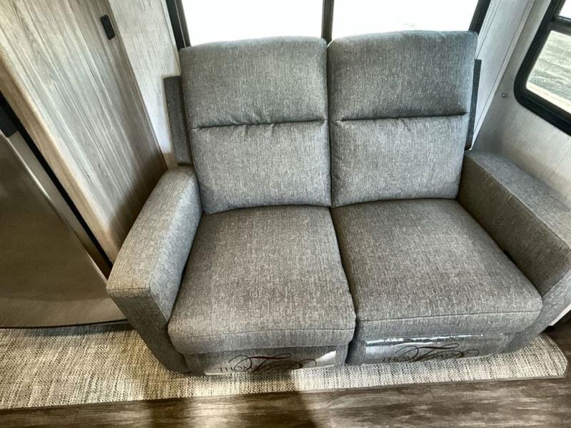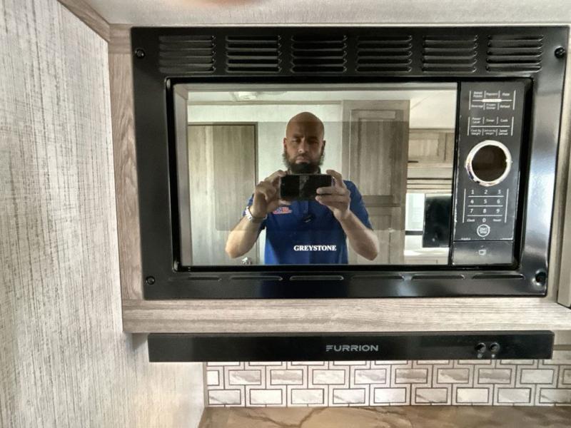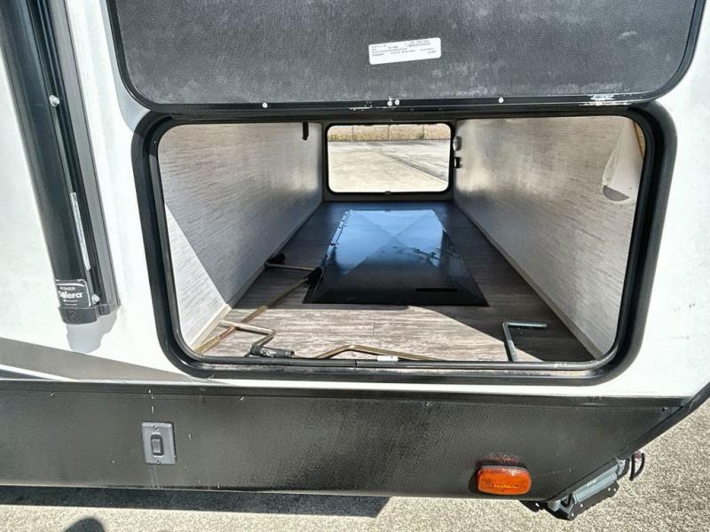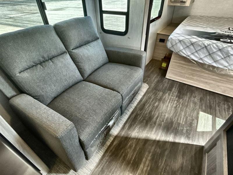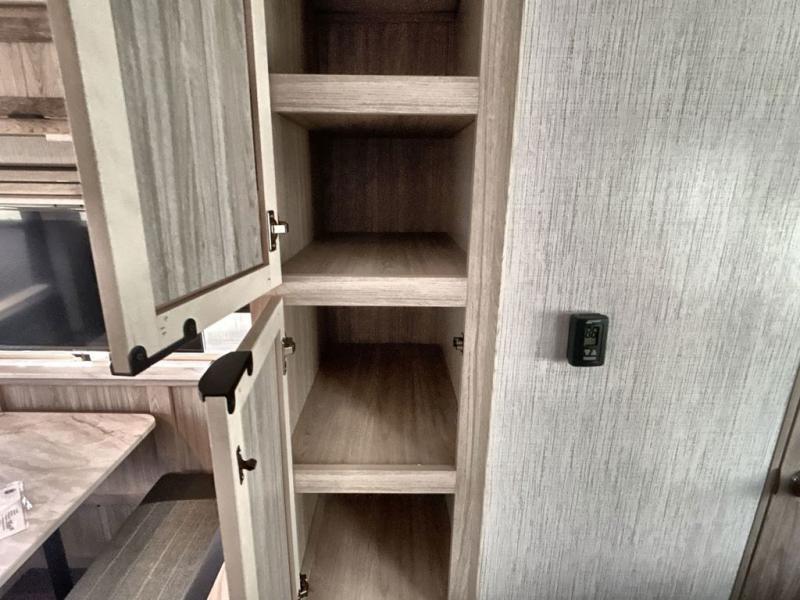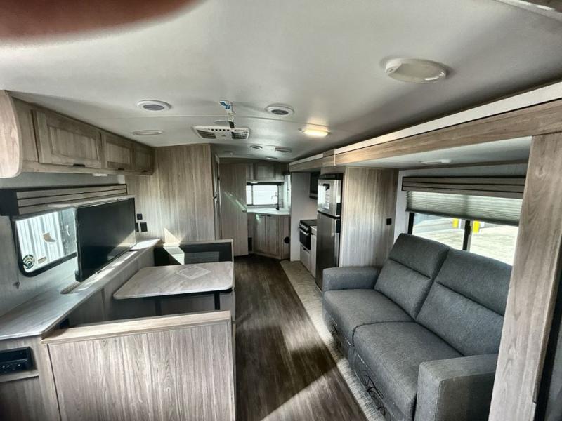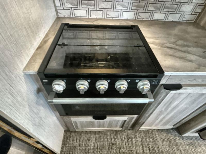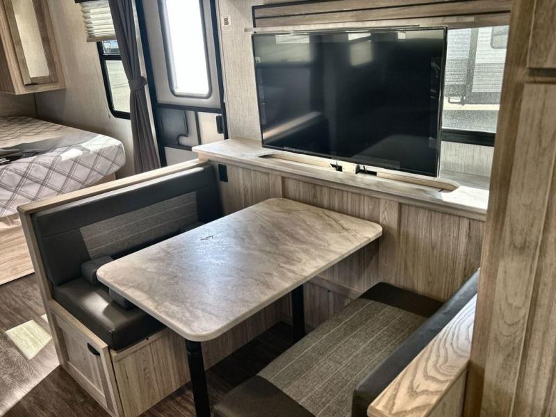 You will have everything you need for a comfortable weekend getaway with this travel trailer! Up front there is a patent pending king bed sliding system with an industry first pet palace with cruise-thru and an under-bed storage design, as well as wardrobes and a privacy curtain to draw at night. The kitchen has a three burner cooktop to fry up some eggs, a 10.7 cu. ft. refrigerator to keep your perishables fresh, and seamless edge countertops for enhanced durability. The booth dinette offers a comfortable place to enjoy your meals and also can transform into an extra sleeping space for a guest or two depending on their size.