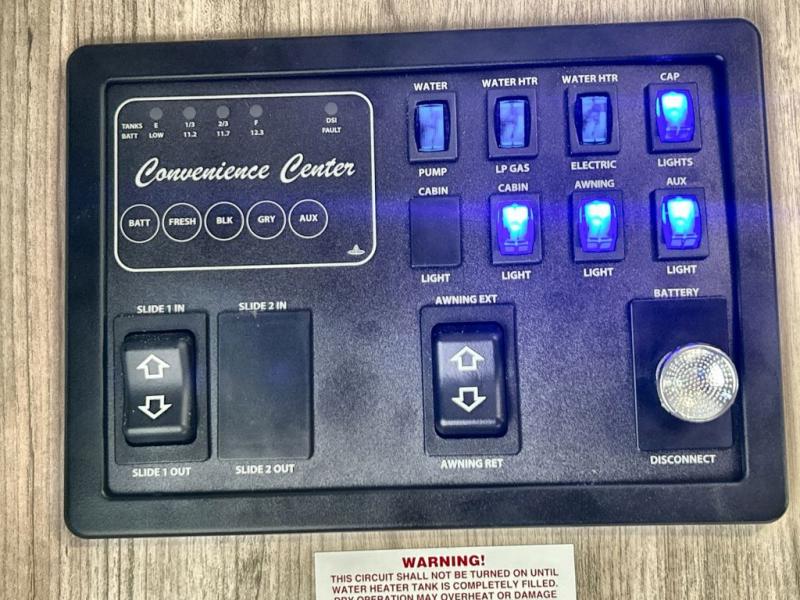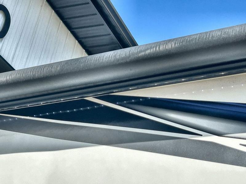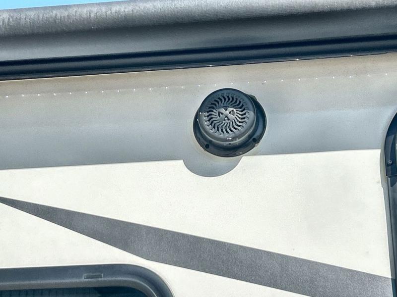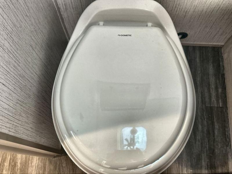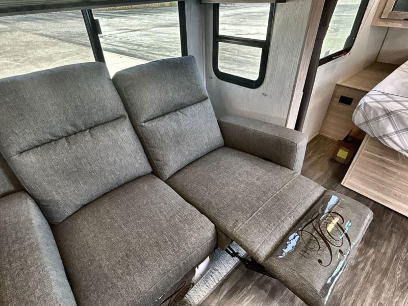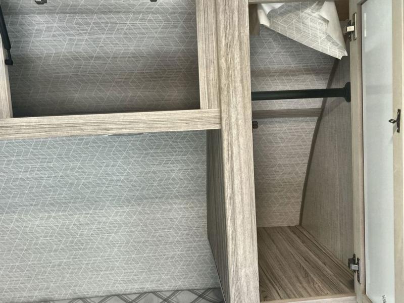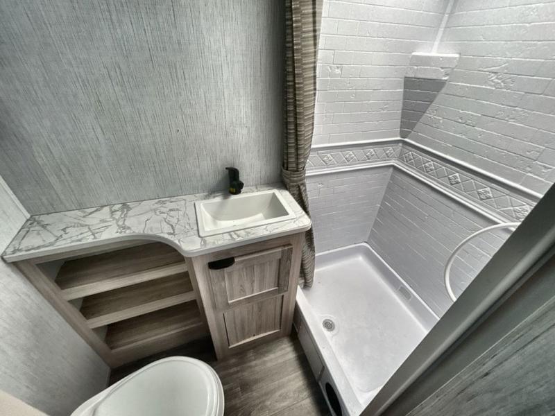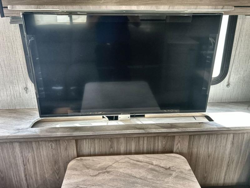 You will have everything you need for a comfortable weekend getaway with this travel trailer! Up front there is a patent pending king bed sliding system with an industry first pet palace with cruise-thru and an under-bed storage design, as well as wardrobes and a privacy curtain to draw at night. The kitchen has a three burner cooktop to fry up some eggs, a 10.7 cu. ft. refrigerator to keep your perishables fresh, and seamless edge countertops for enhanced durability. The booth dinette offers a comfortable place to enjoy your meals and also can transform into an extra sleeping space for a guest or two depending on their size.
