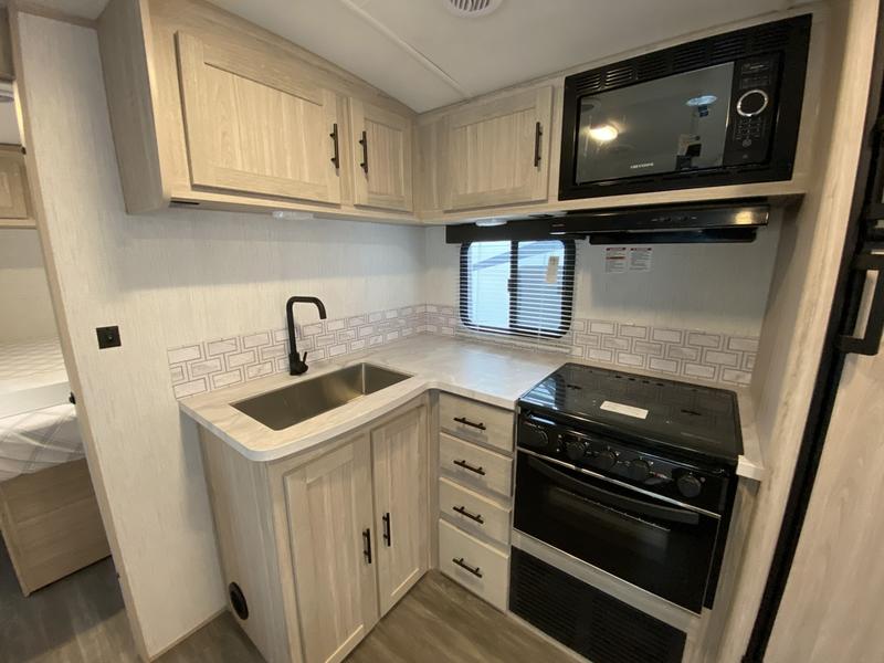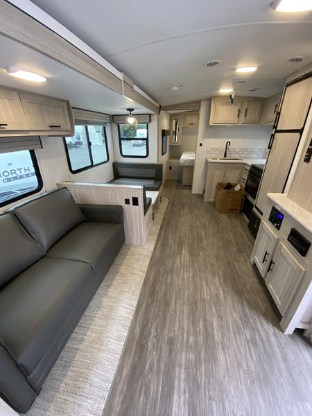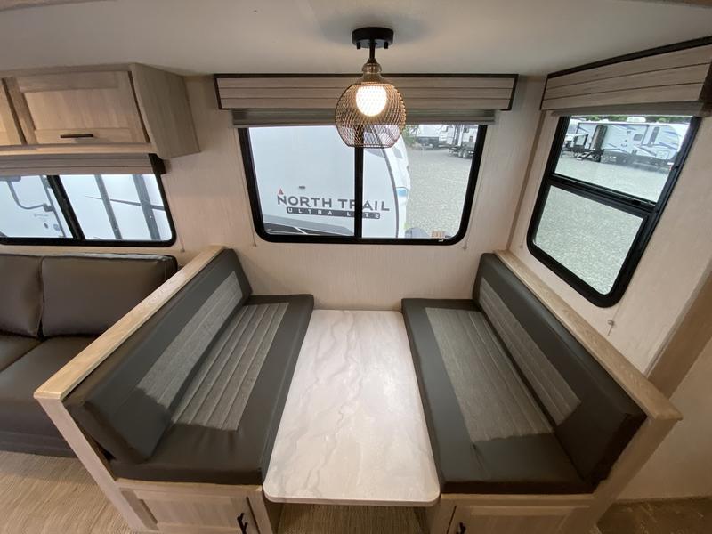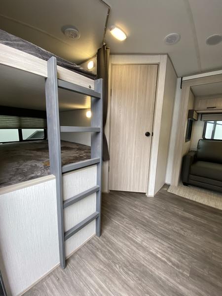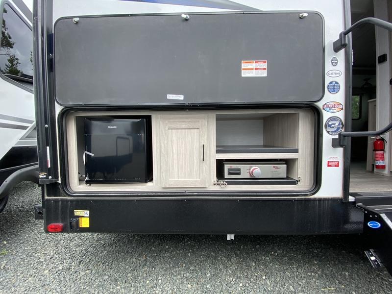 Everyone will have a comfortable place to lay their head at night in this travel trailer! Even your furry friends will have their own place with the pet palace underneath the patent pending king bed sliding system in the front private bedroom. There is also a set of double size bunk beds next to the rear corner bathroom. You could even transform the sofa and booth dinette slide into extra sleeping spaces after eating a meal and socializing together. The kitchen has a three burner cooktop to cook your meals and a walk-in pantry to store your favorite snacks. You can also cook at the outside kitchen with the two burner cooktop and stay protected by the 20' electric awning!