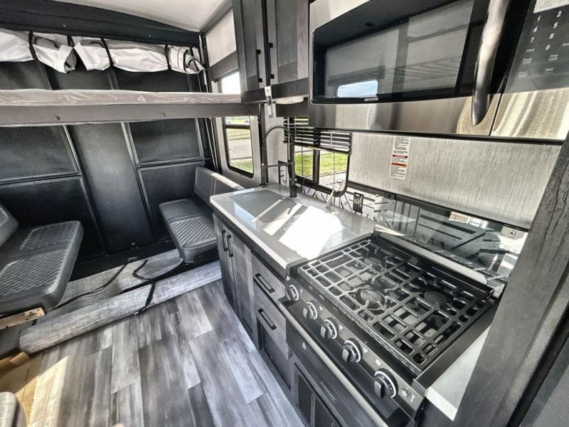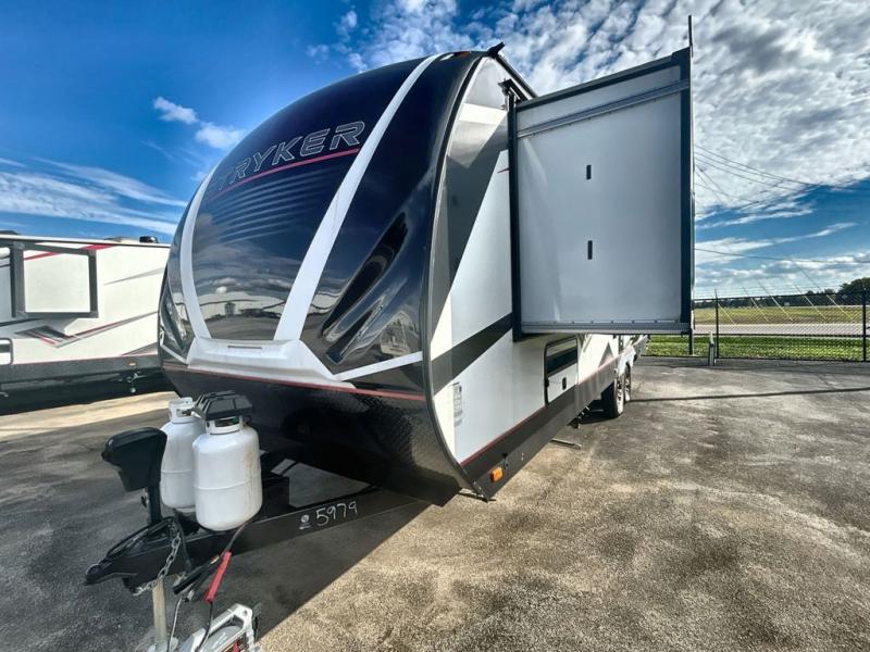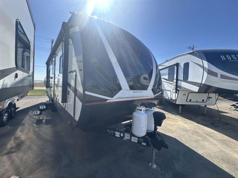 Each Stryker toy hauler travel trailer by Cruiser starts with a powder coated structural steel I-beam frame, Azdel composite laminated sidewalls, and a 102" wide body, perfect for your side-by-side, dirt bikes, or kayaks! The EZ flex rubberized suspension provides smooth towing on tougher roads, and the painted molded fiberglass front cap not only looks sleek, but provides better protection. Inside, you'll find barreled ceilings up to 98" in height, hardwood cabinet doors, solid surface kitchen cabinets, and numerous USB ports and 110V outlets. The removable carpet in the garage will create an open concept you are sure to love, and the industry-first pet palace under the bed will allow you to bring your loyal furry friends along. There's so much more to love about the Stryker toy haulers, like the premium sound system, the large windows, tons of storage space, and the list goes on!