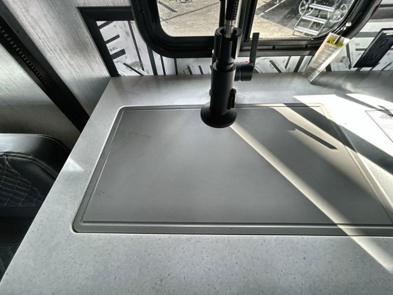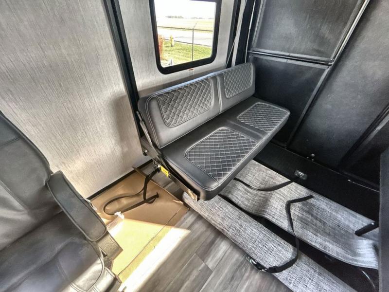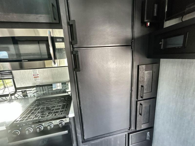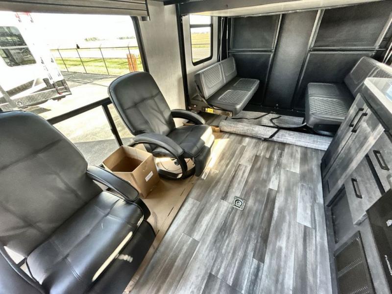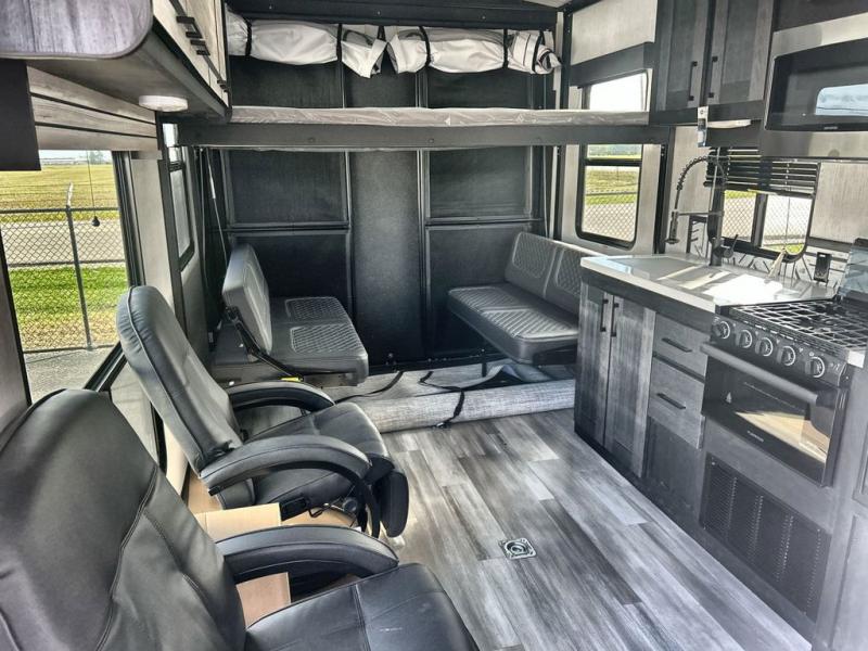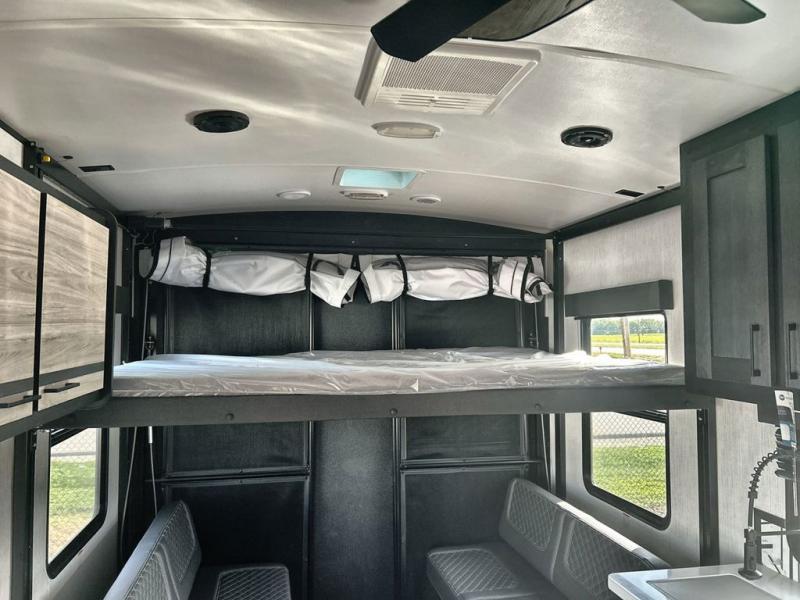 Whether you're camping with friends or family, you can be sure to have a great time in this toy hauler. Unload your bikes from the 14' garage using the 8' ramp door, then enjoy a quick game of cards at the dinette with opposing sofas. There is also a power queen bed here for your guests when they're ready for some shut-eye. This model includes a dual entry bath that will create a front master bedroom you are sure to love. Here, you'll find a king bed slide out, two bedroom dressers, plus a wardrobe for even more storage. Your favorite feature of this toy hauler may be the garage, or it may just be the outdoor kitchen under the power awning with LED lights!