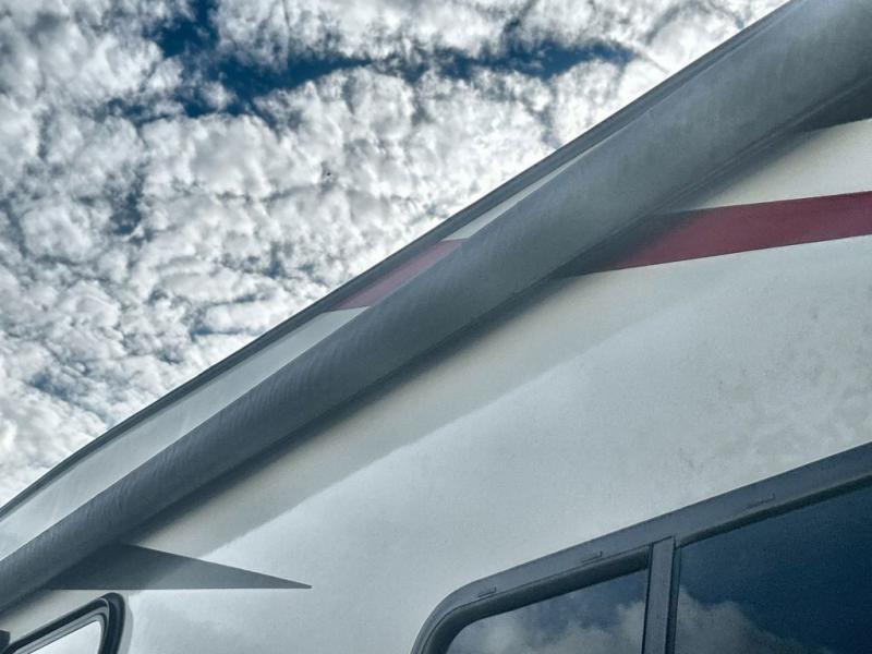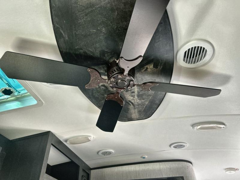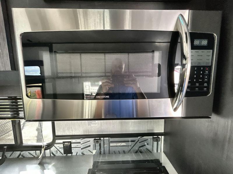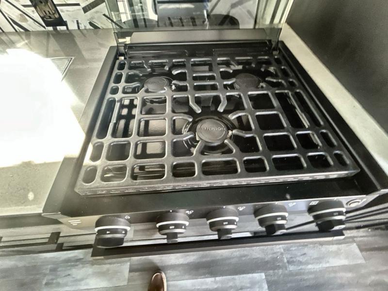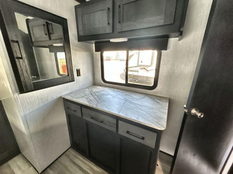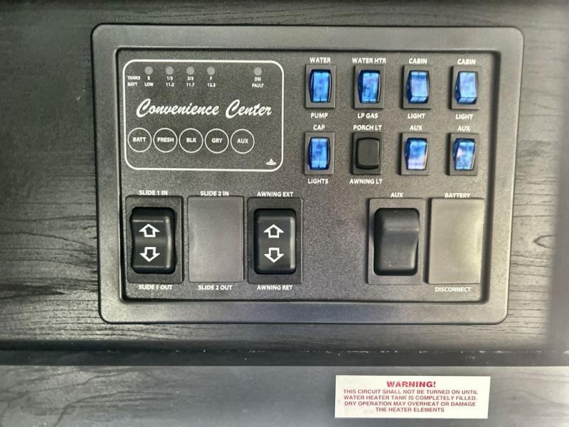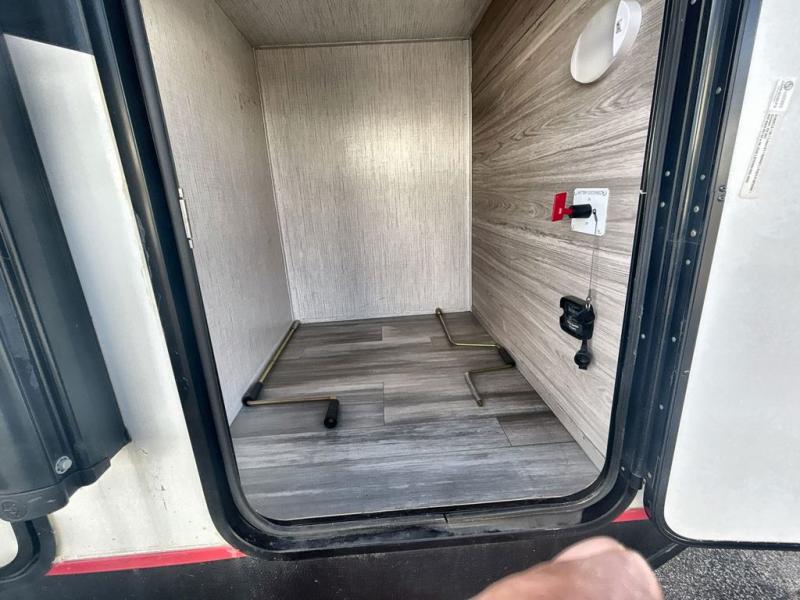 Whether you're camping with friends or family, you can be sure to have a great time in this toy hauler. Unload your bikes from the 14' garage using the 8' ramp door, then enjoy a quick game of cards at the dinette with opposing sofas. There is also a power queen bed here for your guests when they're ready for some shut-eye. This model includes a dual entry bath that will create a front master bedroom you are sure to love. Here, you'll find a king bed slide out, two bedroom dressers, plus a wardrobe for even more storage. Your favorite feature of this toy hauler may be the garage, or it may just be the outdoor kitchen under the power awning with LED lights!