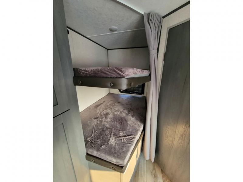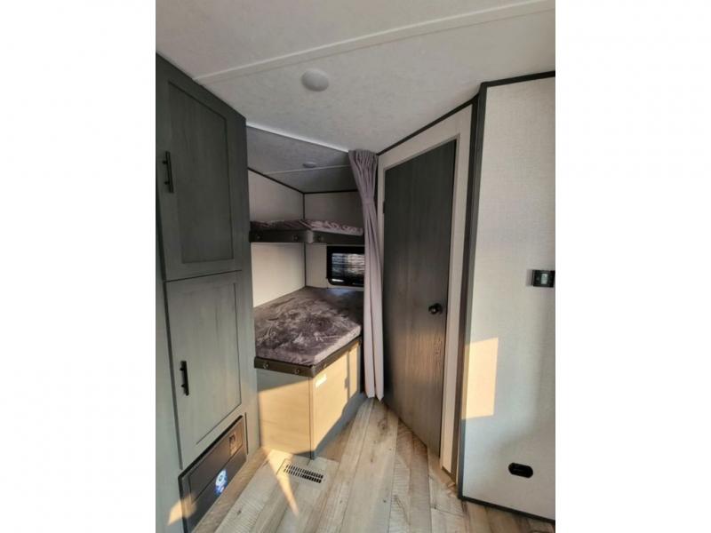 Never worry about what you need on your camping trips when you have this Colorado and all the storage choices to stow away everything! As you walk though the door you will find a handy entry closet, and there is a pantry behind the hinged entertainment center, an extra wardrobe next to the double-size bunks, plus all the bedroom storage including drawers, and the exterior pass-through storage for those larger items. Everyone can sleep comfortably in this trailer with the queen bed, the double-size bunks and the furniture within the large slide out. Everyone will appreciate the convenience of having a full bathroom especially at night, and the cook will have full kitchen amenities inside, and an outside kitchen as well.