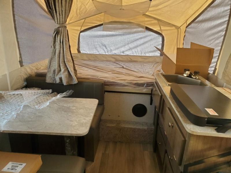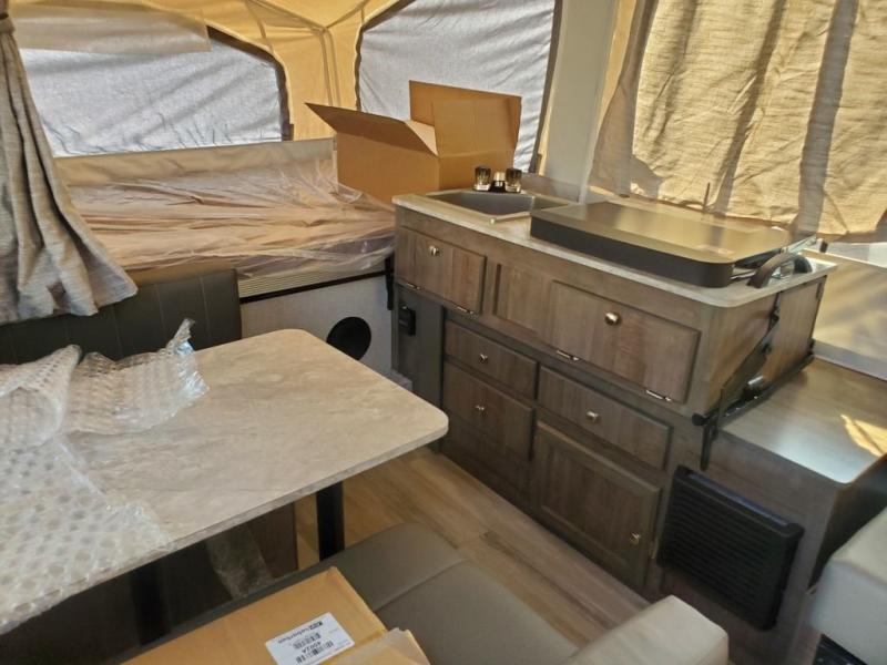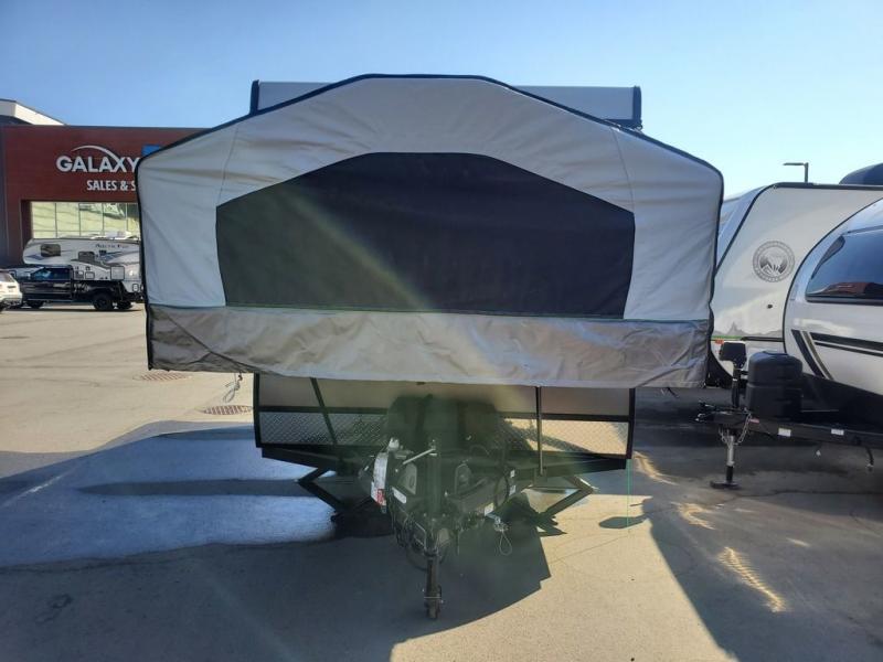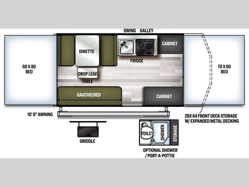 You will be so excited to get your hands on this Flagstaff SE folding pop-up camper! This camper is truly ready for the sports enthusiast because it comes with a 28" x 84" front deck storage with expanded metal decking, so you can bring along the sports equipment that best suits your taste. The exterior is even more useful with the outdoor griddle and 10' 6" awning, and once you step foot inside, you'll be met with a swing galley directly across from the entrance. There are two cabinets that can be used for interior storage, and the two tent beds on either side of this camper stay out of the way of your interior living space. For relaxing, there is a booth dinette and gaucho bed with a drop-leaf table in between, and you can make this camper more accommodating by adding the optional shower/Port-A-Pottie.