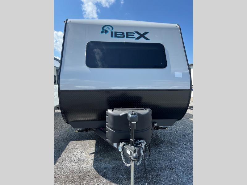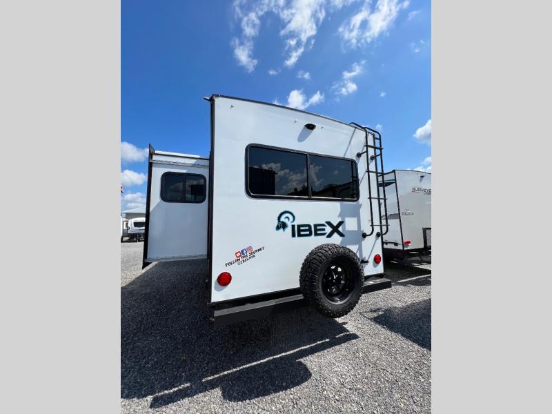 With any IBEX travel trailer or toy hauler by Forest River, the interior offers stainless steel appliances for style, seamless countertops for durability and easy care, a largest-in-class refrigerator for more cold storage, and a central vacuum system to easily clean up after a fun, messy day. The PVC roof, the Azdel construction, and the Cold Weather package with a heated and enclosed underbelly, tank pad heaters and an enclosed termination system provides solid construction plus allows you to travel during any season. And the all terrain tires and increased ground clearance allow you to find the perfect spot to setup camp!