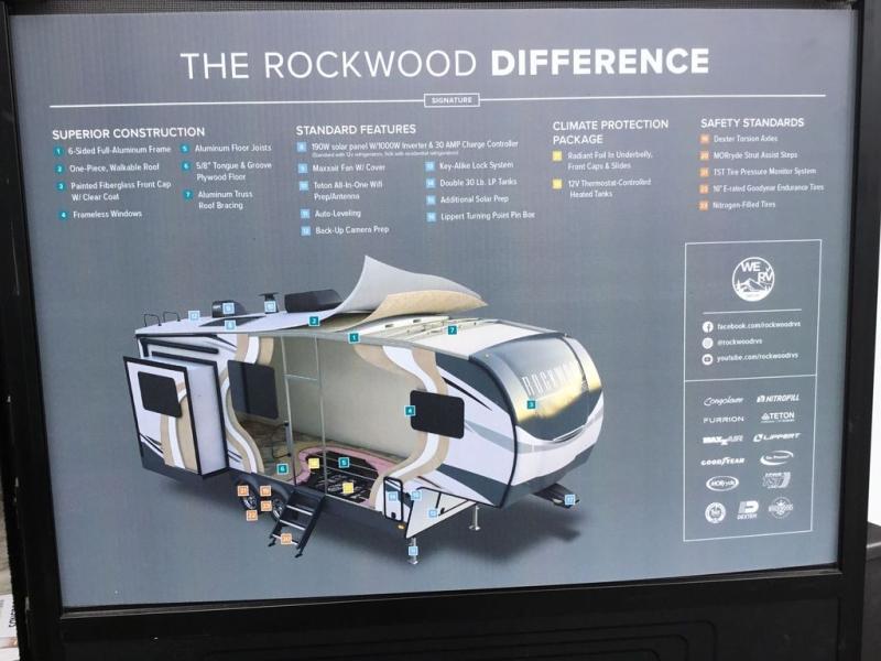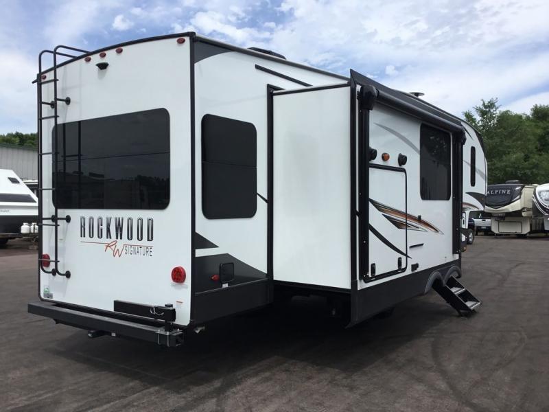 Each Rockwood Signature Ultra Lite fifth wheel and travel trailer by Forest River is constructed with a radiant foil insulated underbelly, laminated fiberglass sidewalls, and tinted frameless windows for a more sleek look. Enjoy hassle-free towing thanks to the torsion axle Rubber-Ryde suspension system, and you'll also appreciate the tire pressure monitoring system with a monitor and the rear observation camera prep. Each model includes LED TV's, a multi zone stereo with DVD/CD/AM/FM and Bluetooth, plus outside speakers for all your entertainment needs. You'll find that the carpetless main bedroom floor will be so easy to clean, and the under-bed storage will allow you to easily store your luggage once you've unpacked. These fifth wheels and travel trailers also include designer kitchen backsplash, beautiful Newport Ash or Autumn wood cabinetry, and a fireplace on most models.