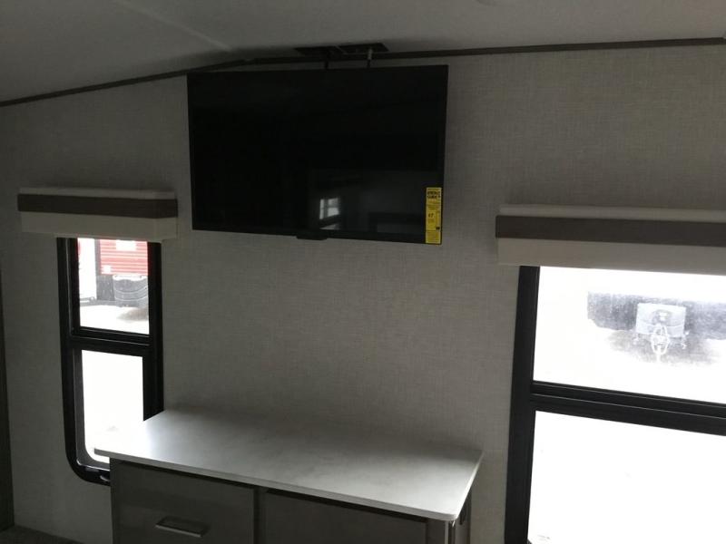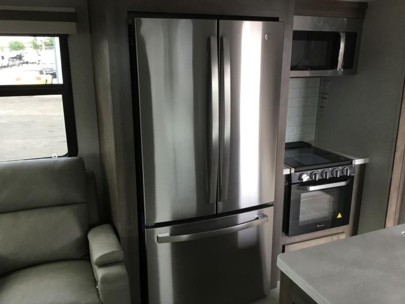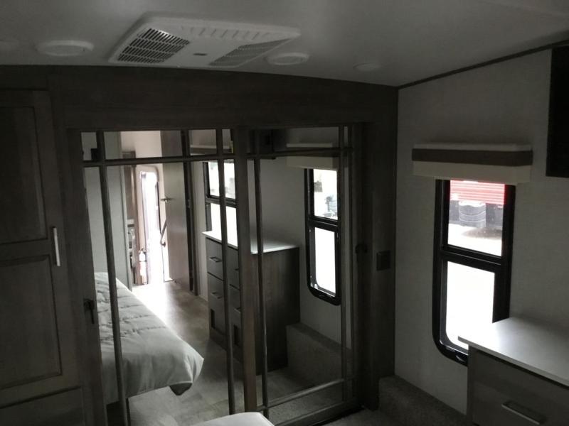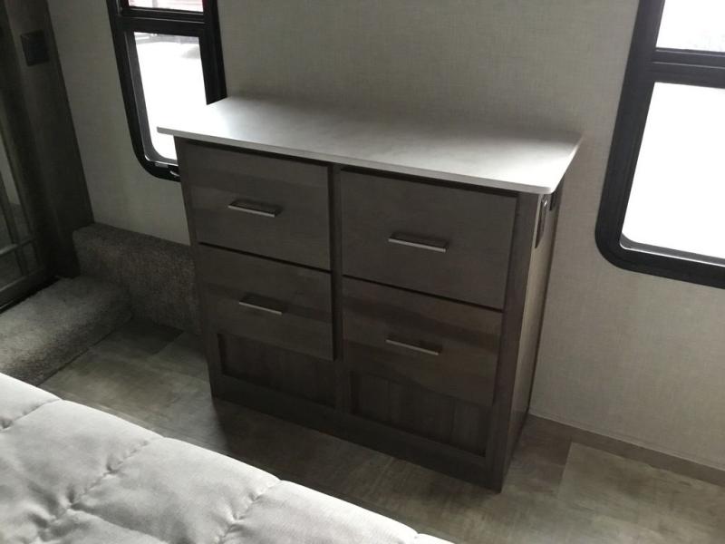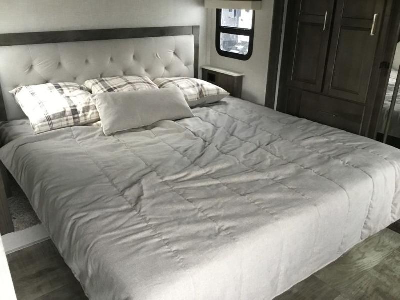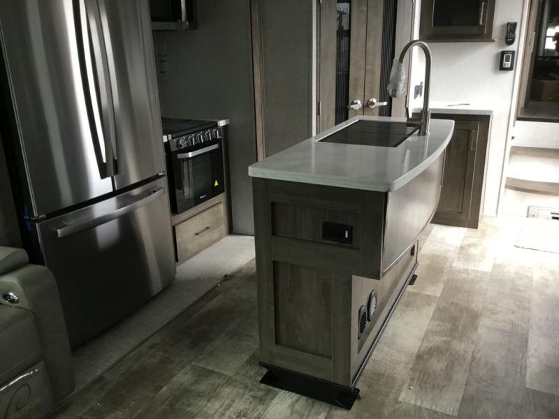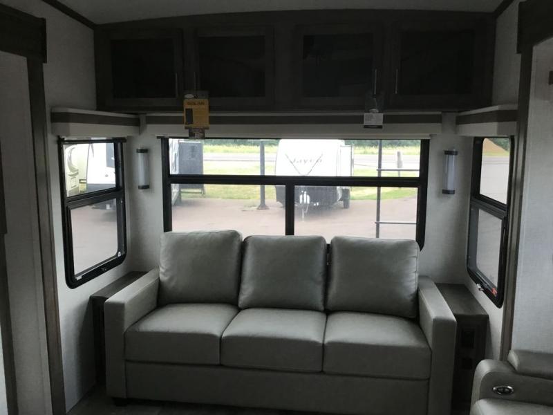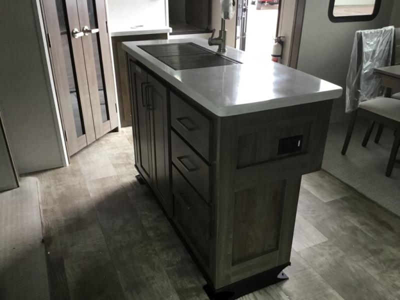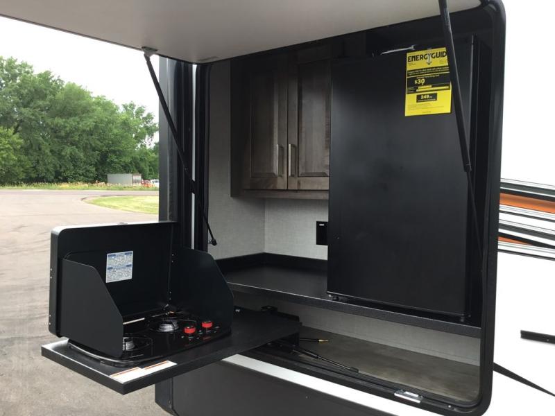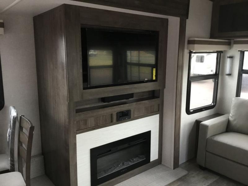 You'll be camping in style each time you take this fifth wheel out to the campground! The dual opposing slides in the main living area create an open floorplan, and the kitchen island here will provide more counter space to prep meals. You will love the theater seat directly across from the entertainment center and fireplace, and additional seating can be found on the hide-a-bed sofa or around the king U-shaped dinette. The full bath includes a shower with a seat, a skylight, plus a Maxxair ventilation fan to keep everything fresh. The front private bedroom may feel more like a resort with its king bed slide out, large wardrobe and shirt closet, plus a dresser to keep your clothes tidy. And did we mention this fifth wheel has two power awnings for maximum protection against the elements, and tons of exterior storage for all your gear!