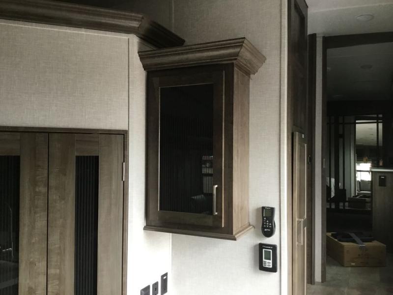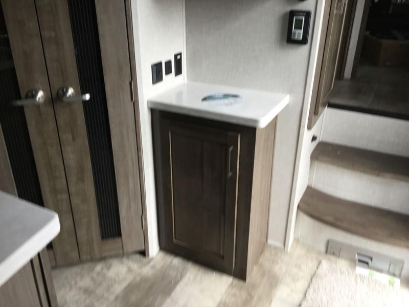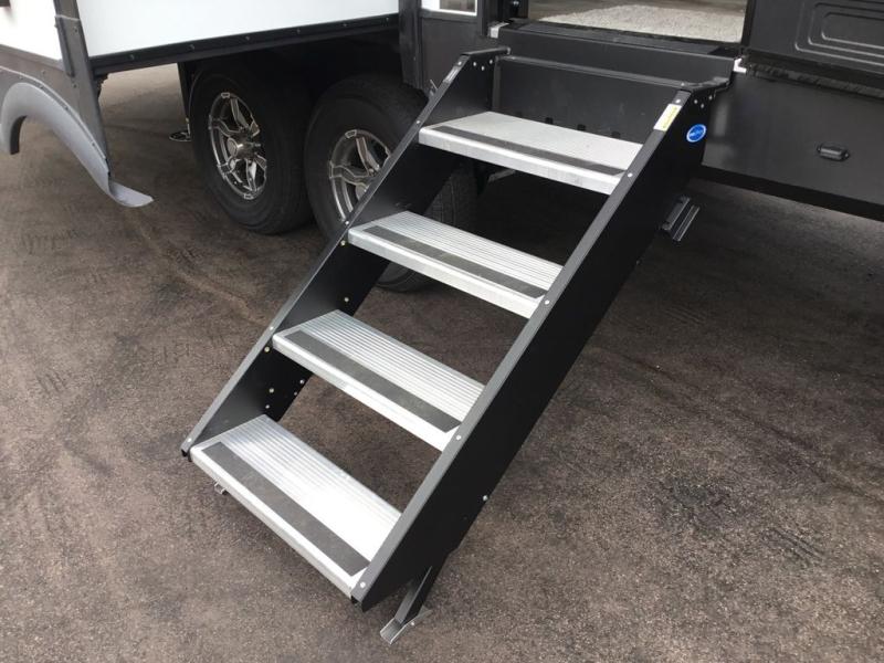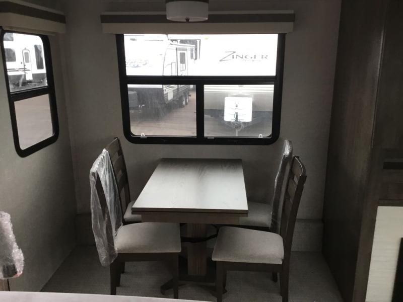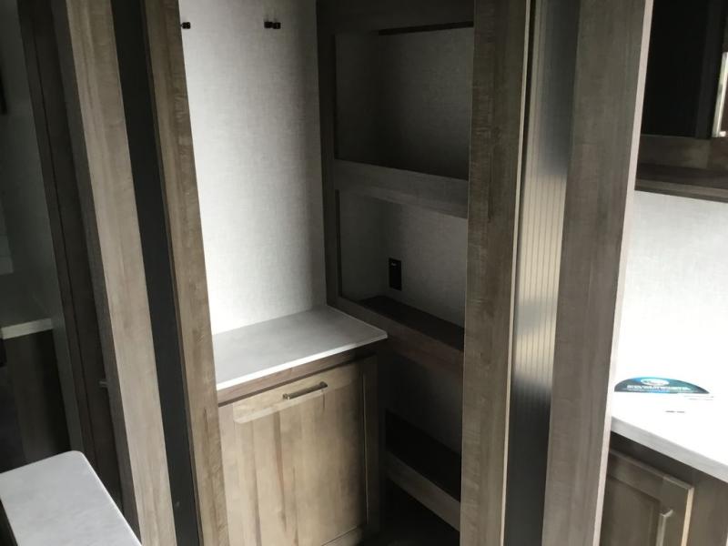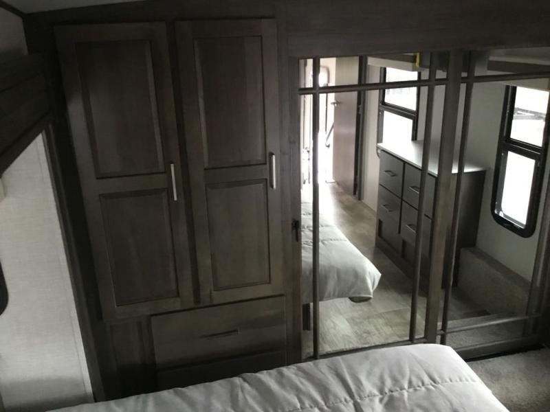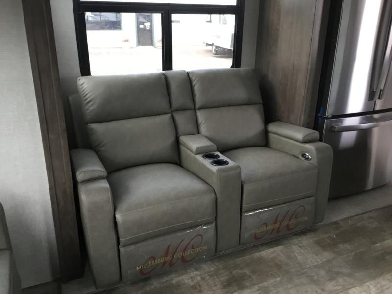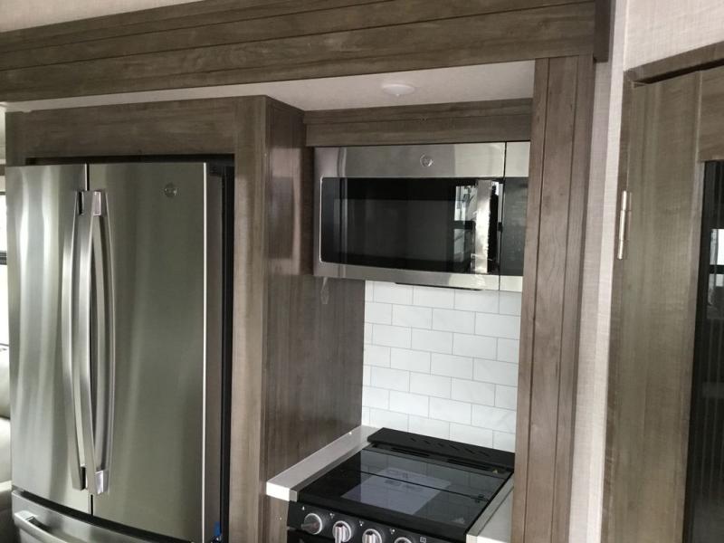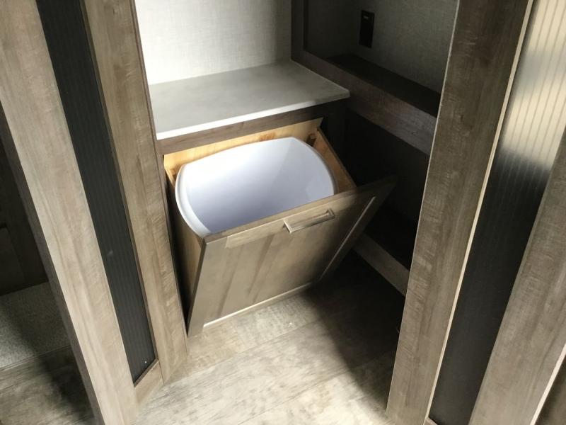 You'll be camping in style each time you take this fifth wheel out to the campground! The dual opposing slides in the main living area create an open floorplan, and the kitchen island here will provide more counter space to prep meals. You will love the theater seat directly across from the entertainment center and fireplace, and additional seating can be found on the hide-a-bed sofa or around the king U-shaped dinette. The full bath includes a shower with a seat, a skylight, plus a Maxxair ventilation fan to keep everything fresh. The front private bedroom may feel more like a resort with its king bed slide out, large wardrobe and shirt closet, plus a dresser to keep your clothes tidy. And did we mention this fifth wheel has two power awnings for maximum protection against the elements, and tons of exterior storage for all your gear!