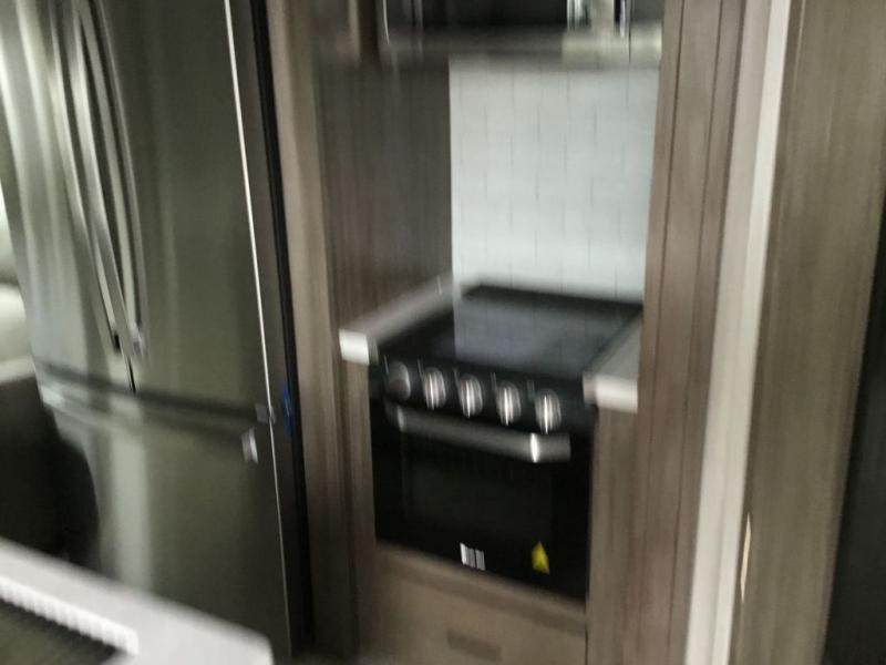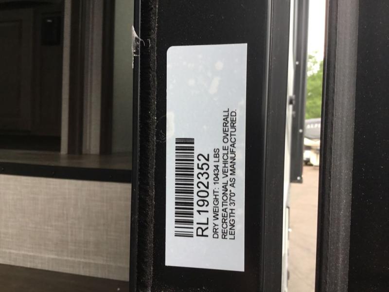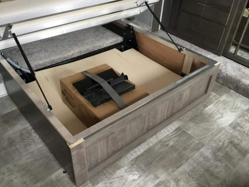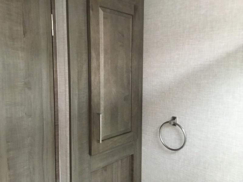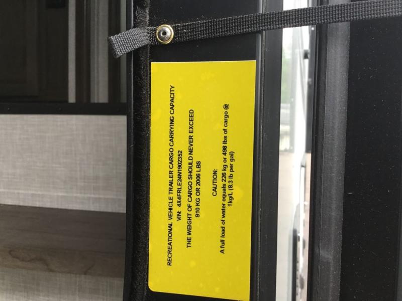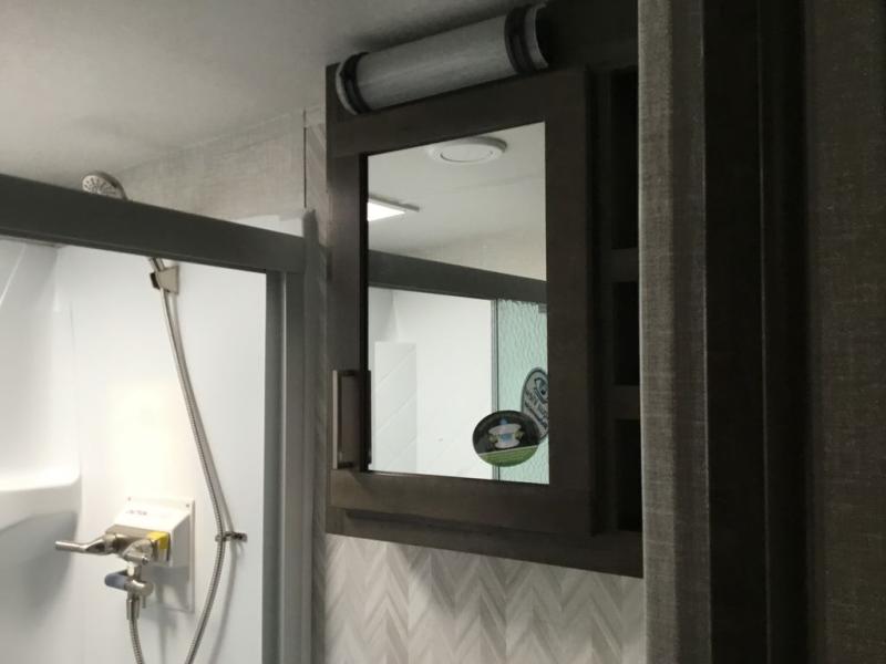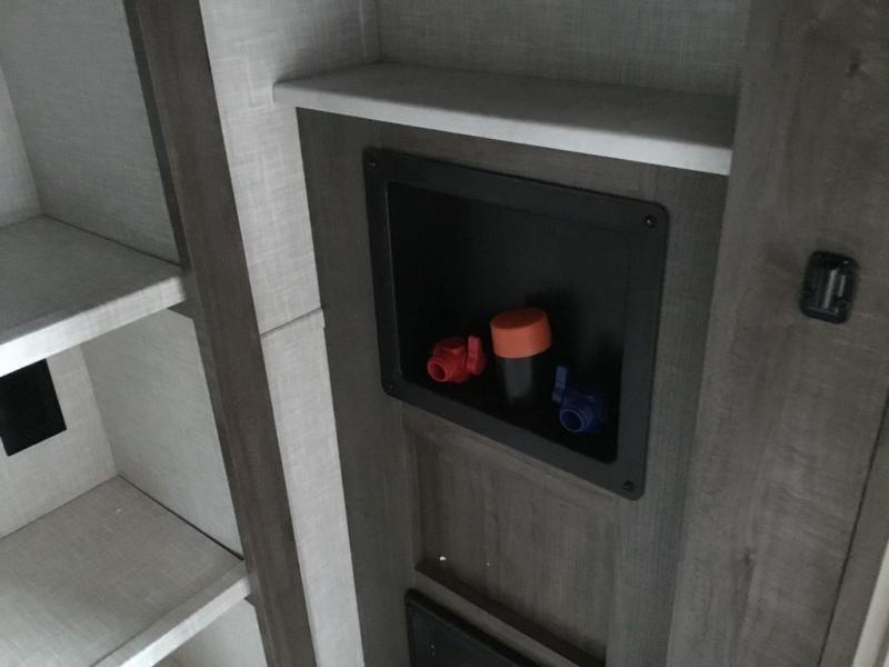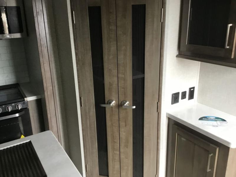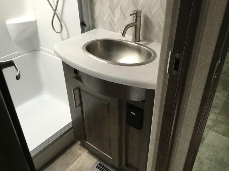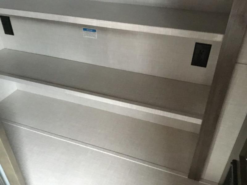 You'll be camping in style each time you take this fifth wheel out to the campground! The dual opposing slides in the main living area create an open floorplan, and the kitchen island here will provide more counter space to prep meals. You will love the theater seat directly across from the entertainment center and fireplace, and additional seating can be found on the hide-a-bed sofa or around the king U-shaped dinette. The full bath includes a shower with a seat, a skylight, plus a Maxxair ventilation fan to keep everything fresh. The front private bedroom may feel more like a resort with its king bed slide out, large wardrobe and shirt closet, plus a dresser to keep your clothes tidy. And did we mention this fifth wheel has two power awnings for maximum protection against the elements, and tons of exterior storage for all your gear!