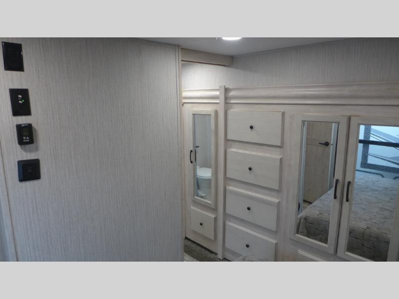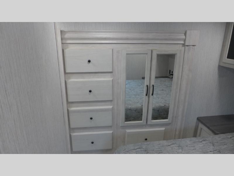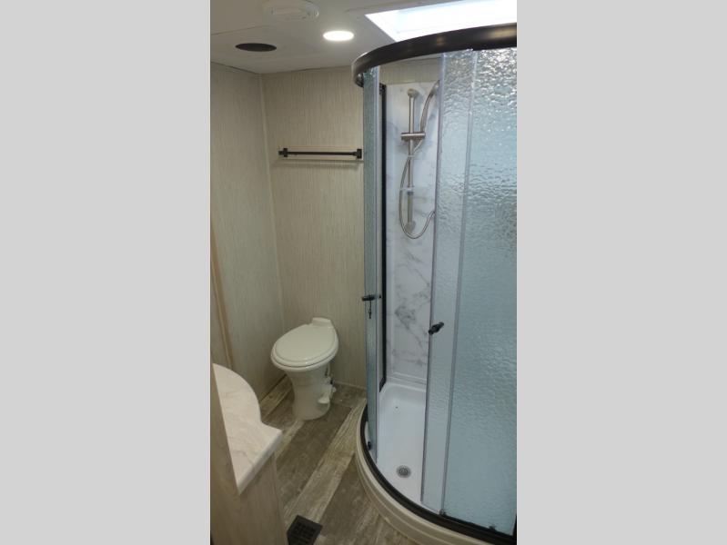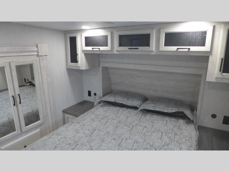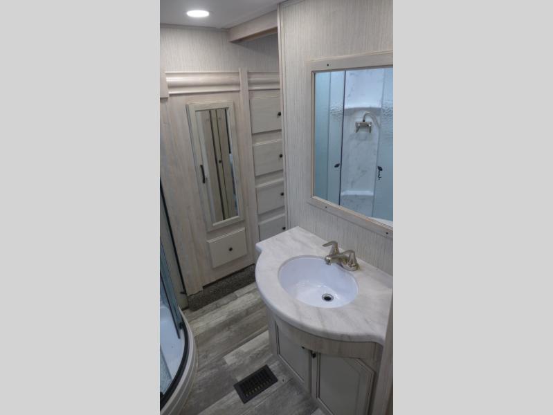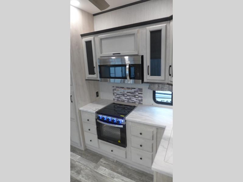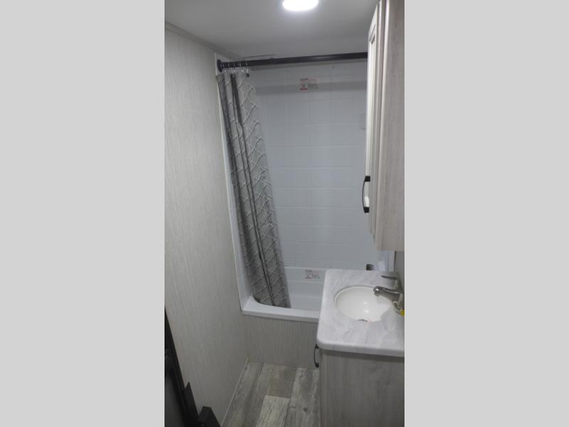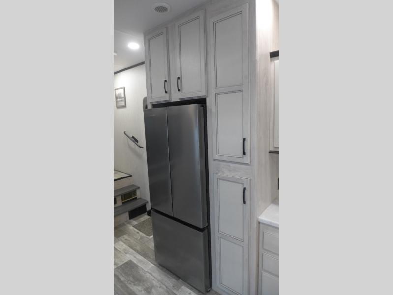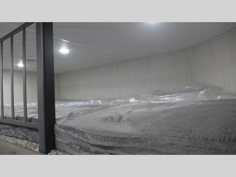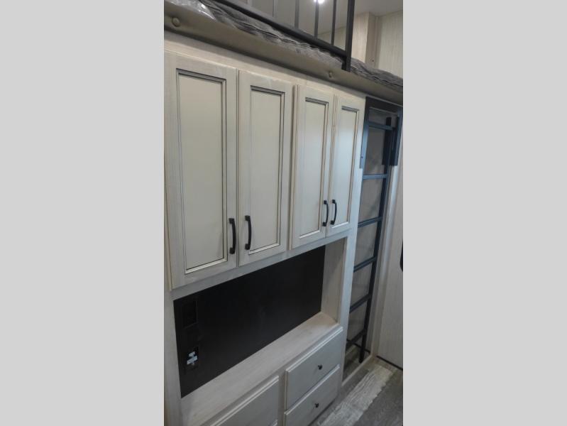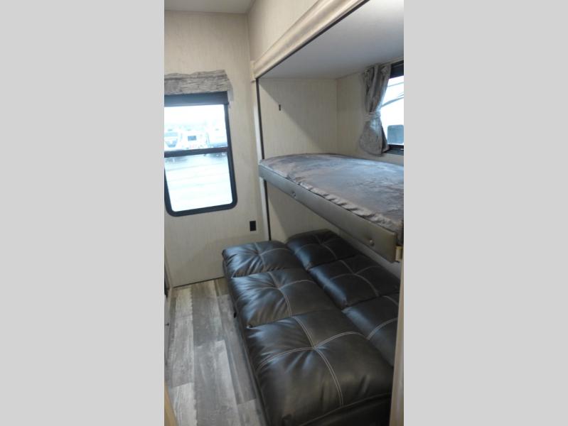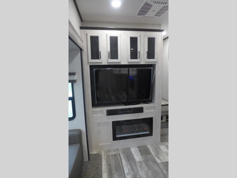 There is something for the whole family with this fifth wheel! From the rear private bunkhouse with a bunk bed above a glide sofa across from a TV cabinet/wardrobe to the two full bathrooms, one of which has an entrance/exit door to the unit and to the bunkhouse. The chef can whip up a delicious meal inside with the four burner cooktop or head outdoors to use the bumper mount swivel gas grill. Grab a snack from the full size pantry and head to either the tri-fold hide-a-bed sofa or booth dinette to watch a movie at the entertainment center with a fireplace below. When you're ready to wind down your nights, head to the dual entry bathroom to take a hot shower in the radius shower then walk directly into the front private bedroom to grab your pajamas from the wardrobe/linen slide and enjoy a good night's rest on the queen bed!