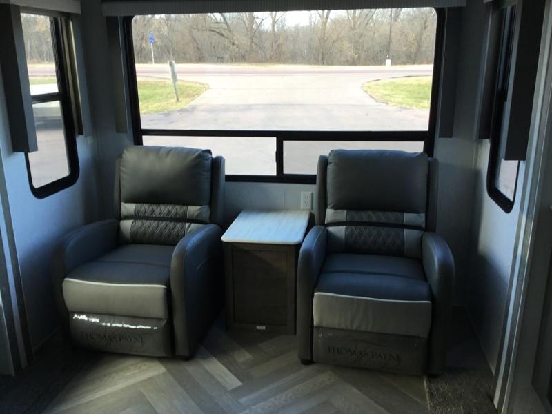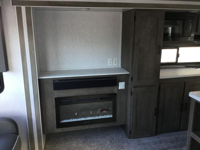Pack up the kids and bring the dog along for a fun family vacation in this double-slide Wildwood travel trailer. This unit features a rear living area with a Versa Lounge and an entertainment center with a fireplace for a cozy evening. With the queen bed in the private bedroom, the dinette and sofa, you can sleep six campers each night. The kitchen island provides more counter space, and you will love having a pantry for canned goods or snacks. This model also includes two lounge chairs for a relaxing evening.
