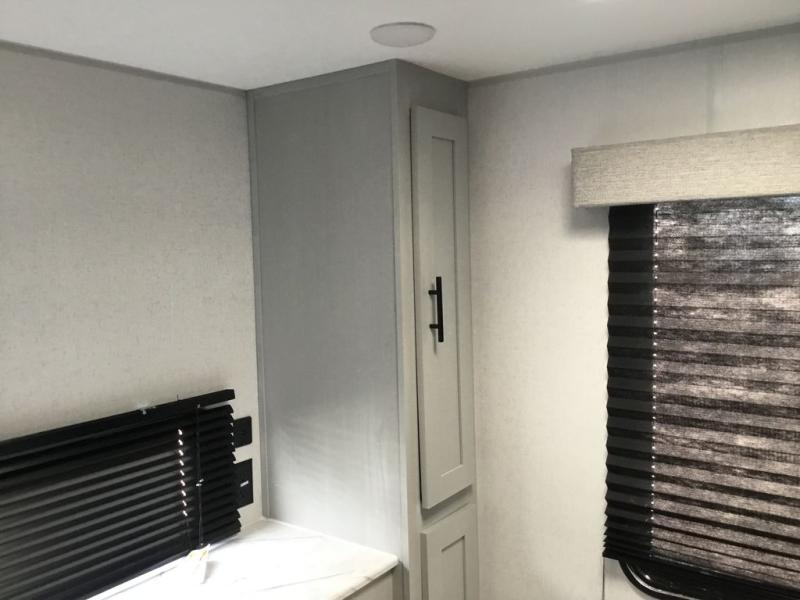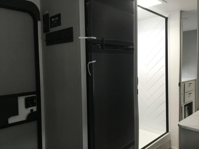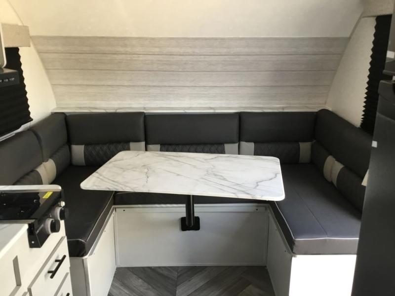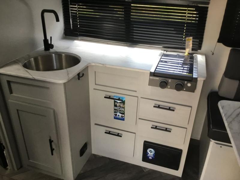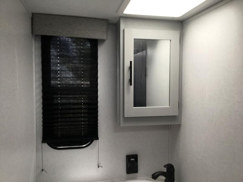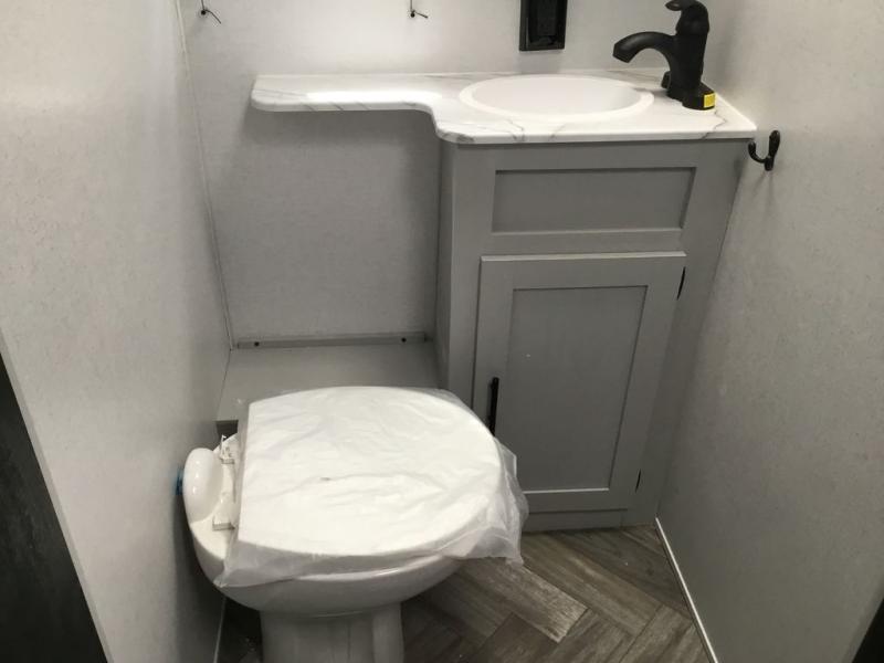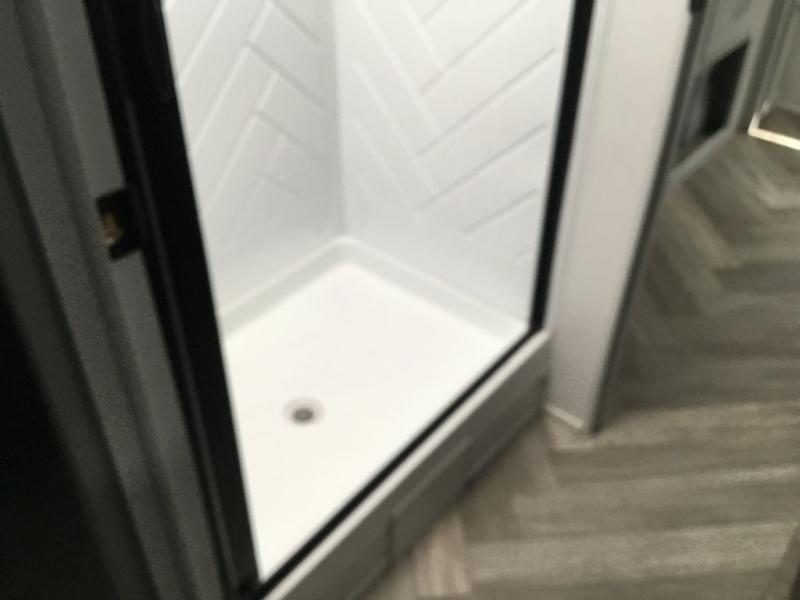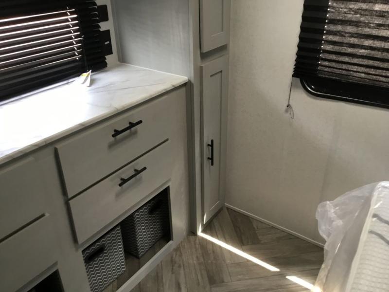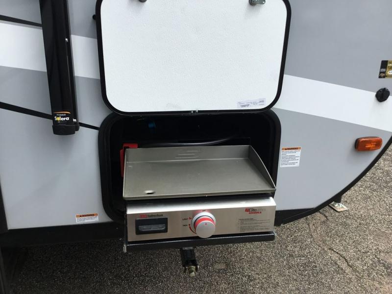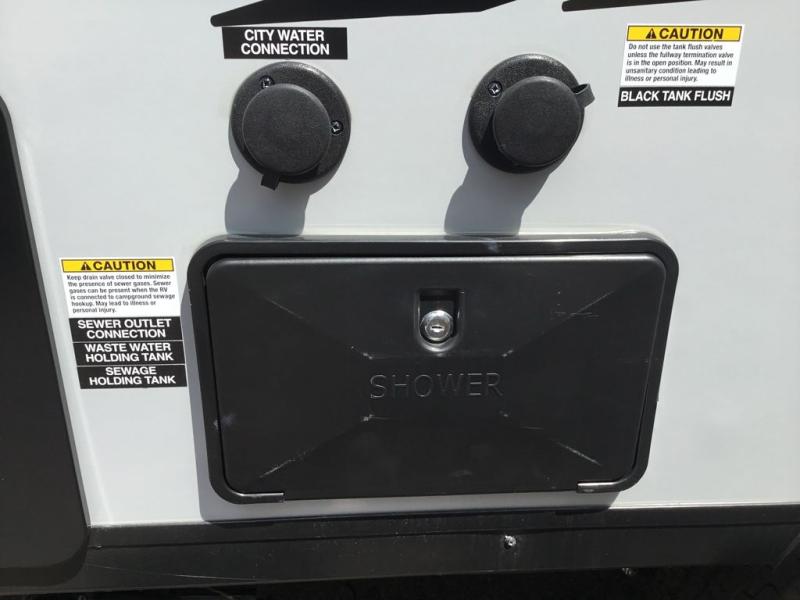 Adventure starts with this travel trailer in tow. Once you arrive at the campground, set up the 15' power awning with LED lights and fill the dogs water bowl using the hot/cold outside shower. Head inside to prepare lunch on the two burner cooktop, and you can dine together around the U-shaped dinette. This area can become your guests sleeping space at night, while you enjoy the queen bed in the rear bedroom. There is a private toilet and sink, with a private shower right across the hall so two people can get ready for bed at the same time. How convenient!