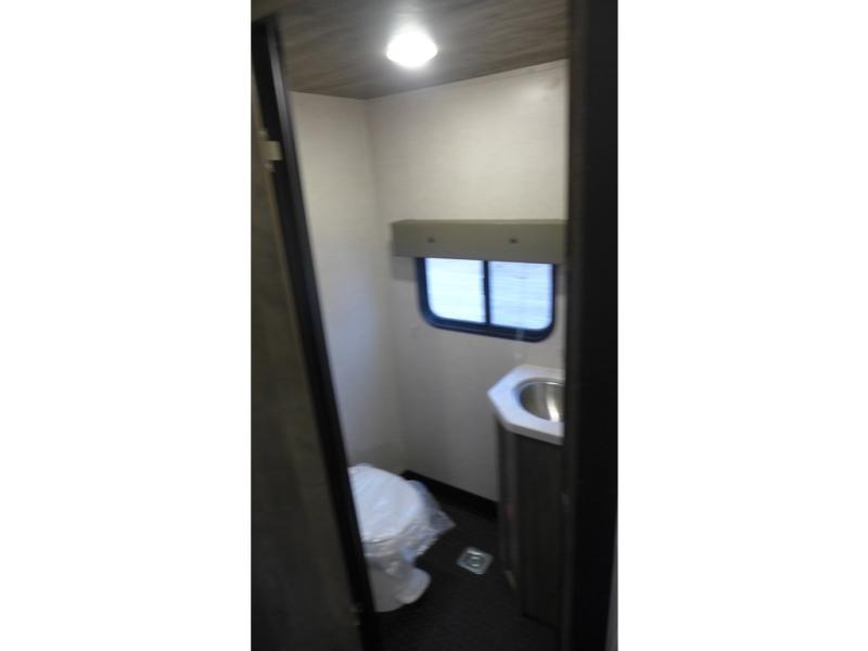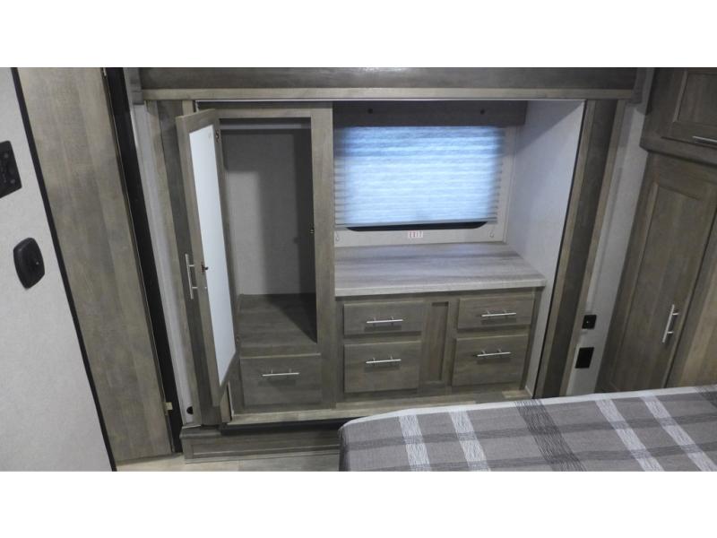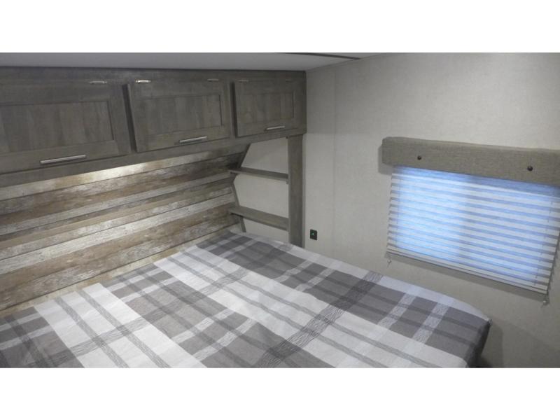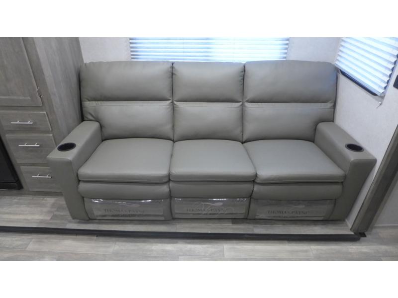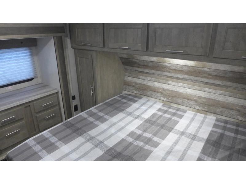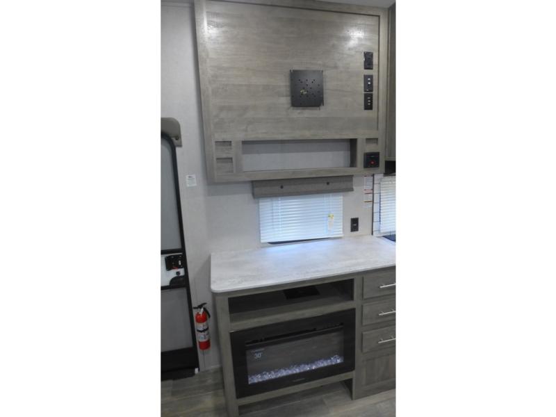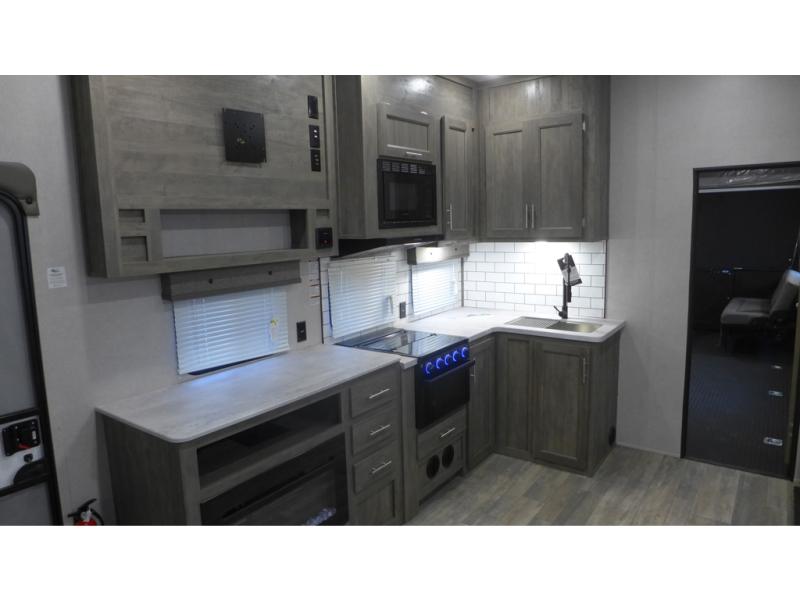 Pack your bags and load up your favorite toys into the 16' garage area of this toy hauler! Once you have arrived, you can set up the Sit N Sleep with quick release sofas that have a table in between and a Sleep N Store manual bed system above them, plus there is a half bathroom, one of the dual entry doors to the unit, and a patio deck. Get a good night's rest each night on the RV king bed in the front private bedroom and rinse the mud out of your hair after each trail ride in the dual entry bathroom with the radius shower that has a skylight above for more headroom and natural lighting. The fully equipped kitchen has everything you need to prepare your best home cooked meals, and you can relax in true comfort on the theater sofa across from the fireplace at the entertainment center with TV prep!
