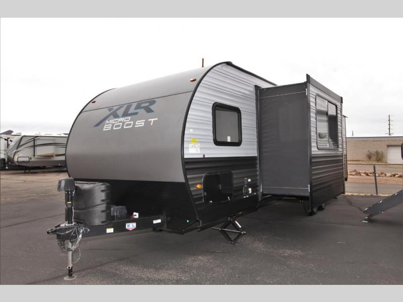 Each XLR Micro Boost toy hauler is made to last through years of use thanks to the seamless PVC roof system, the diamond plate front rock guard, and the Body Armor enclosed and insulated underbelly. You will appreciate the oil and gas resistant residential linoleum and the moisture barrier floor enclosure to keep your space clean, and the lightweight design will be perfect for smaller tow vehicles. Each model includes residential stainless steel sinks, decorative kitchen backsplash, solid core cabinet stiles, and large panoramic windows for breathtaking outdoor views. The exterior includes many convenient features to make camping easier than ever, including a pet leash for your furry friends, insulated storage doors, a hot and cold exterior shower, plus a friction hinge entry door. There is even a power awning with blue LED lights and two exterior speakers for the ultimate outdoor living space.