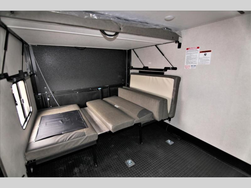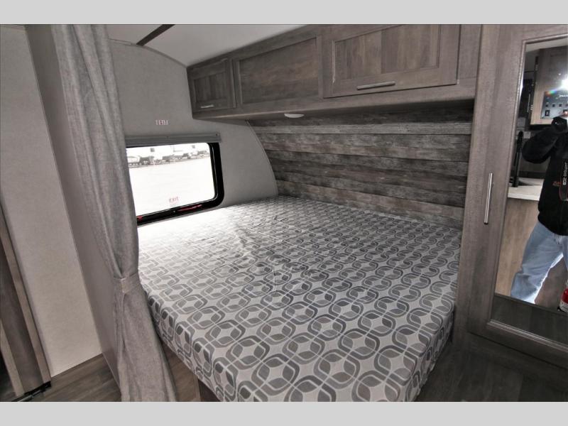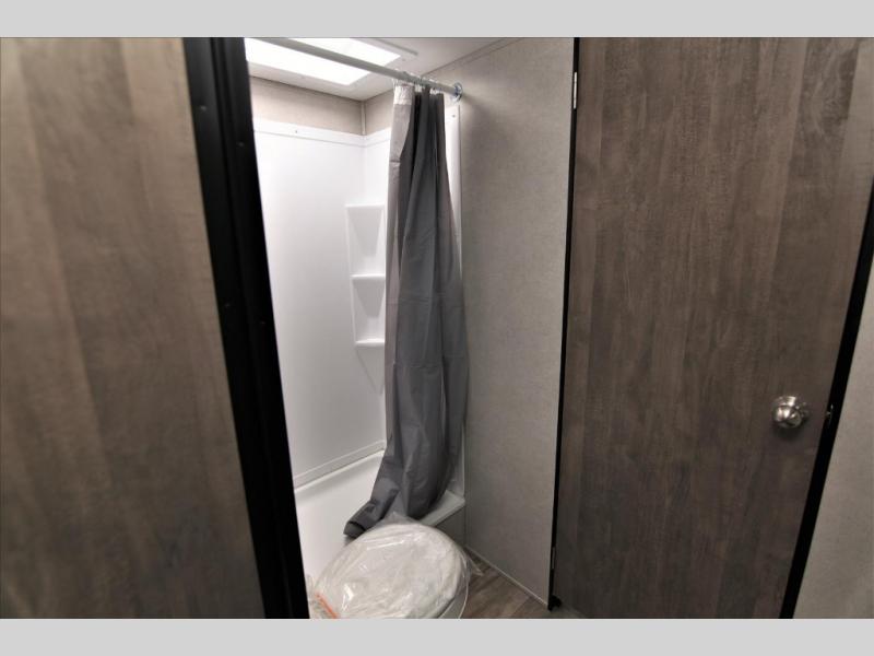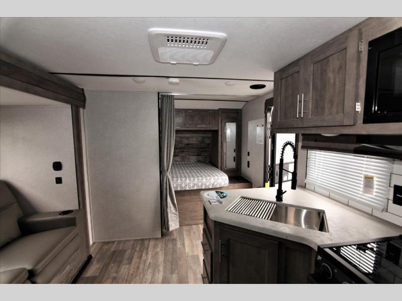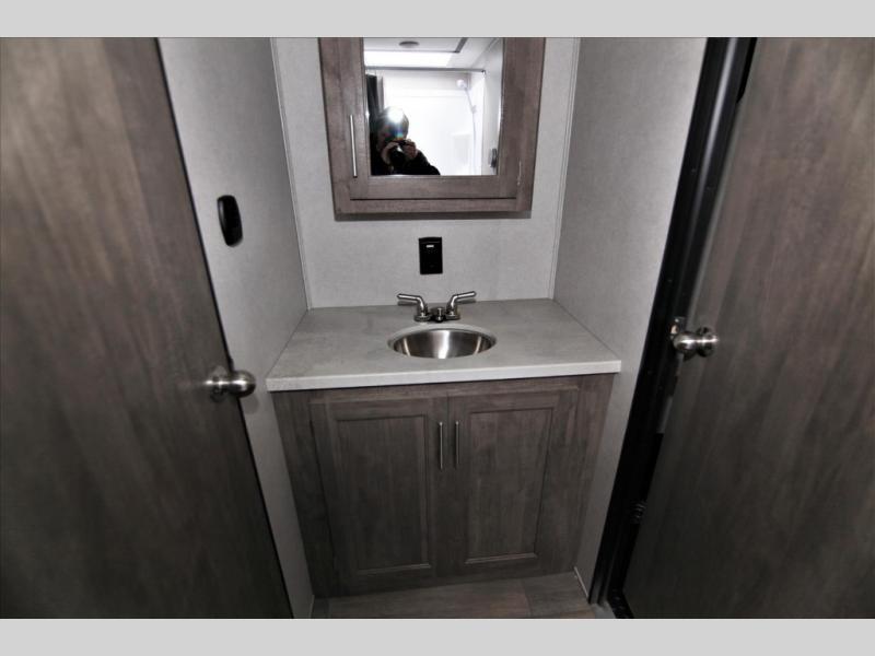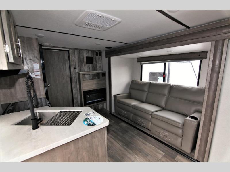 Dual entry doors in this travel trailer will make camping at your favorite state park easier than ever. Once your toys are unloaded, set up the patio deck for a cold drink. There is also Sit N Sleep sofas here and a Sleep N Store manual bed system for your guests to sleep on. Step into the walk-through bath to freshen up, then head to the full kitchen to prepare lunch on the three burner cooktop. You can relax on the theater sofa slide out, or take your plate outdoors to sit under the 15' power awning with LED lights. The RV queen bed in the front private bedroom will be calling your name after a day of fun, while your guests sleep in the separate garage. You can't beat this travel trailer!