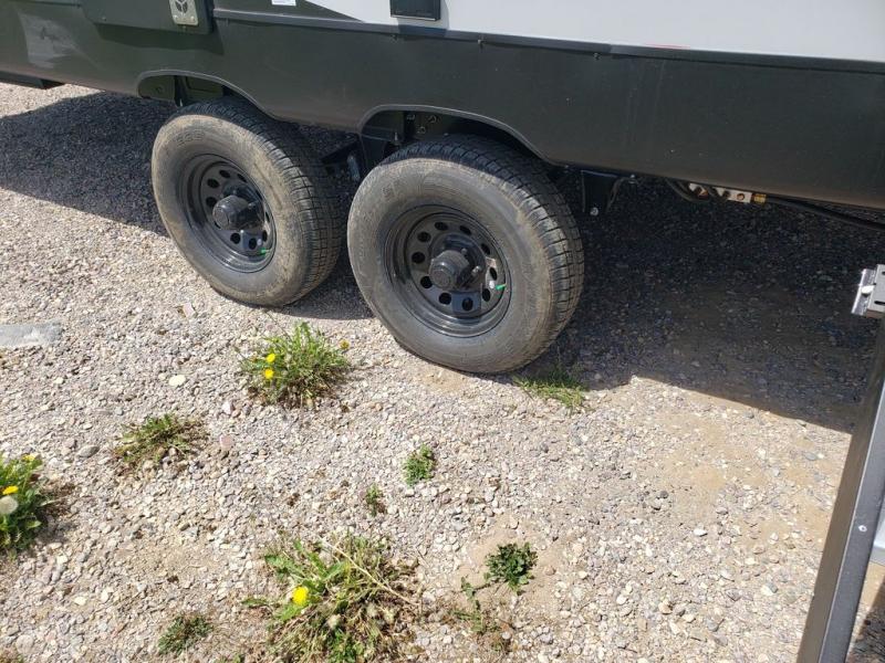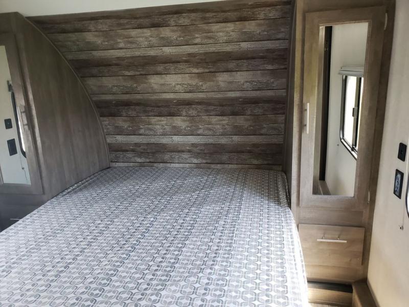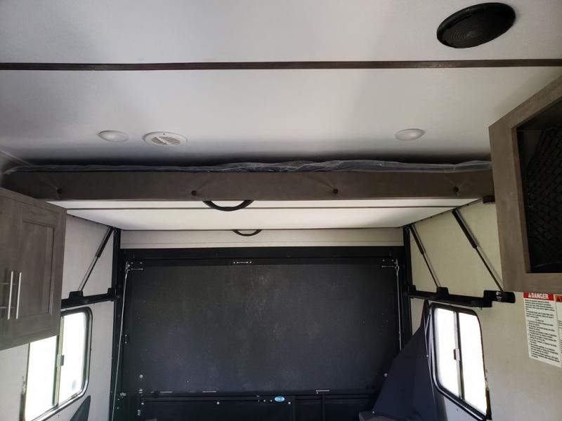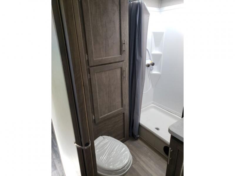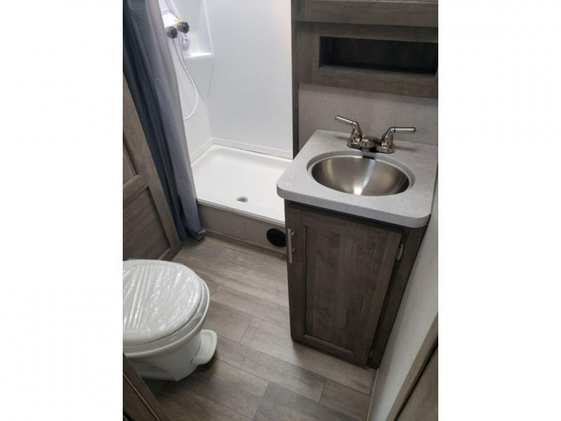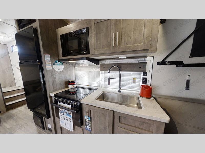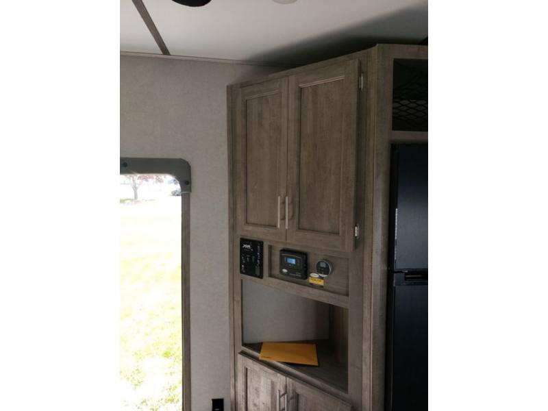 Pack your bags and head to your favorite camping spot in this fifth wheel for seven. The patio deck will be a big hit when entertaining guests, and if they decide to stay over, they can sleep on the Sleep N Store manual bed system. There are also Sit N Sleep sofas under the drop-down bed for even more sleeping space. While the chef of your group is preparing a meal on the three burner cooktop, everyone else can visit on the rollover sofa or the two barrel chairs. If you want a little more comfort, just choose the optional Euro recliners in place of the barrel chairs and you're good to go! The front private bedroom with an RV queen bed, night stands and beside shelves is sure to bring comfort, and you can clean up in the full bath before ending your day!