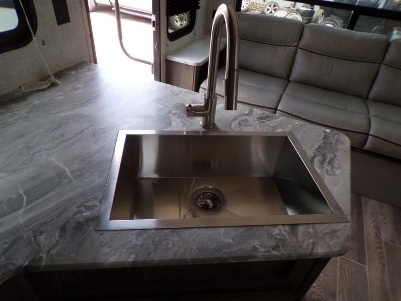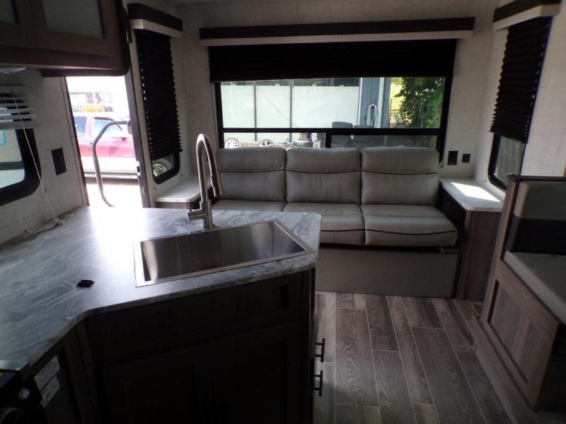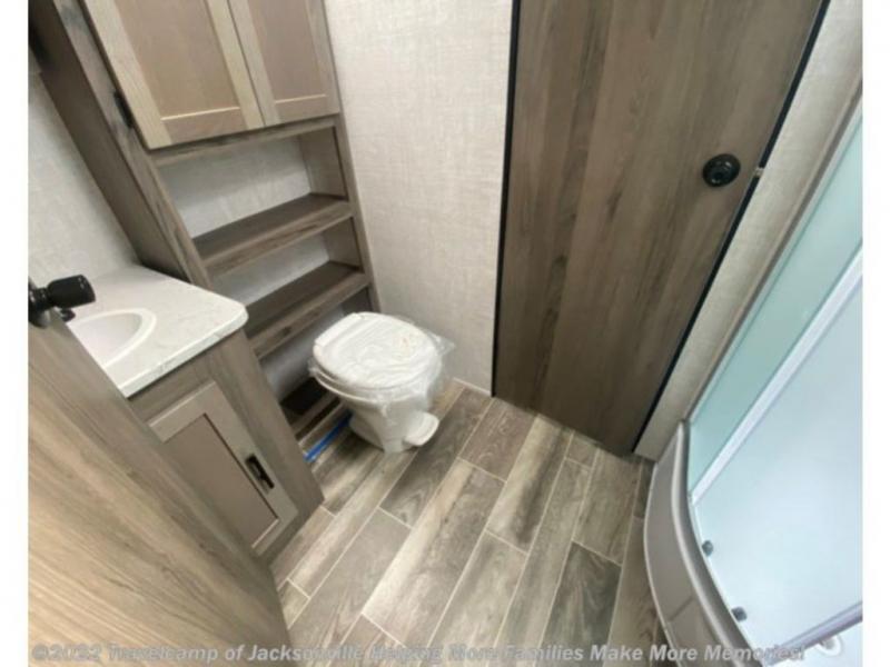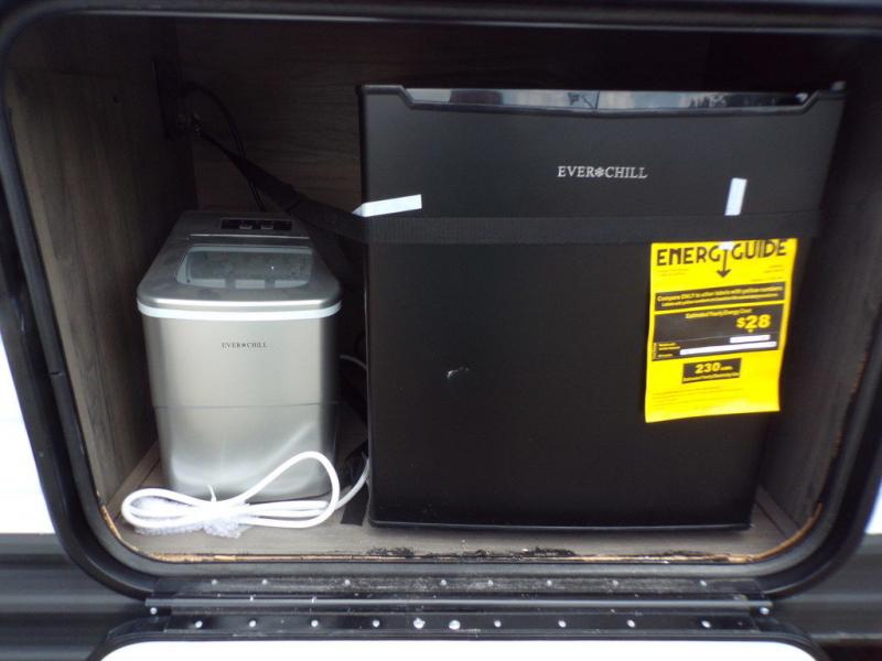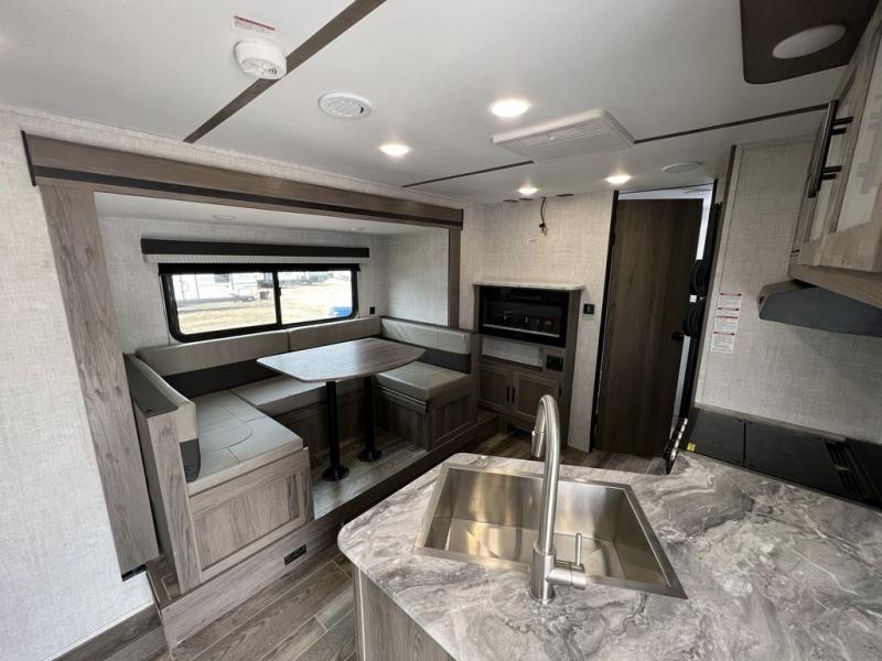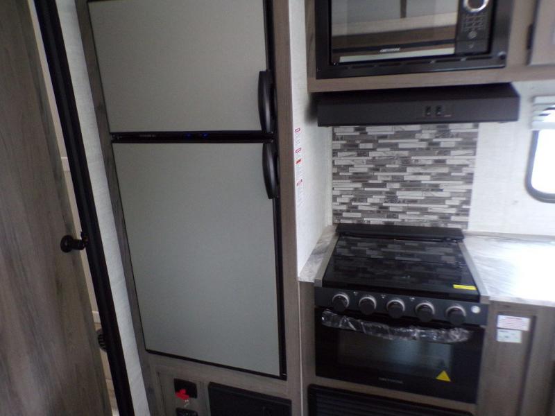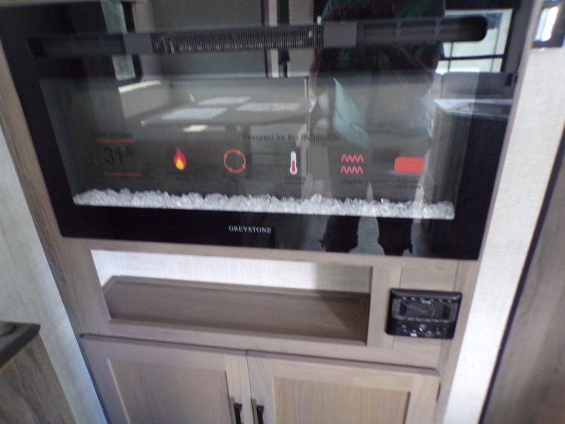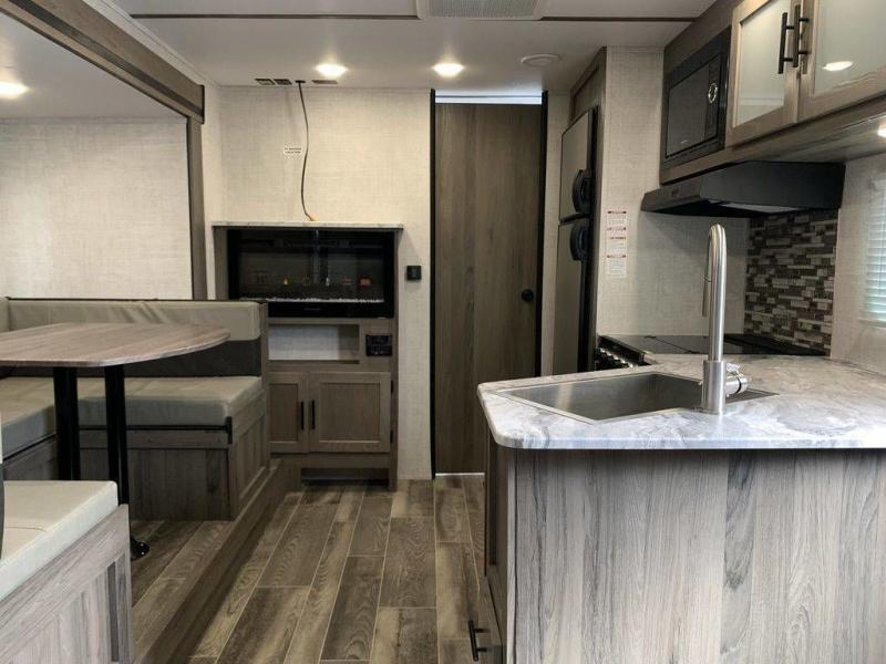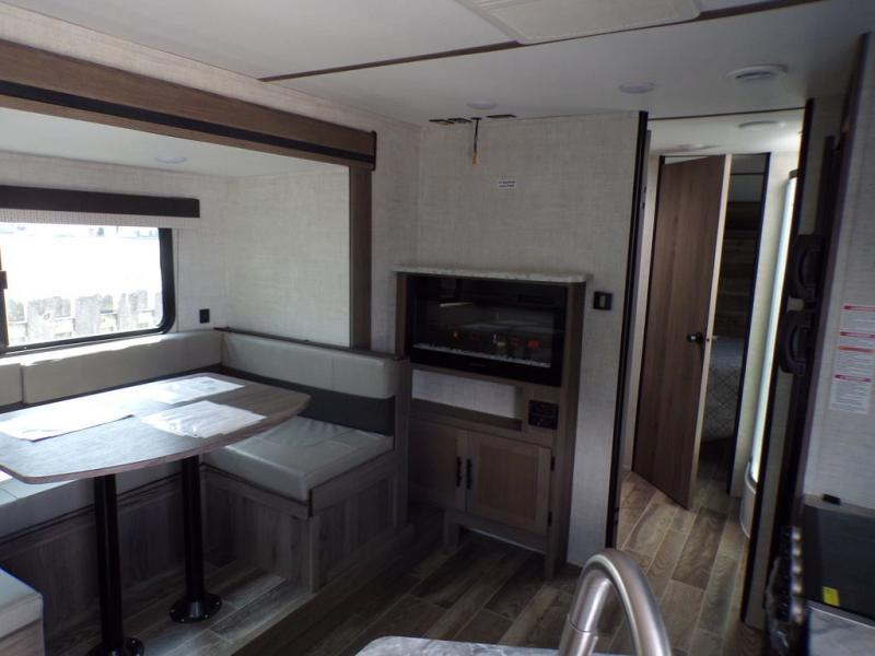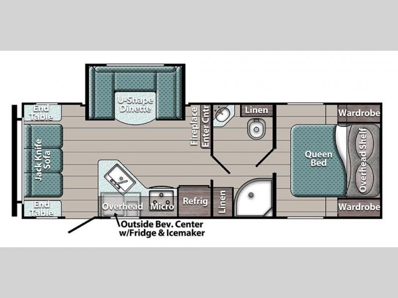 Make this comfortable travel trailer your home-away-from-home on the weekends. You will love having your own master bedroom up front with a queen bed and dual wardrobes for your clothes. The walk-through bath is spacious, allowing you to easily clean up each day. Your guests can sleep on the jackknife sofa or U-shaped dinette, and the fireplace here will make it feel more like home. This model includes all the appliances needed each day to prepare home-cooked meals, including a three burner cooktop, a microwave oven, and a 10.7 cu. ft. Everchill refrigerator/freezer. There is even an outdoor beverage center with a refrigerator and an icemaker to entertain guests!