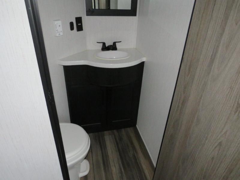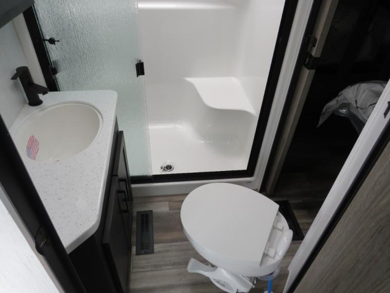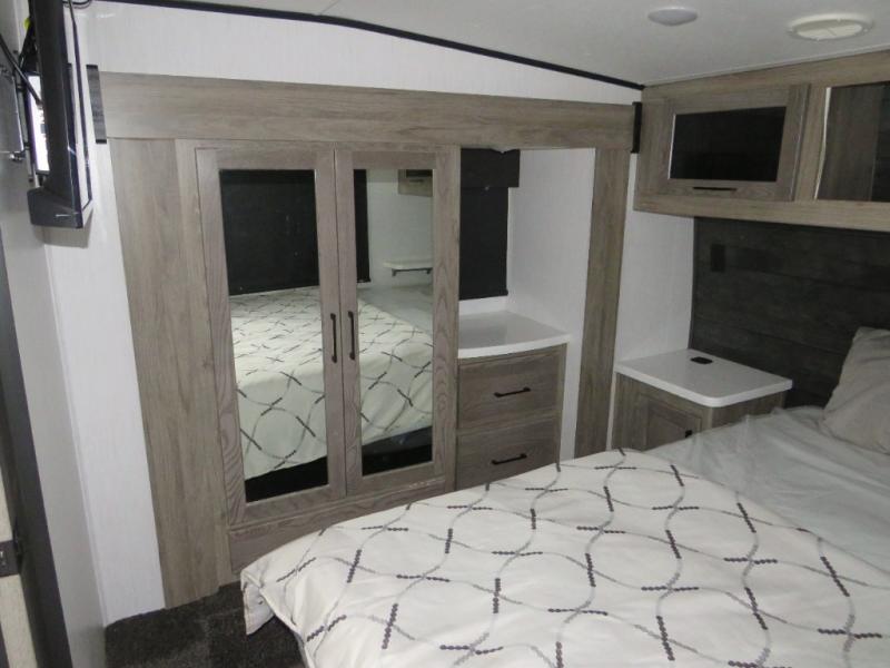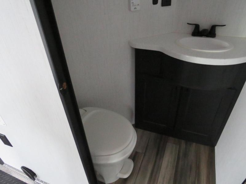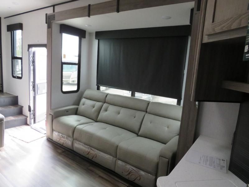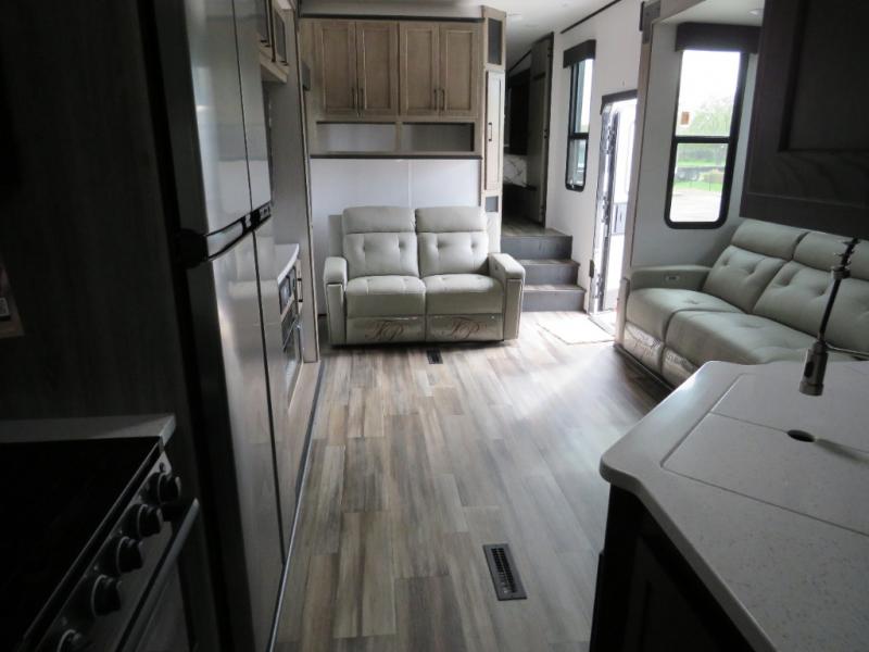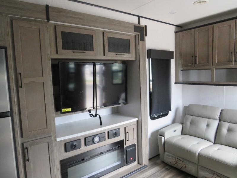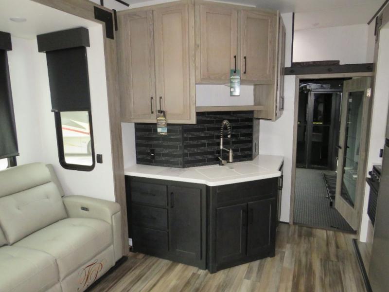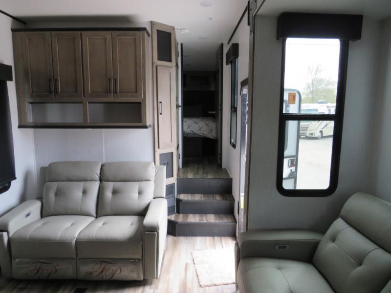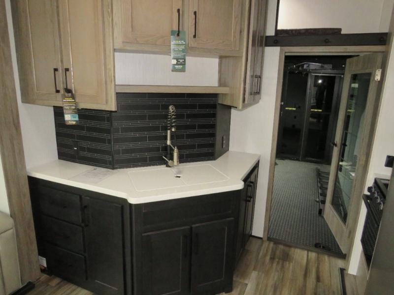 Whether you camp at RV parks, off-road destinations or your land, this fifth wheel offers comfortable accommodations after your rides, and a safe way to carry your toys with you anywhere! You will have your own bedroom up front with a walk-around king bed, a slide out wardrobe and dresser, and access to the double entry full bath which is convenient at night. Your guests can sleep in the overhead loft area and on the two sofas in the main living and kitchen area or in the garage if you decided to add the electric queen bed-split bench seat/bed option. The fifth wheel is spacious with three slide outs, and the cook will appreciate having full amenities to make meals and snacks for everyone. The 13' garage area offers a side man door to easily get to your toys and a half bath, plus there is a 30 gallon fuel station with a second 30 gallon aux tank along the exterior to keep the fun going!