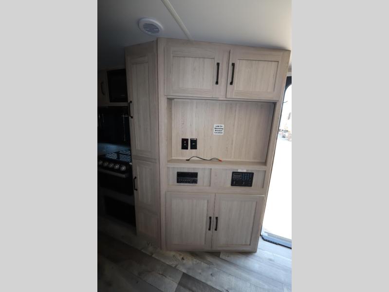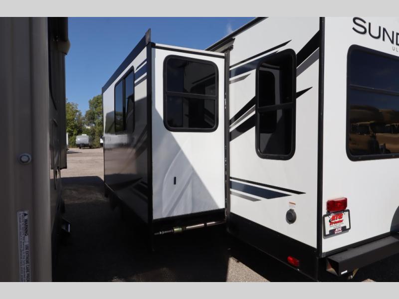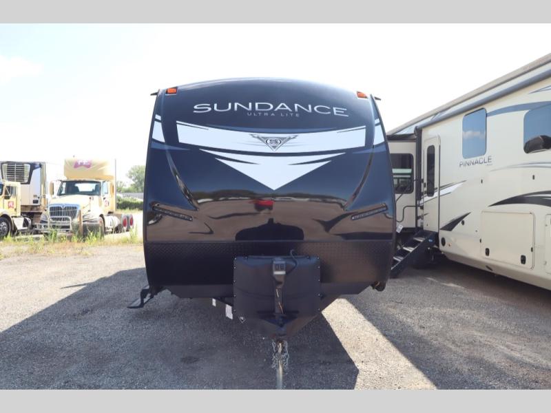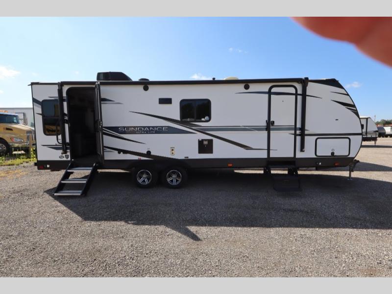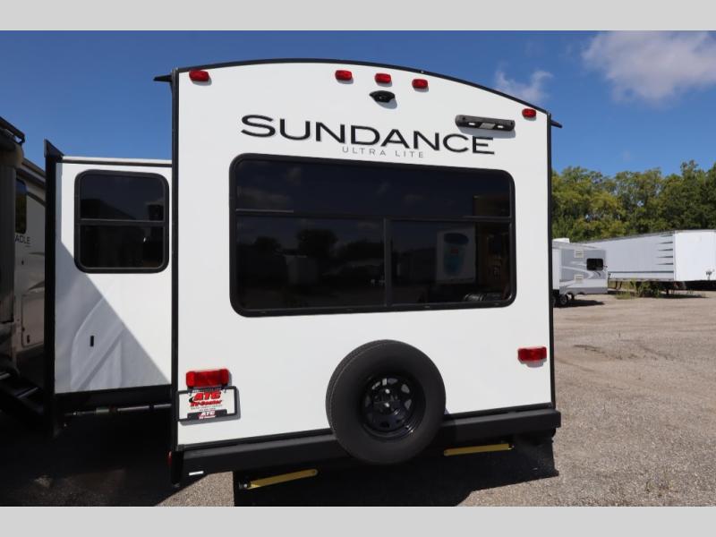 At the heart of every good vacation is this Sundance Ultra Lite travel trailer! You will love having easy access with two entry doors. These doors will allow you to directly enter the front private bedroom when you're outside, so you can come in to grab a sweater if you're getting chilly outside. The walk-through bathroom connects the bedroom to the rest of the trailer, and it offers you a skylight above the shower. The large slide holds the U-shaped and the 12V refrigerator, and it offers you more interior living space. The entertainment center is a great addition, and you can add the optional 39" LED TV.