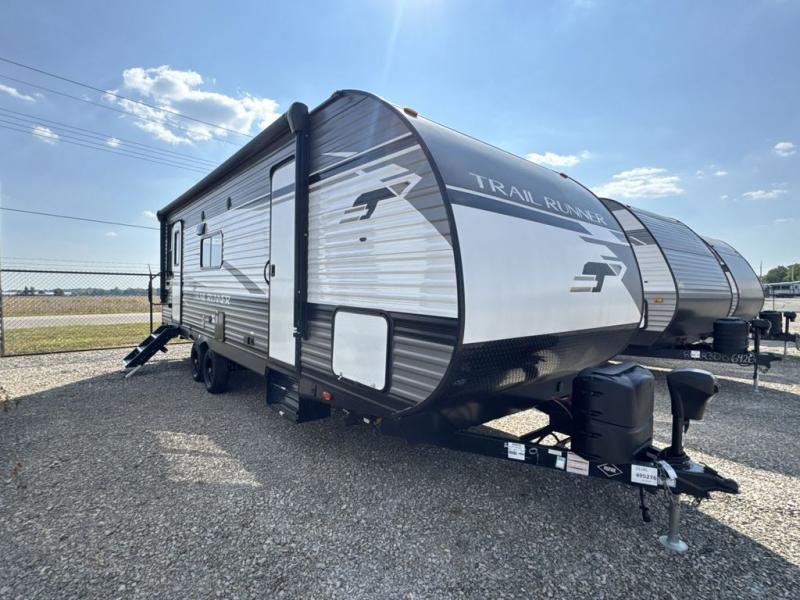 Paradise awaits at the end of the trail with one of these Heartland Trail Runner travel trailers! Experience better wind and water deflection, added strength, and a reduction of tongue weight with the hybrid aluminum front profile that has an aerodynamic radius front cage. A cambered structural steel I-beam frame holds them together and a heated enclosed underbelly protects the units vitals. There is an industry leading mammoth storage space of 57 cu. ft. pass-through storage so you can bring all of your outdoor gear with you. Roller shades in the main living area, woven flooring in all slide rooms, master suites with CPAP storage, and upgraded pressed counters give you the at-home feel you desire. Come find the perfect model for you today!