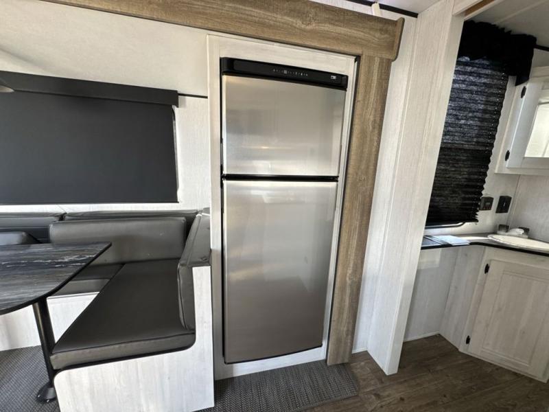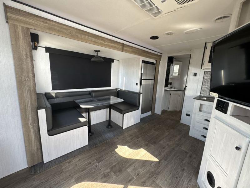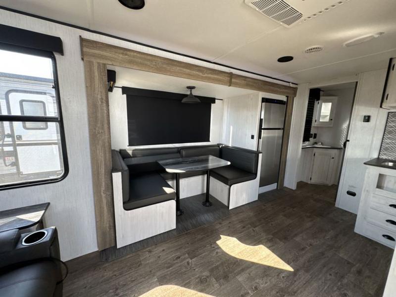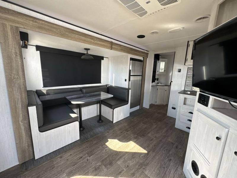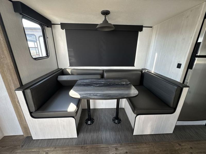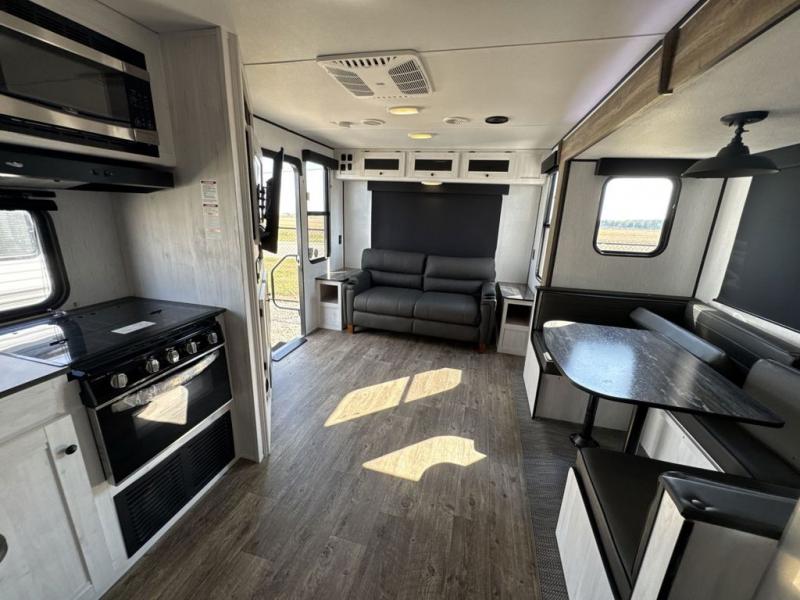 With dual entry doors, you will experience a smooth flow of traffic in and out of this travel trailer! One of the entrances even leads directly into the front master suite with a queen bed that has under-bed storage and wireless cell charging stations, plus an entrance into the walk-through bathroom. Prepare your best home cooked meals with the three burner cooktop and 10 cu. ft. stainless steel refrigerator then enjoy them at the U-shaped dinette slide. Relax each evening on the rear sofa across from the optional LED HDTV if you chose to add it or head outside to relax underneath the 20' power awning with LED light strip to highlight the good times!