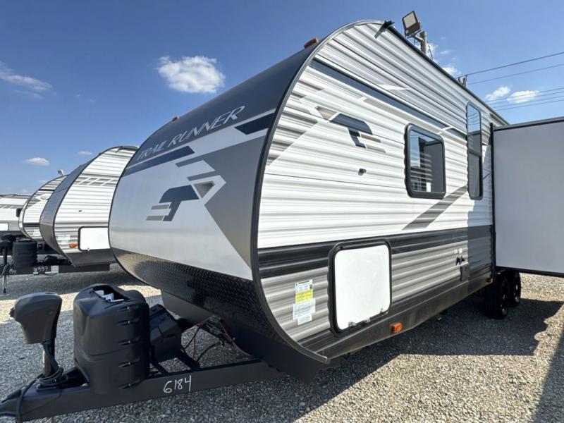 Paradise awaits at the end of the trail with one of these Heartland Trail Runner travel trailers! Experience better wind and water deflection, added strength, and a reduction of tongue weight with the hybrid aluminum front profile that has an aerodynamic radius front cage. A cambered structural steel I-beam frame holds them together and a heated enclosed underbelly protects the units vitals. There is an industry leading mammoth storage space of 57 cu. ft. pass-through storage so you can bring all of your outdoor gear with you. Roller shades in the main living area, woven flooring in all slide rooms, master suites with CPAP storage, and upgraded pressed counters give you the at-home feel you desire. Come find the perfect model for you today!