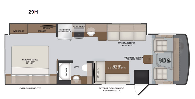 No matter where your destination may be, you can get there in style with this motorhome. The full-wall slide will provide space for the kids to play with the dog on the floor, and the centrally located full bath will be convenient for everyone. Head outside to stretch your legs around the campground, then put out the electric awning with LED lighting. You'll find an exterior kitchenette with a mini-fridge, microwave, sink and storage that will come in handy when entertaining guests. If the weather isn't cooperating outside, head indoors to play a game at the L-shaped dinette. The kids can climb into the Hide-a-Loft drop-down queen bed for a rest, or relax on the jack knife sofa. You and your spouse will appreciate the rear private bedroom all to yourselves that includes a Serenity Series king bed, a dresser and a wardrobe for your clothes, plus a 32" LED TV to catch up on the nightly news!