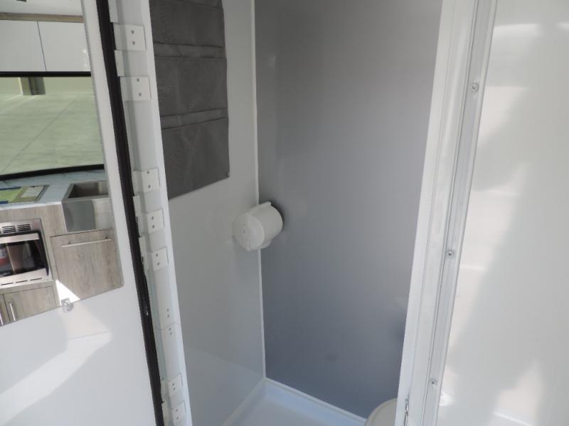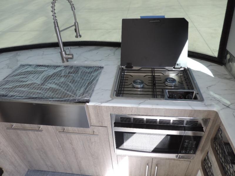 This Eclipse travel trailer will be the perfect companion on all your excursions. The large farmhouse style sink in the front kitchen provides plenty of space to clean up after dinner, and the stainless steel microwave will be perfect for popcorn and game night. There is a U-shaped convertible dinette that will be your sleeping space at night, and the wet bath on board eliminates your need to use the camp's facilities. You won't have to worry about being bored on those rainy days since this model includes a 32" TV and a Bluetooth stereo with four speakers!