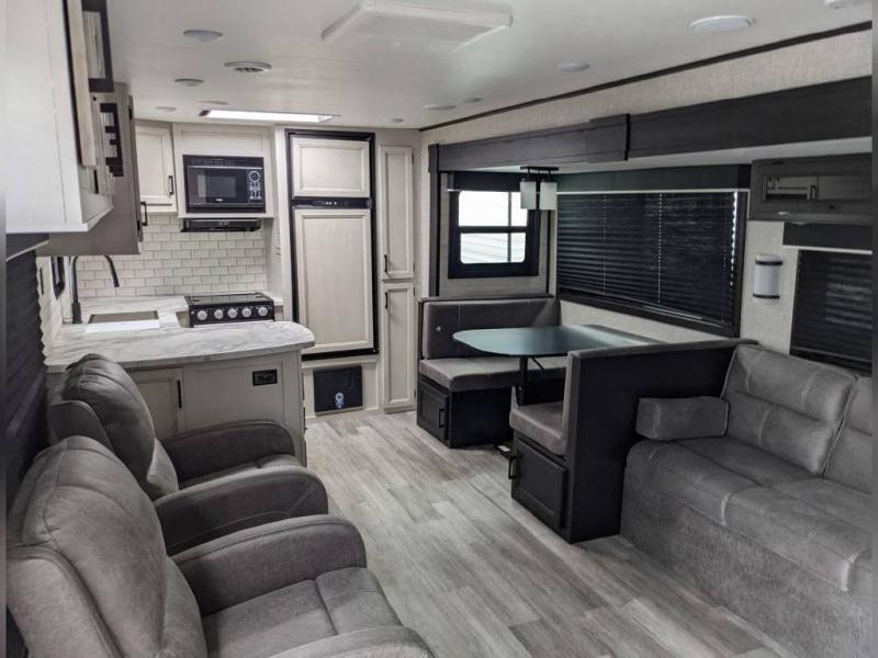 Just plan on never wanting to leave this Jay Flight travel trailer! You'll have everything you need. The queen-size bed is located up front in the private bedroom that is connected by a private entrance into the dual-entry bathroom. This creates a great master suite for the owners. If you have friends or children tagging along, they can sleep on the jackknife sofa or booth dinette once you fold them into position, and there are two lounge chairs that can be used for late-night movie watching. A large slide keeps this space open, and the rear kitchen is loaded with amenities, like a three-burner range, 8-cubic foot refrigerator, microwave, and oven with glass door. You'll also have a pantry for storing various foods.