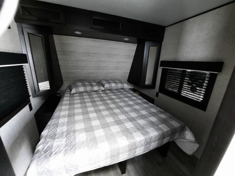 Check out the #1-selling Jayco Jay flight travel trailer! These trailers are built upon I-Class™ cambered structural steel I-beams and a fully integrated A-frame. They have axles with electric, self-adjusting brakes and easy-lube hubs to make your journeys smooth, and the Magnum Truss roof system will withstand many years and types of travel. You'll have large exterior downspouts, a front diamond plate, four stabilizer jacks, and a friction-hinge entry door with shade-prep window. The interior is where you'll find great comfort and modern design. There are residential-style kitchen countertops, solid hardwood cabinet doors, a premium multimedia sound system, a full-height kitchen backsplash, a kitchen skylight with shade, and a deluxe bedspread with pillows.