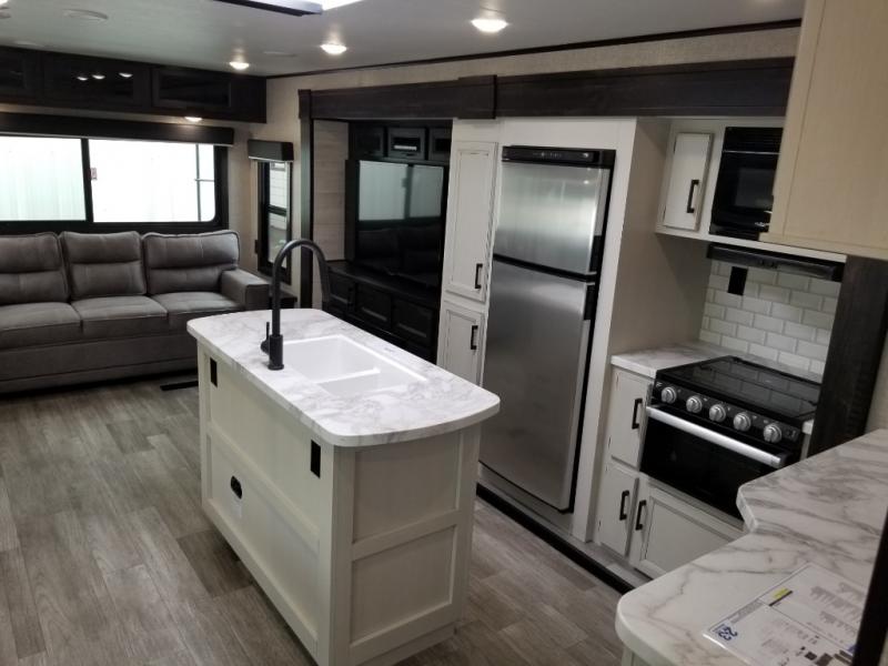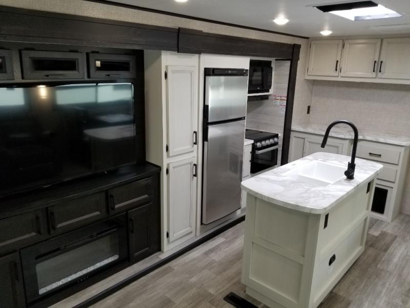 This Jay Flight travel trailer is very similar to the most popular fifth wheel floorplans on the market today, now available in a travel trailer! The fireplace sits below the entertainment center, and both items are across from the theater seating. You'll also have a hide-a-bed sofa right there so that others can join in on the relaxation, and the upgraded free standing dinette table and chairs is situated next to the theater seating so that it can also be used as seating during movie nights. A kitchen island adds function to the kitchen, and it also serves as a great dishwashing station. You can cook just about anything on the three-burner range, and the pantry will help you store your snacks. You'll also be able to access the dual-entry bathroom from the main hallway or the front bedroom.
