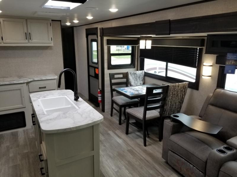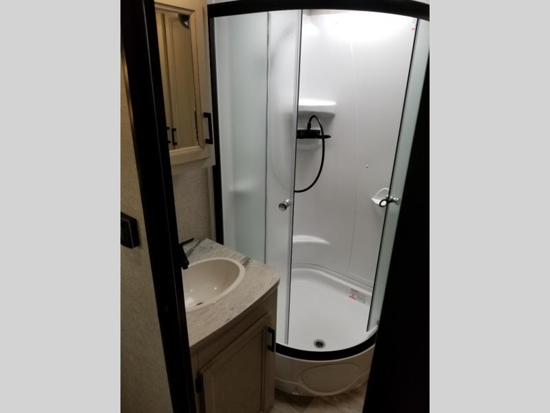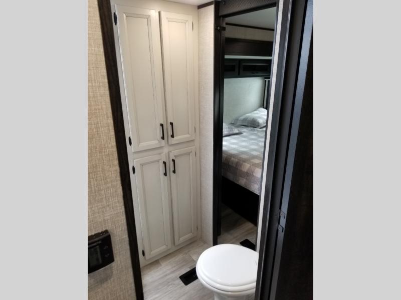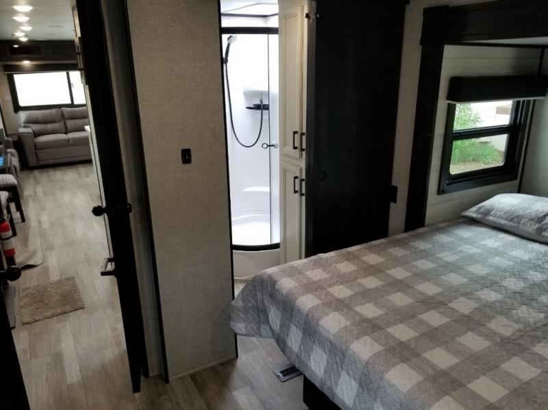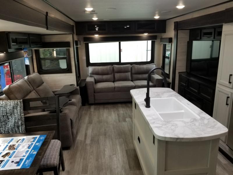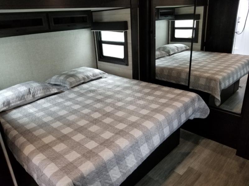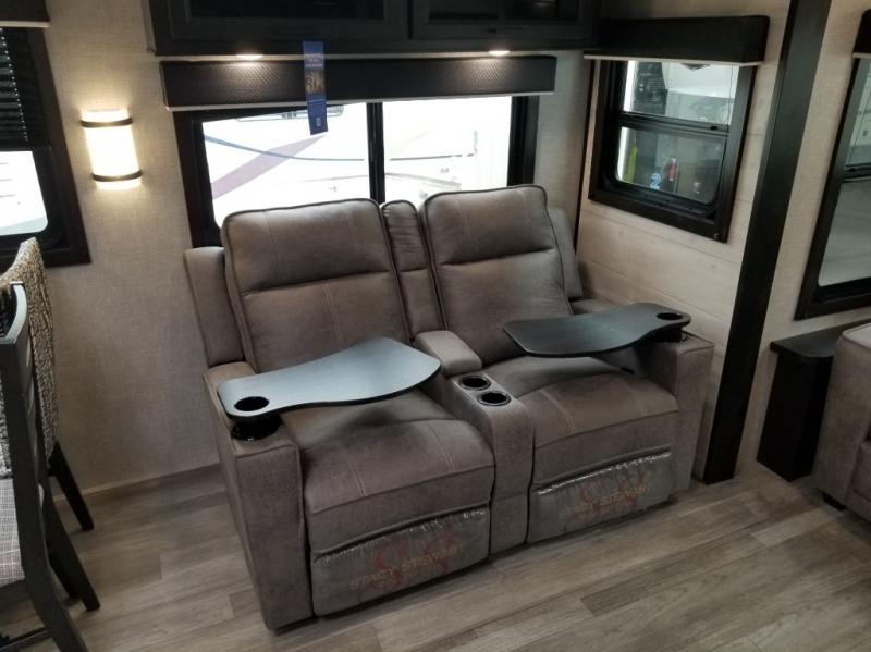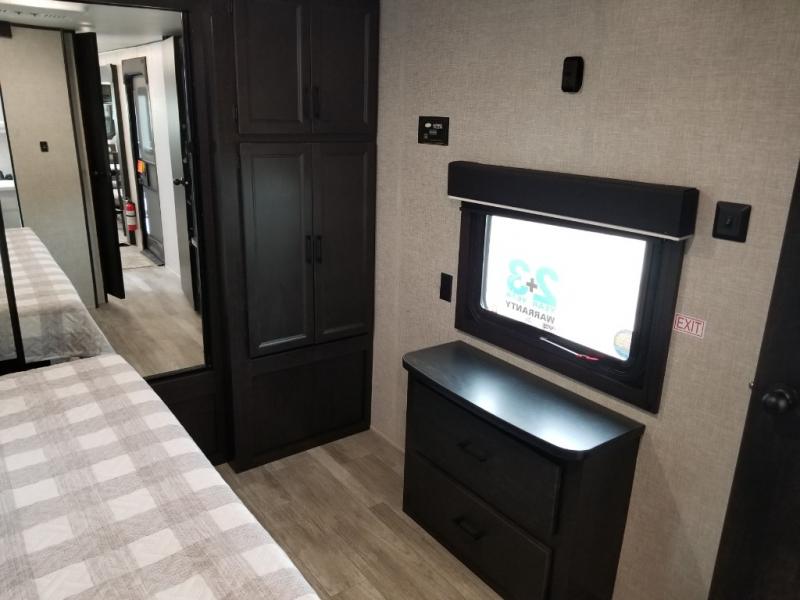 What I liked most: Triple slide creates a lot of space in the kitchen living dining area. Two recliners plus the couch is a lot of seating. Built in entertainment area with fireplace. The television is setup behind a cabinet door border that opens and reveals extra storage space. Bathroom has two door entry. Lots of storage in the bathroom. Bedroom feels very open with double slide closet mirror and plenty of storage. A pretty neat digital device charging center as well.