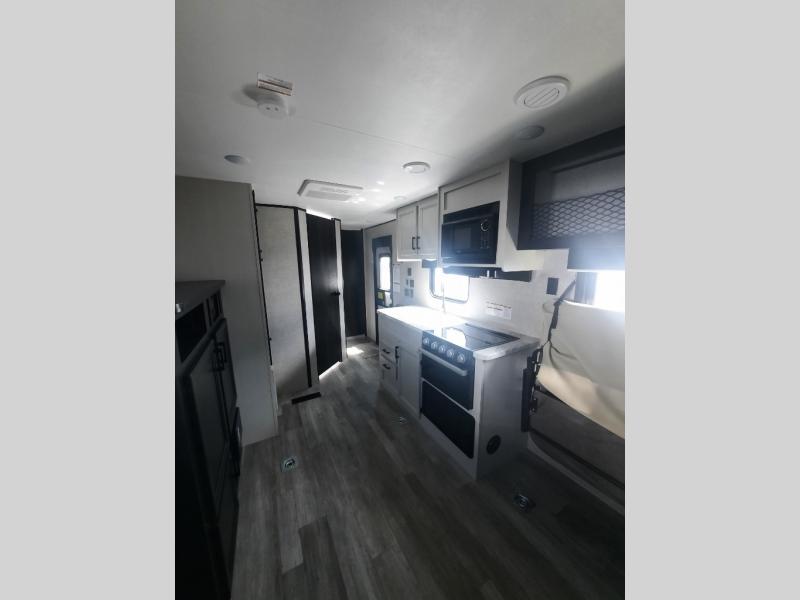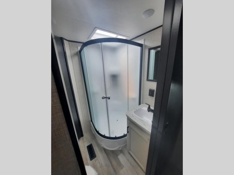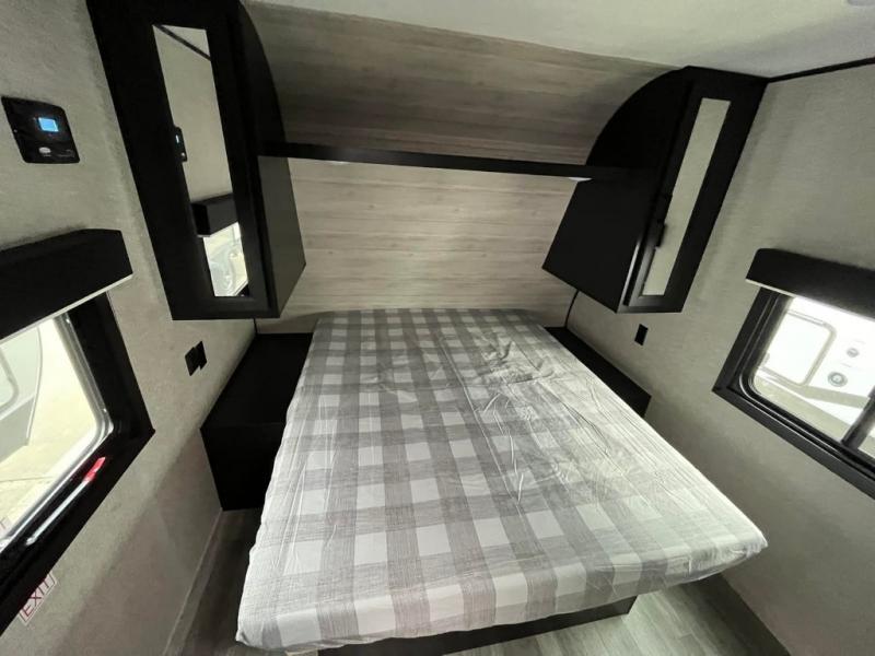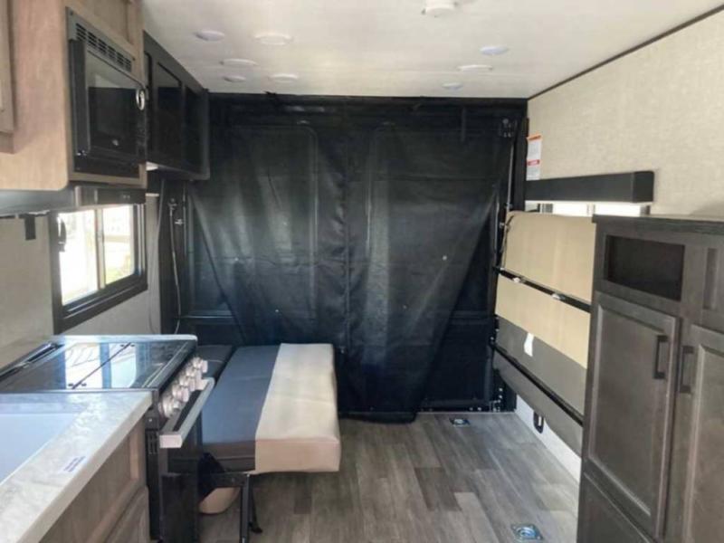 It's time to load up your off-road toys into a 5'11" cargo area with a little more space for gear that stretches into the kitchen area. Once unloaded, you will have convertible sofas and a removable table to enjoy meals at, plus the sofas offer sleeping space. You will have full kitchen amenities including a large pantry, and there is a double entry full bathroom with access from the main living area and kitchen as well as the front private bedroom. You will sleep like a queen, and there are windows to look outside at the weather and dual wardrobes to stow your clothing.