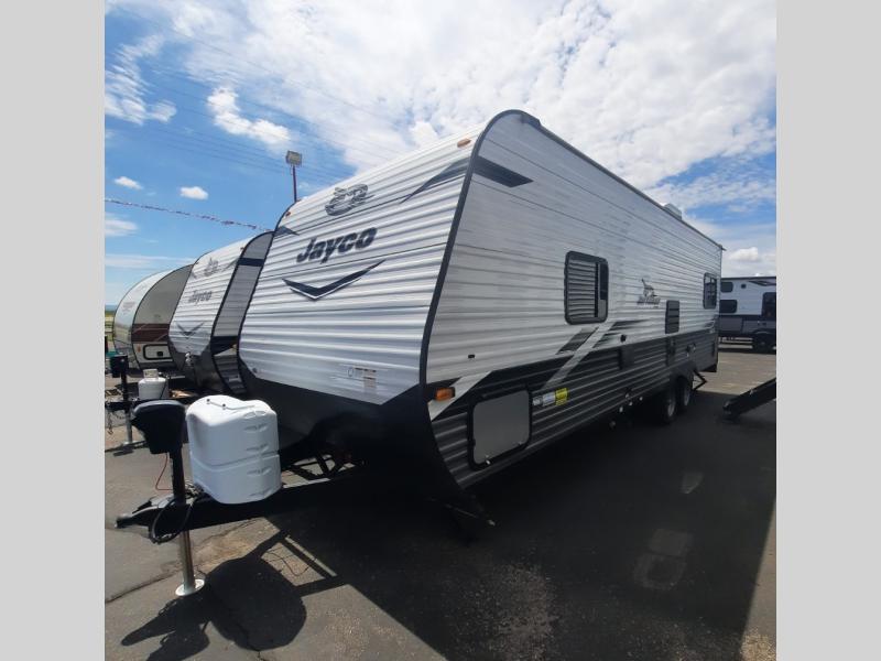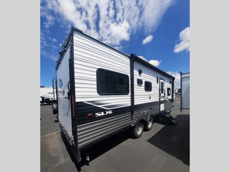 With any Jay Flight SLX 8 travel trailer by Jayco, you will have a durable foundation with l-Class cambered structural steel l-beams, a fully-integrated A-frame, seamless roof material and a Magnum Truss Roof System with plywood decking for a 50% stronger roof than any other in the industry. Also included are Goodyear Endurance tires made in the USA, and a front diamond plate to protect against road debris. Inside, you will love the fresh interior design, the solid hardwood cabinet doors, the 81-inch tall ceiling, the energy-saving LED lighting, and the storage. Whether you are looking for an RV for a small or large group, you will find a Jay Flight SLX 8 to fit your camping lifestyle!