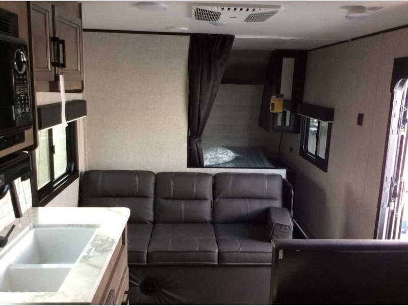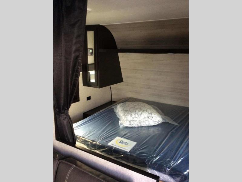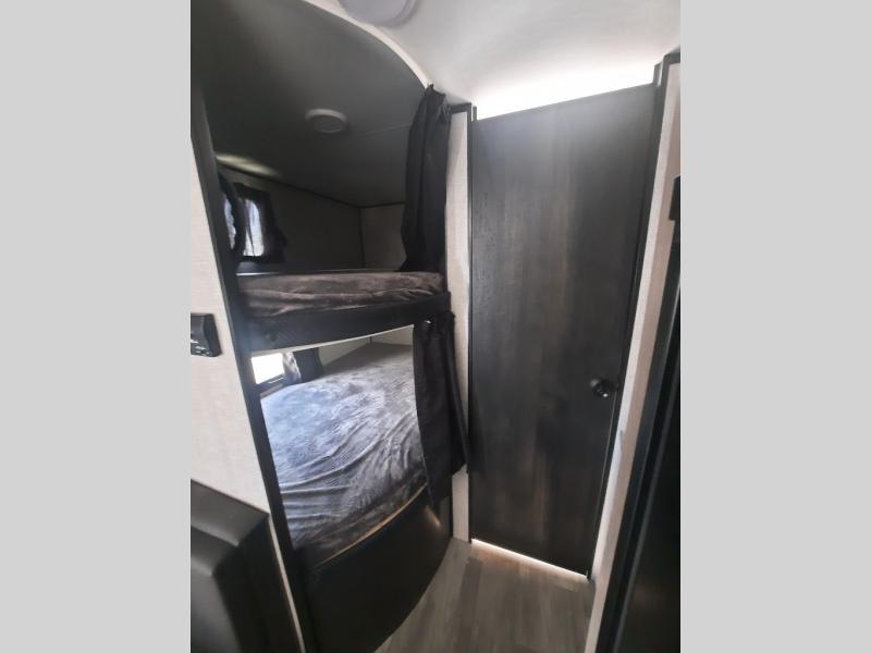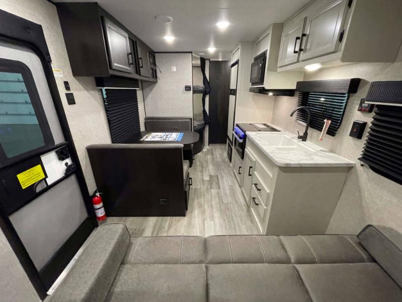 This family-friendly trailer offers you a queen bed in the front, the kids a set of double-size bunks so they can invite their friends to stay the night with them or on the furniture that doubles as extra sleeping space. This is the Baja edition, so you have added clearance to get you even further off the beaten path to enjoy even better spots on your adventures.