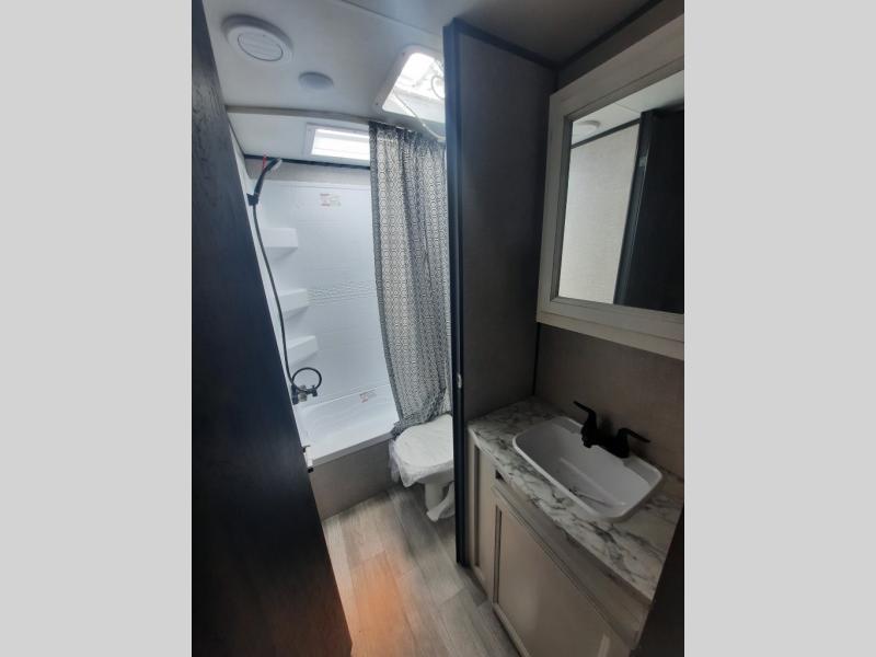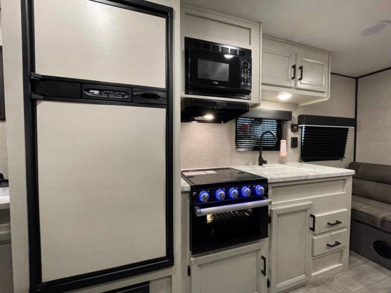 The chef of the family will have a three-burner range and microwave to whip up meals, plus a 6-cu. ft. refrigerator to store leftovers. The toilet and tub/shower room allows everyone privacy when changing, and the bathroom sink is just outside the door allowing some to wash their face while another is taking a shower. And don't forget about the 16' power awning that offers protection from the elements, and you might like to add the Chil N' Stor option if you want cold food or beverage storage along the exterior.