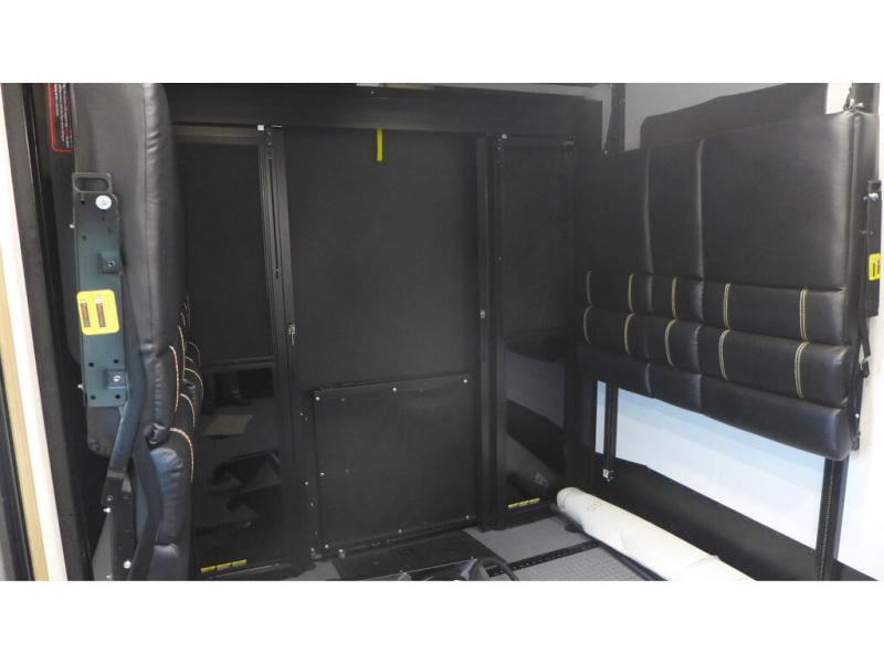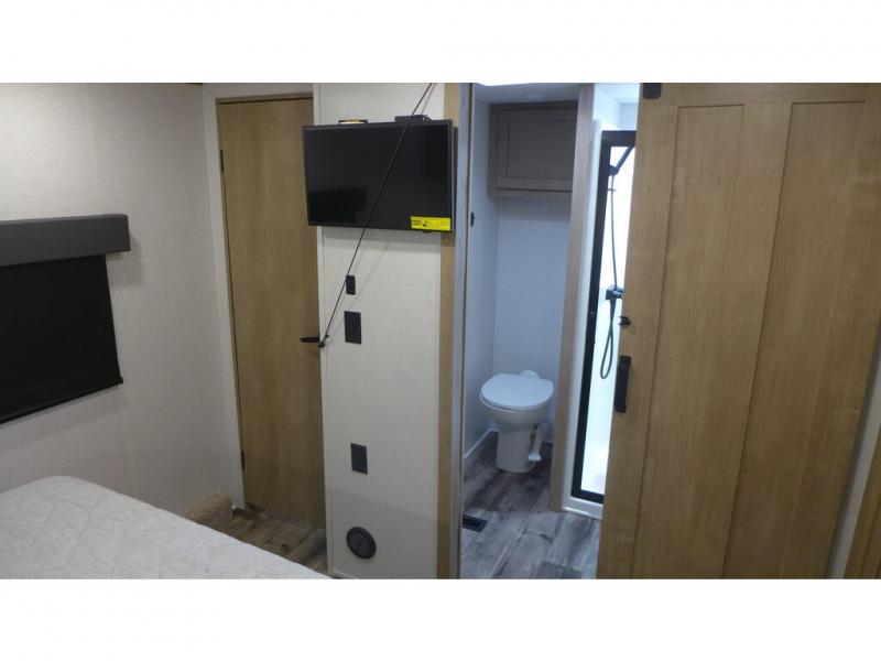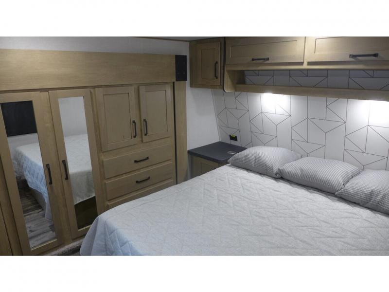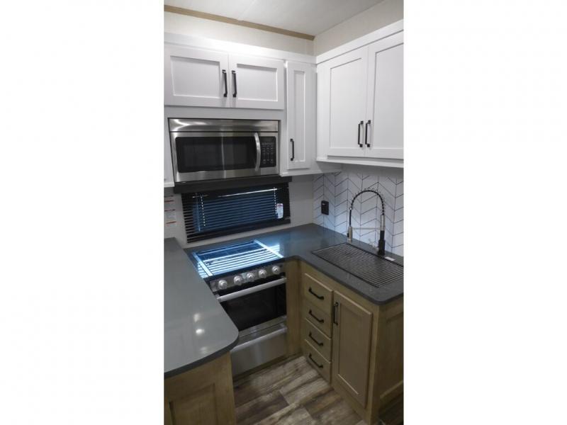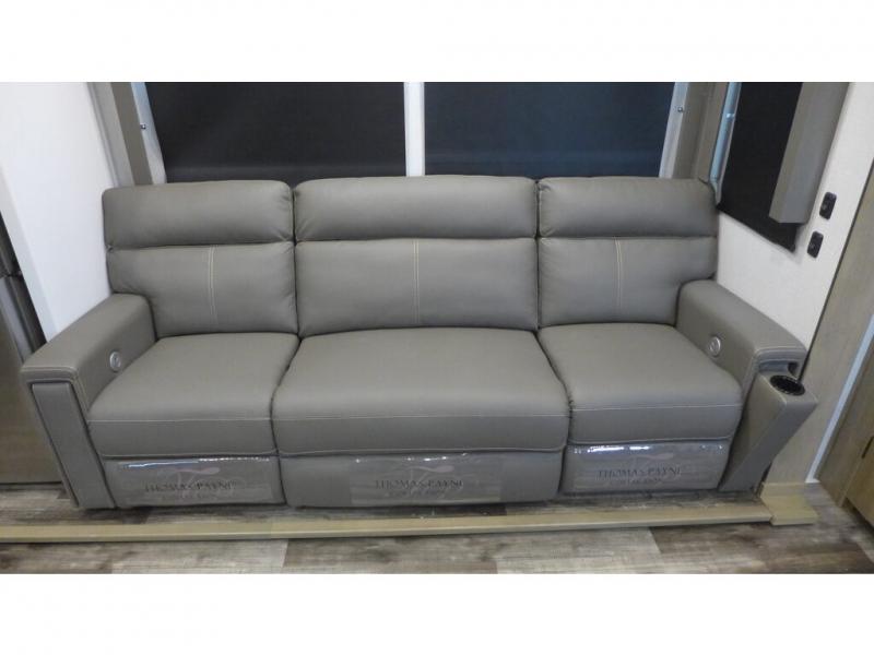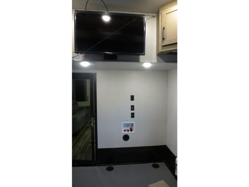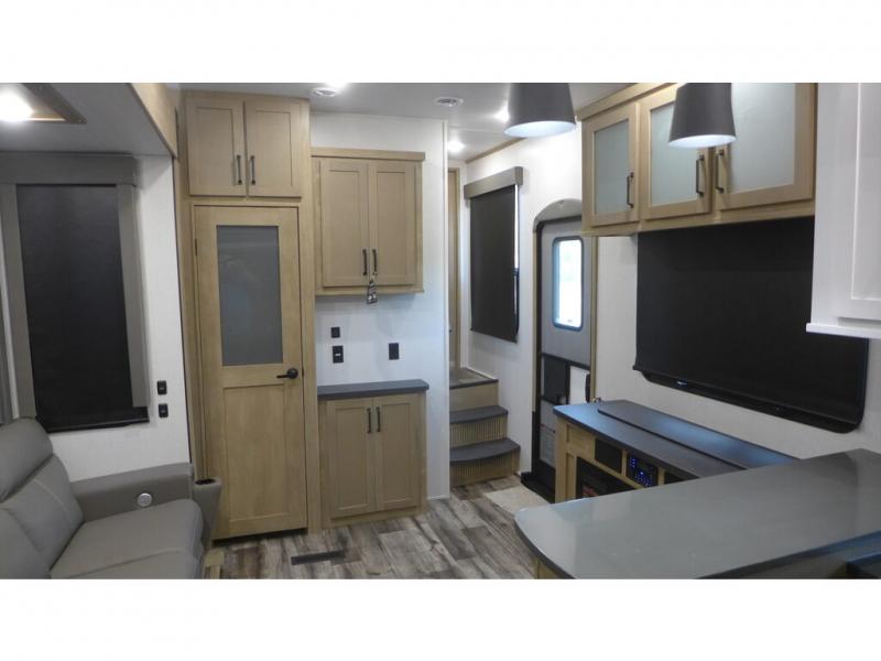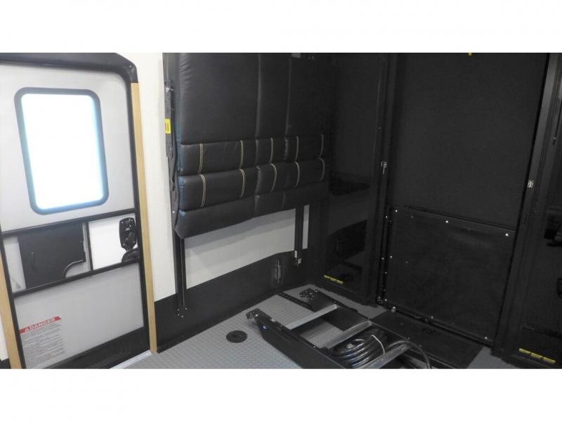 You won't believe all that this toy hauler has to offer! Starting with the dual entry doors, one of which leads into the 11' garage area with an electric bed above dual opposing sofas with table in between, a loft with twin bed, and an area prepped to add an optional washer and dryer. The chef can prepare their best home cooked meals with the three burner cooktop and store everyone's favorite snacks in the two pantries. Relax in the 3-seat recliner across from the pop-up TV and fireplace for a cozy evening indoors or head to the outside entertainment center with a TV and mini refrigerator. The dual entry bathroom makes it easy for everyone to access especially those staying in the front private bedroom which has a residential queen bed that can be switched out for an optional Raptor king bed, wireless phone chargers on either side of the bed, and a wardrobe slide to keep your clothes looking nice!