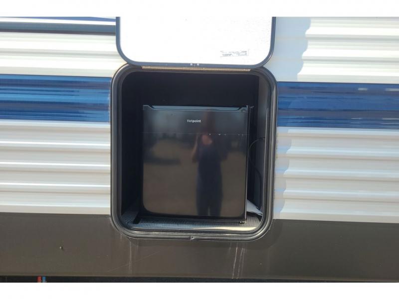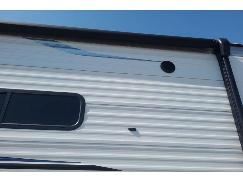 If you want a quick weekend trip or a longer week in the woods, this travel trailer is going to be your best choice because it has everything needed to enjoy your time away! There is a large slide in the main living area to provide you with some extra floor space to relax on the sofa, and the booth dinette will be a cozy spot to sit down with a hot meal. You can use the three-burner range to prepare that meal, the L-shaped counter to serve your meals from, and you can store some canned goods and snacks in the pantry. The fireplace makes this combined space cozy especially during those chilly camping evenings. And the 21' power awning is available for use whenever you want to relax outdoors, just grab your camping chairs from the front pass-through compartment.