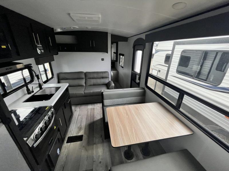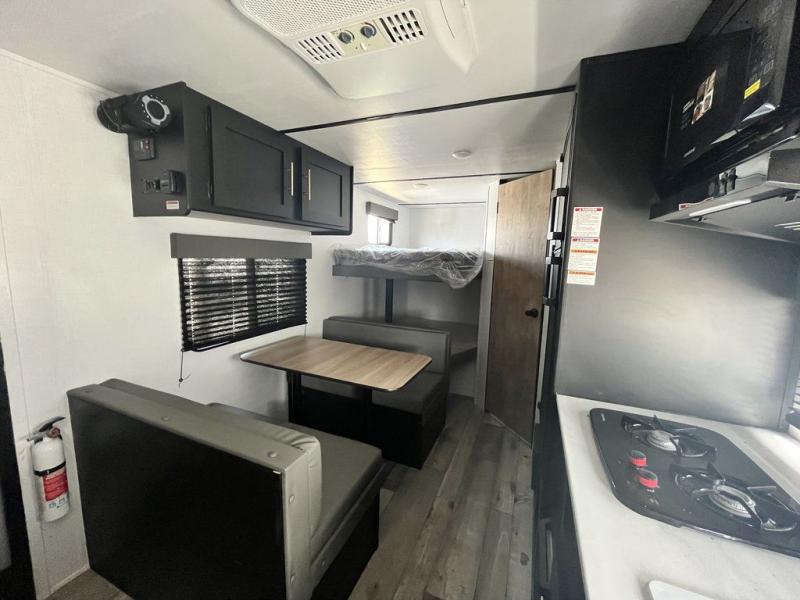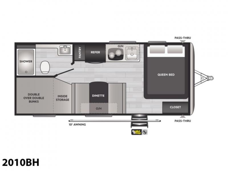 This double axle trailer offers lots of sleeping space for your family and friends with the double-size bunk beds, the queen bed and the booth dinette. Once everyone selects their sleeping space, you can take turns getting cleaned up in the full bathroom with extra counter space for everyone's toiletries. The cook can whip up a snack before bedtime on the two burner cooktop or grab something from the 6 cu. ft. refrigerator and the pantry. There is a closet up front, overhead storage throughout, and inside storage under the bunk for everyone's things. And the exterior provides a pass-through compartment for more items and the outdoor gear like fishing poles and camping chairs.