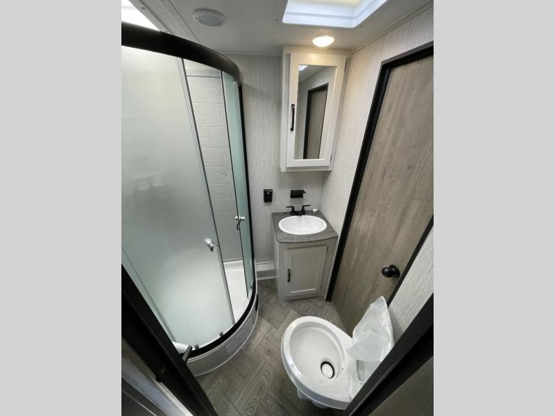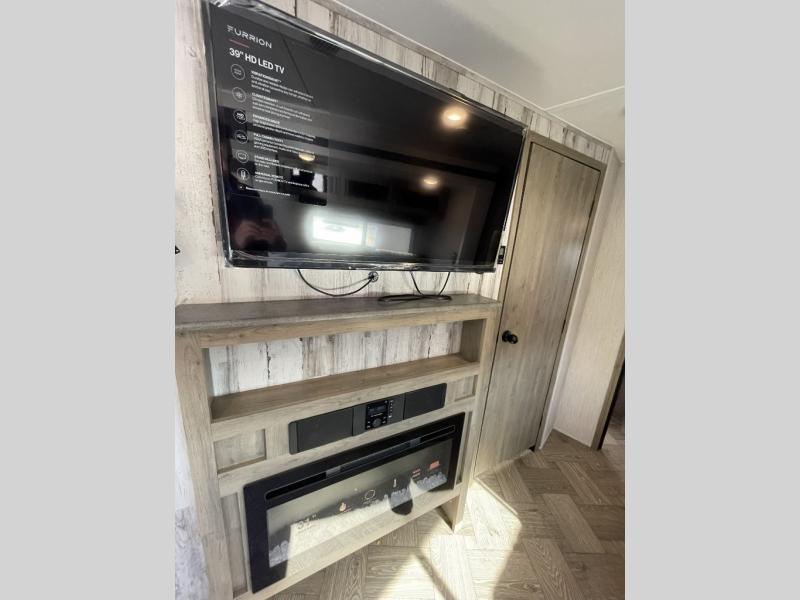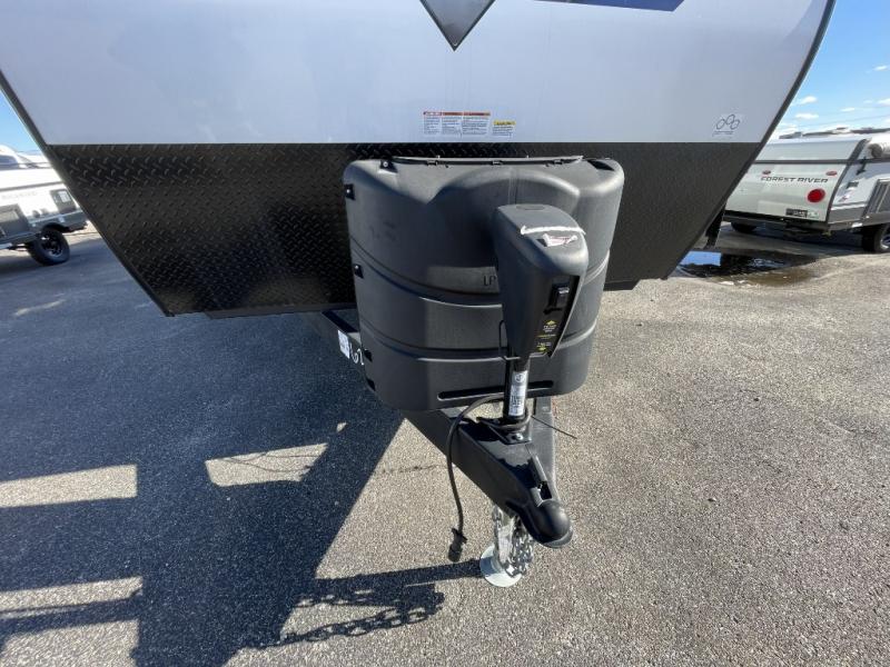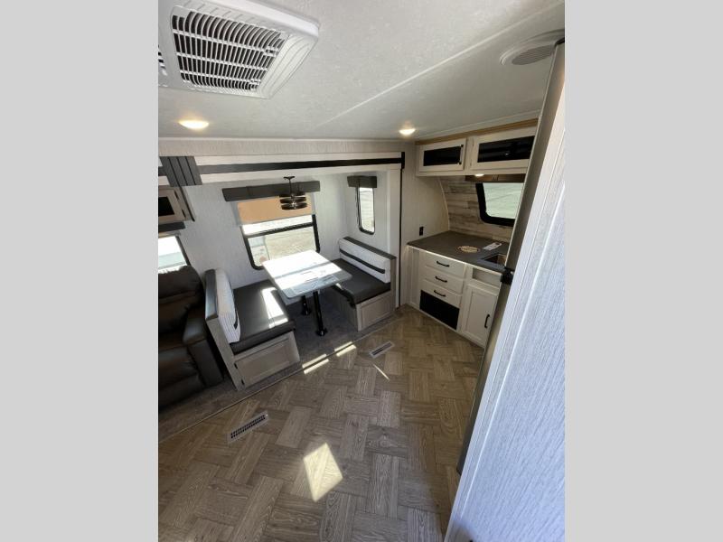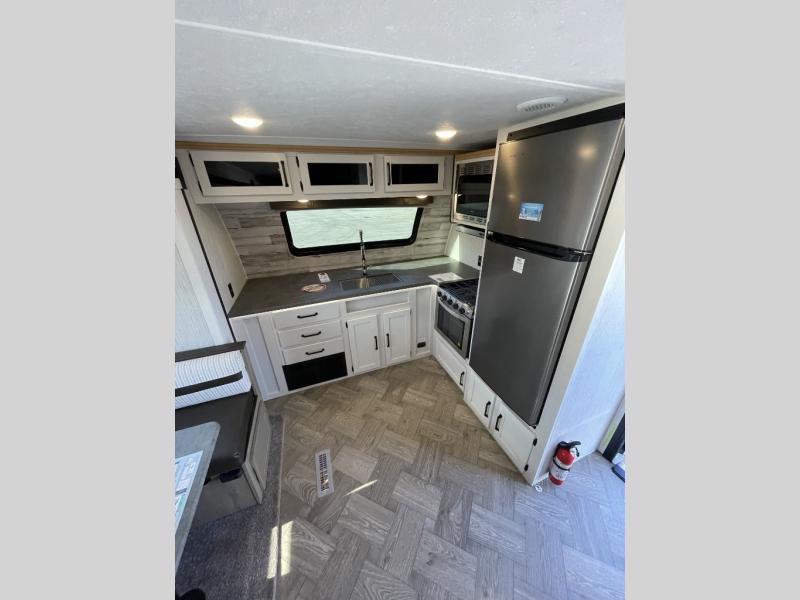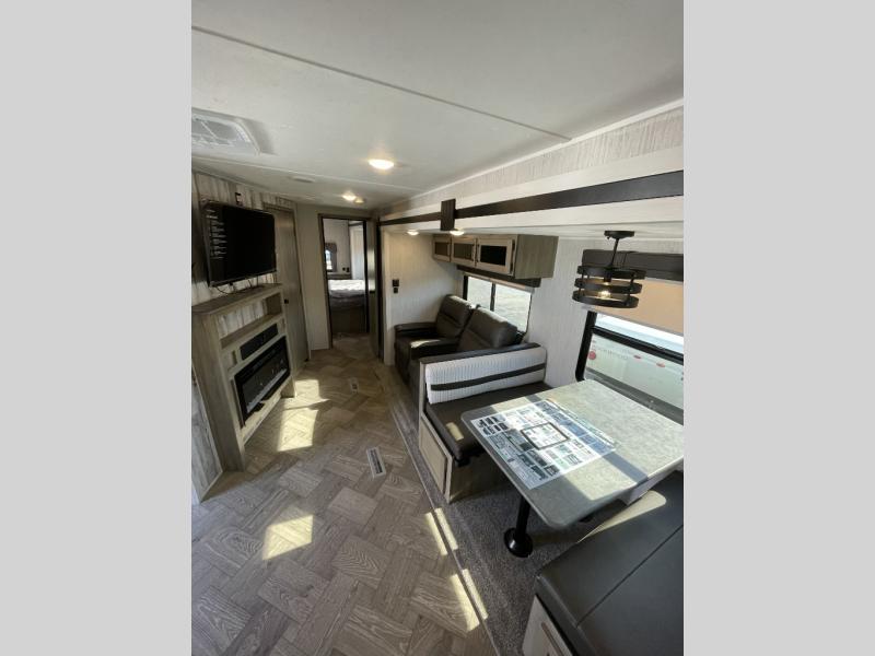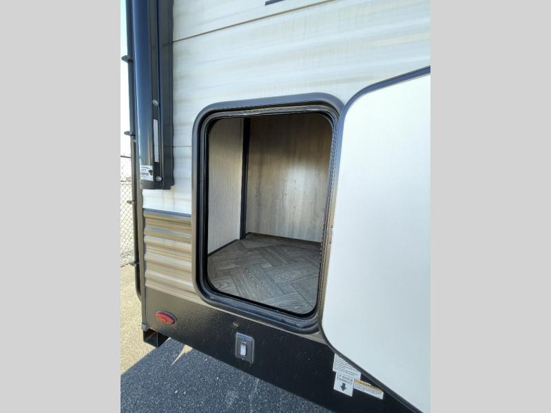 Walk into this travel trailer with one of the dual entry doors for a great camping trip! One entrance enters directly into the rear private bedroom which has a queen bed slide, a walk-in closet that is prepped for an optional washer and dryer, a wardrobe, and even an entrance into the dual entry bathroom. Grab a snack from the walk-in pantry then relax on the sofa while you watch a movie with the entertainment center or play a game at the booth dinette. The front kitchen has everything you will need to prepare your best home cooked meals including lots of countertop space, and you could even add an optional exterior micro kitchen with griddle for dinner outdoors!