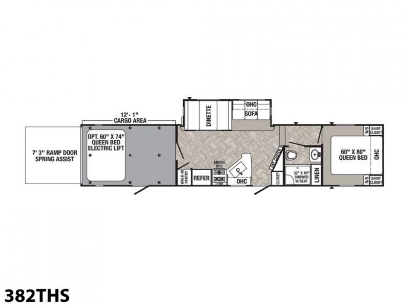 You can see and do it all in this spacious toy hauler with a 7' 3" spring-assist ramp door! Once your toys are unloaded from the separate garage, relax on the jack knife sofas, and you can add an optional queen bed electric lift if your guests plan to stay over. The main living area is inviting with its large slide out, booth dinette, and sofa, especially with the 39" LED TV. This model also includes a walk-in pantry everyone will love to grab snacks from! When you're ready to call it a night, clean up in the full bath before heading to the front private bedroom. Here, you'll enjoy a queen bed, dual nightstands, plus dual shirt closets to keep your clothes wrinkle-free!